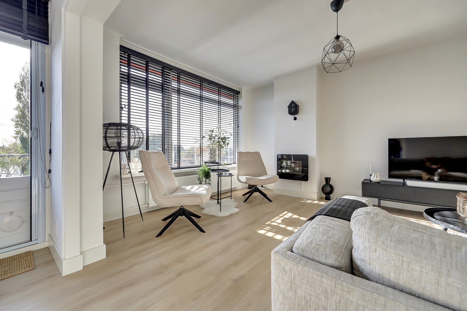 de royale, strakke en toch sfeervolle — aan de voorzijde gelegen — woonkamer (ca. 29 m², met laminaatvloer, zonwering, glad gestuukte wanden en toegang tot het zonnige, op het zuiden gesitueerde balkon van 4 m²),