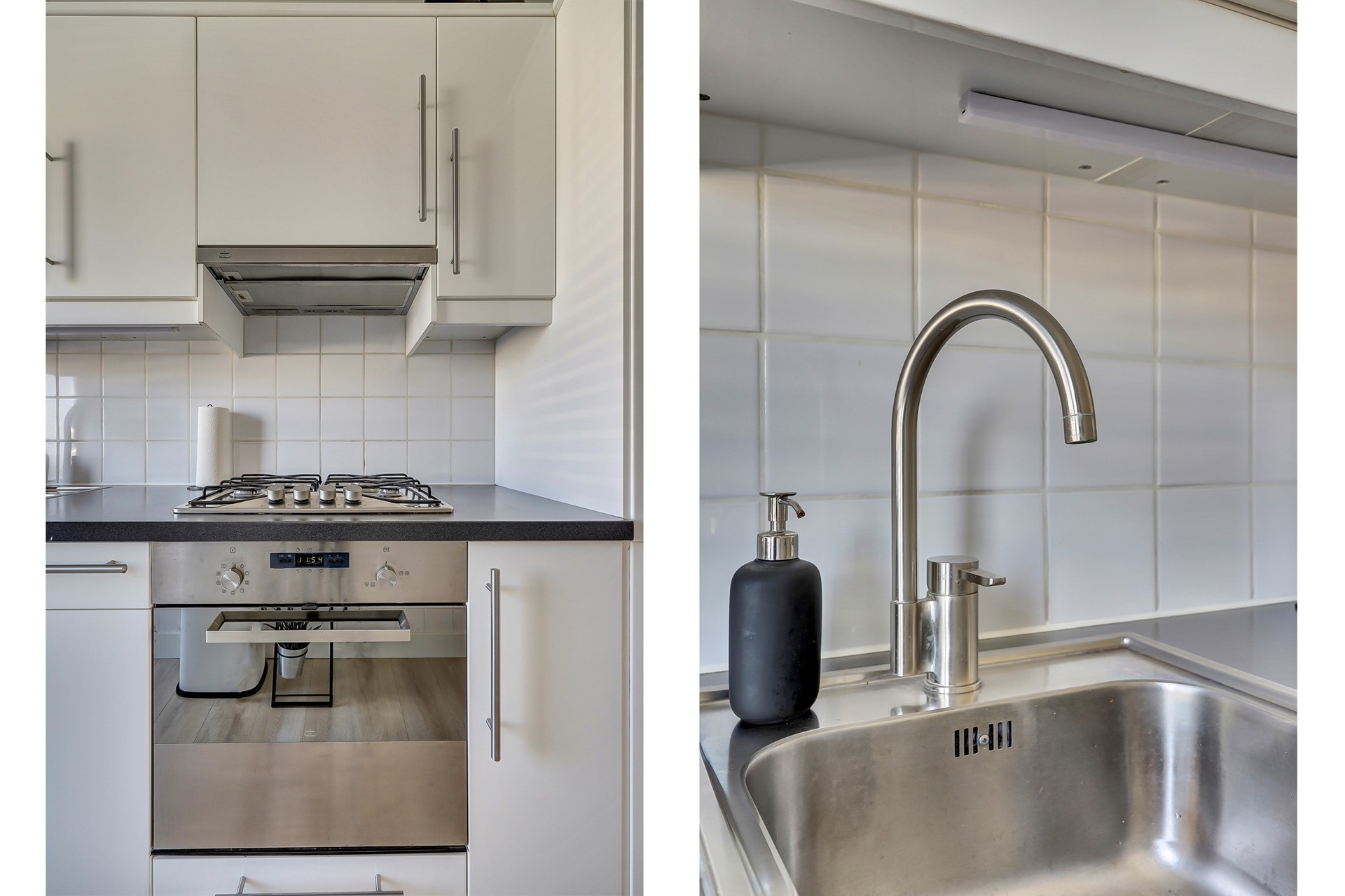 de keuken (6 m², met balkon van 4 m² en nette inbouwkeuken voorzien van een koelkast, vrieskast, gaskookplaat, afzuigkap en vaatwasmachine)