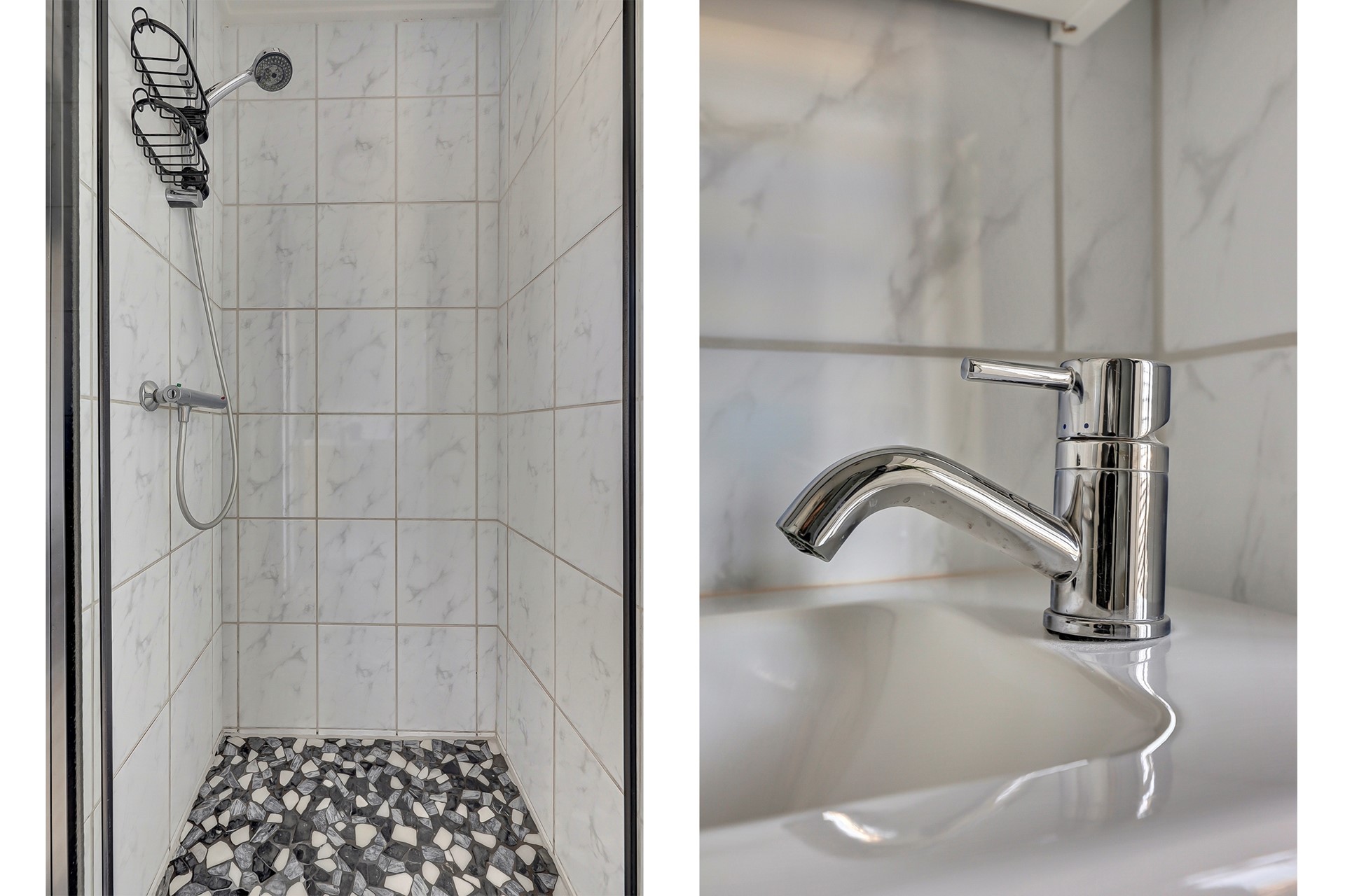 en de heerlijke slaapkamer van 14 m² met laminaatvloer, gestuukte wanden en toegang tot de badkamer (met douchegelegenheid en nieuw badkamermeubel met wastafel).