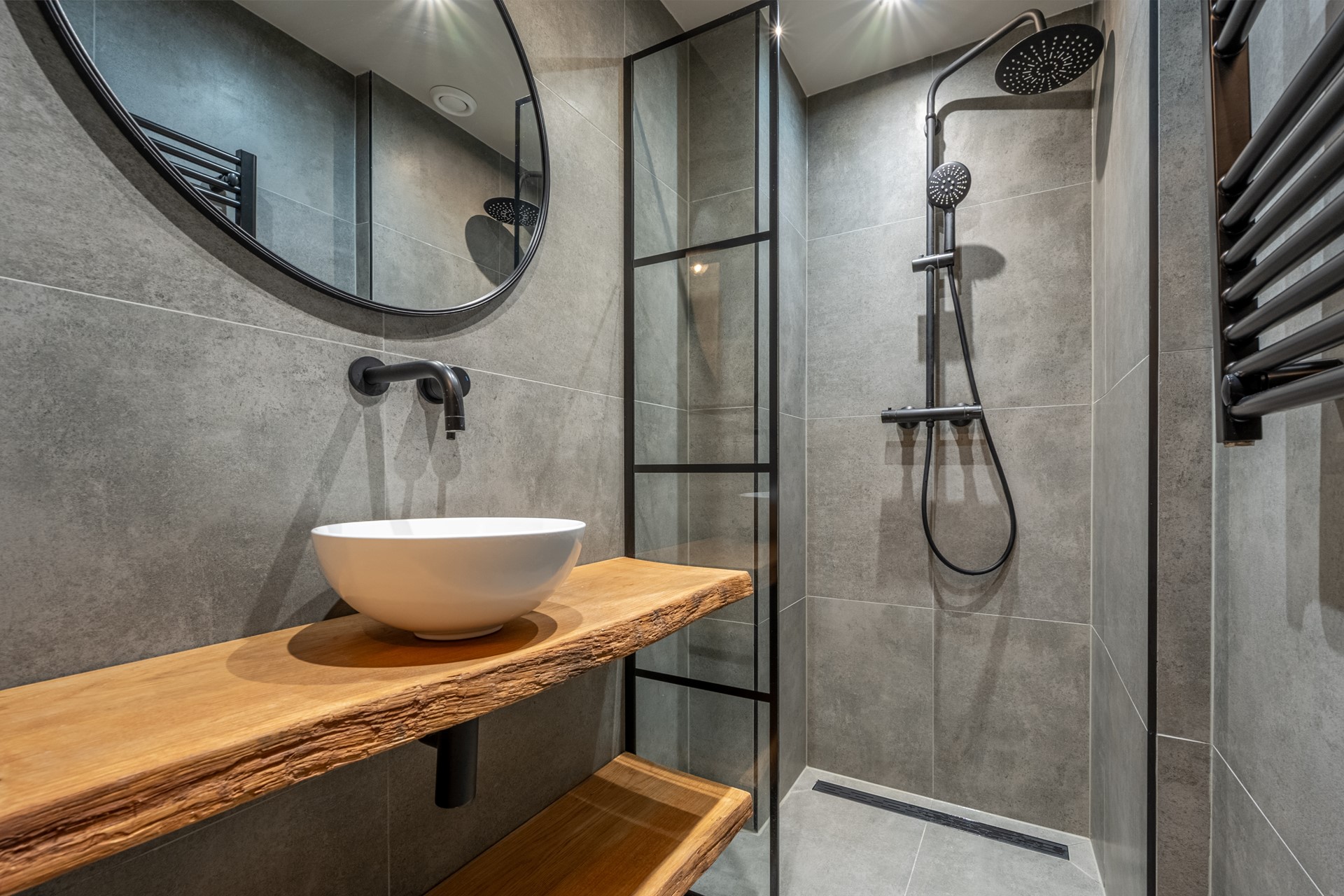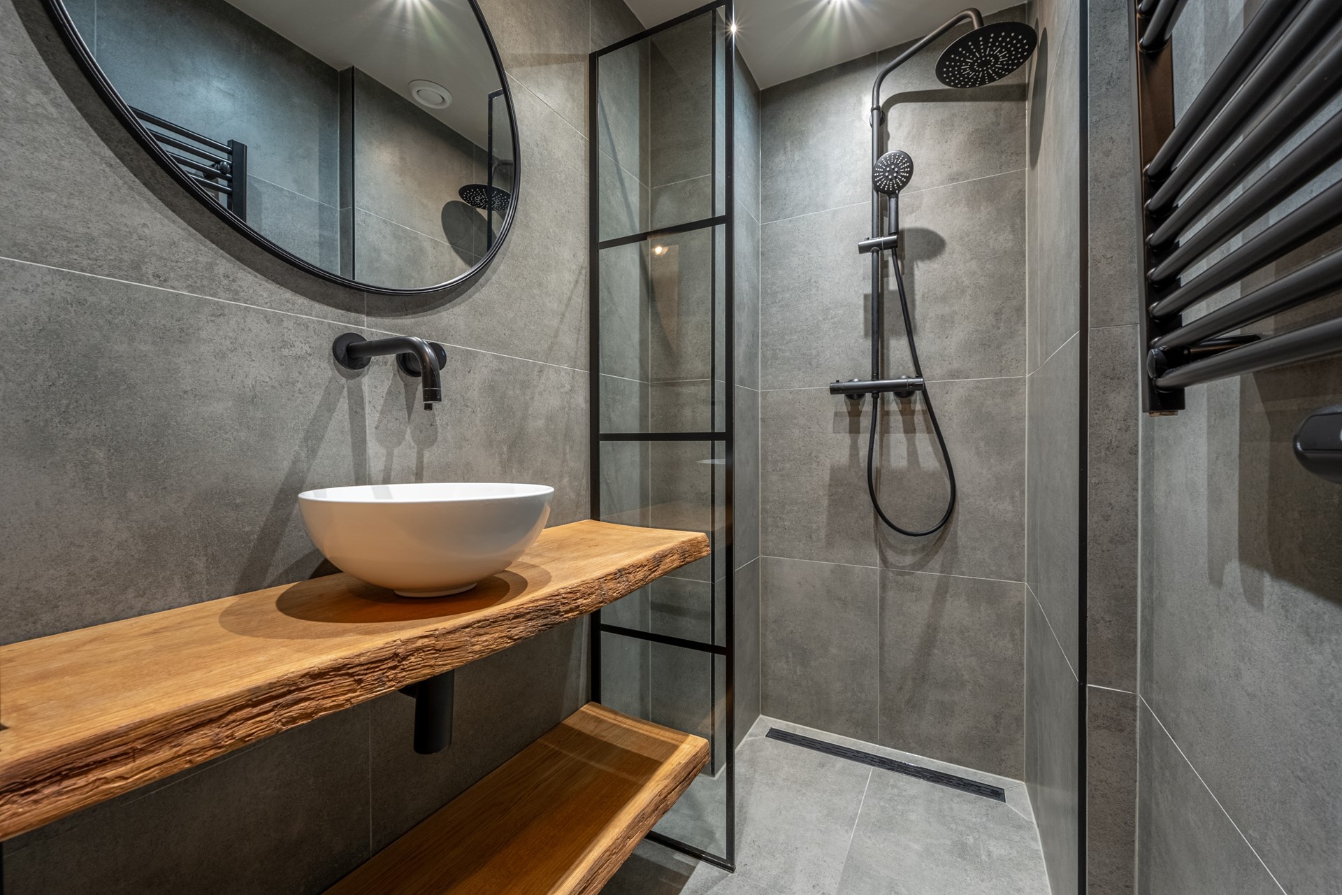 3. Stijlvolle badkamer met inloopdouche, matzwarte details en houtaccenten;