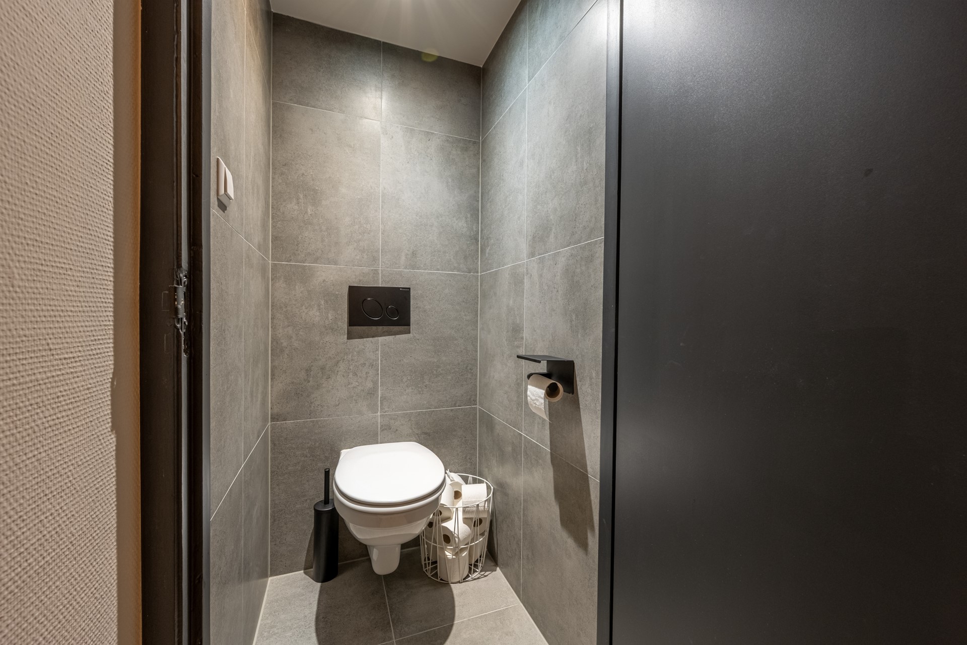 De badkamer is luxe, volledig betegeld en uitgevoerd in moderne tinten. Je vindt hier een inloopdouche met regendouche, een stijlvol wastafelmeubel met houten blad, zwarte kranen, inbouwspots en een handdoekradiator. Het separate toilet is eveneens modern afgewerkt.