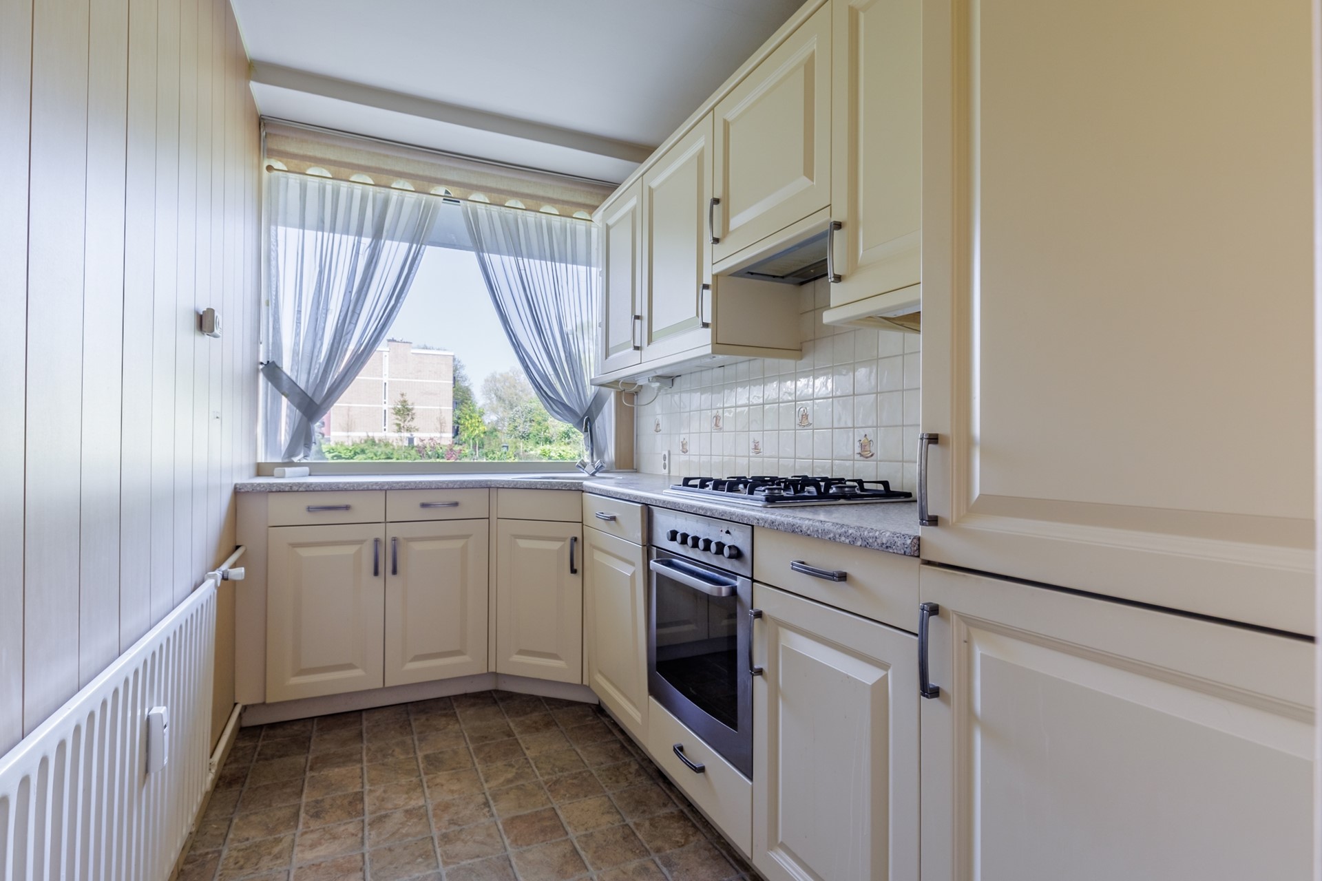 De keuken is separaat en op leeftijd, maar nog functioneel. Deze is in hoekopstelling en voorzien van een kunststof blad, 4 pits gaskookplaat, afzuigkap, oven, vaatwasser, koel/vriescombinatie.