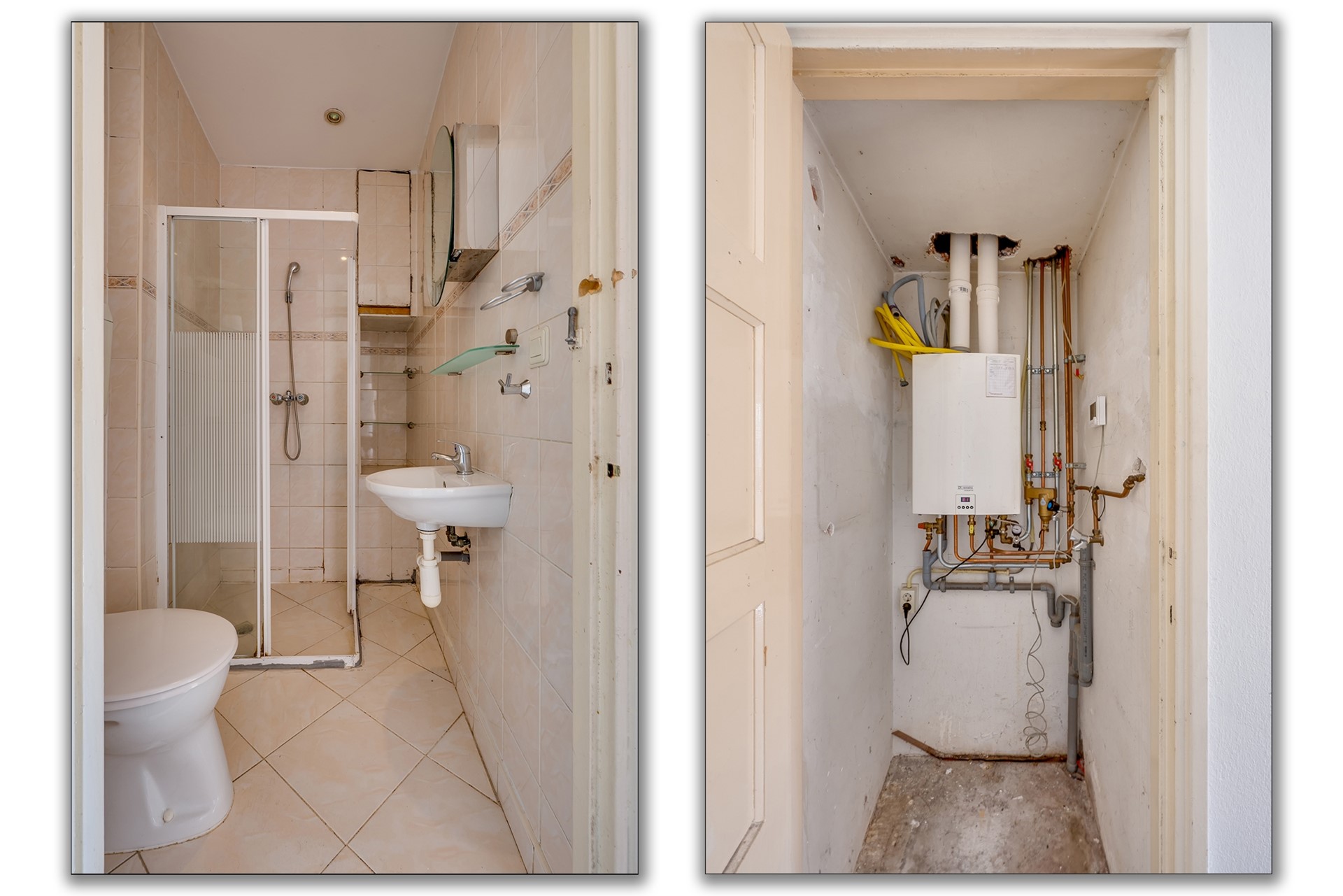 De badkamer beschikt over een douchecabine, toilet, wastafel en extra bergruimte compact maar functioneel, met mogelijkheden voor vernieuwing.