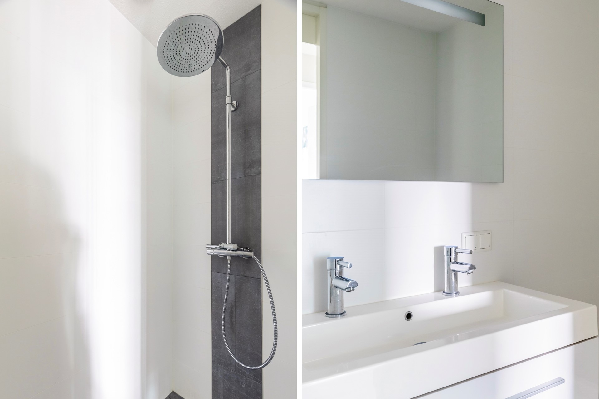 De badkamer is modern uitgevoerd en voorzien van een ruime inloopdouche, een wastafelmeubel en een designradiator. Daarnaast is er een separaat toilet en een praktische interne berging met aansluitingen voor wasmachine en droger.