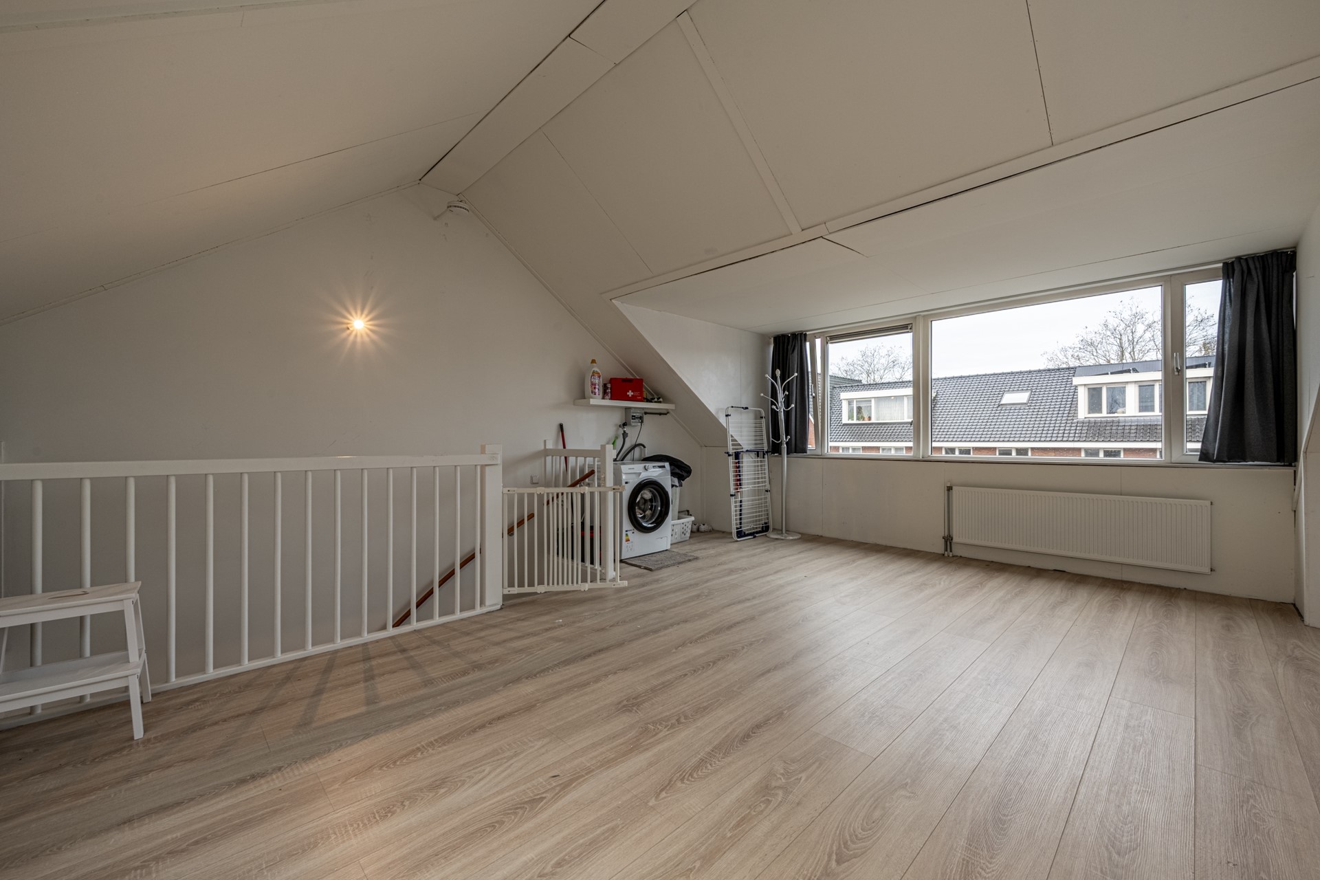 De tweede verdieping is een royale open zolder met kunststof dakkapel, waardoor je hier geniet van veel licht en extra ruimte. Deze verdieping kun je naar eigen wens indelen: een extra slaapkamer, thuiskantoor, hobbyruimte of walk-in closet, alles is mogelijk. De witgoedaansluitingen en ventilatie-unit zijn hier netjes weggewerkt.