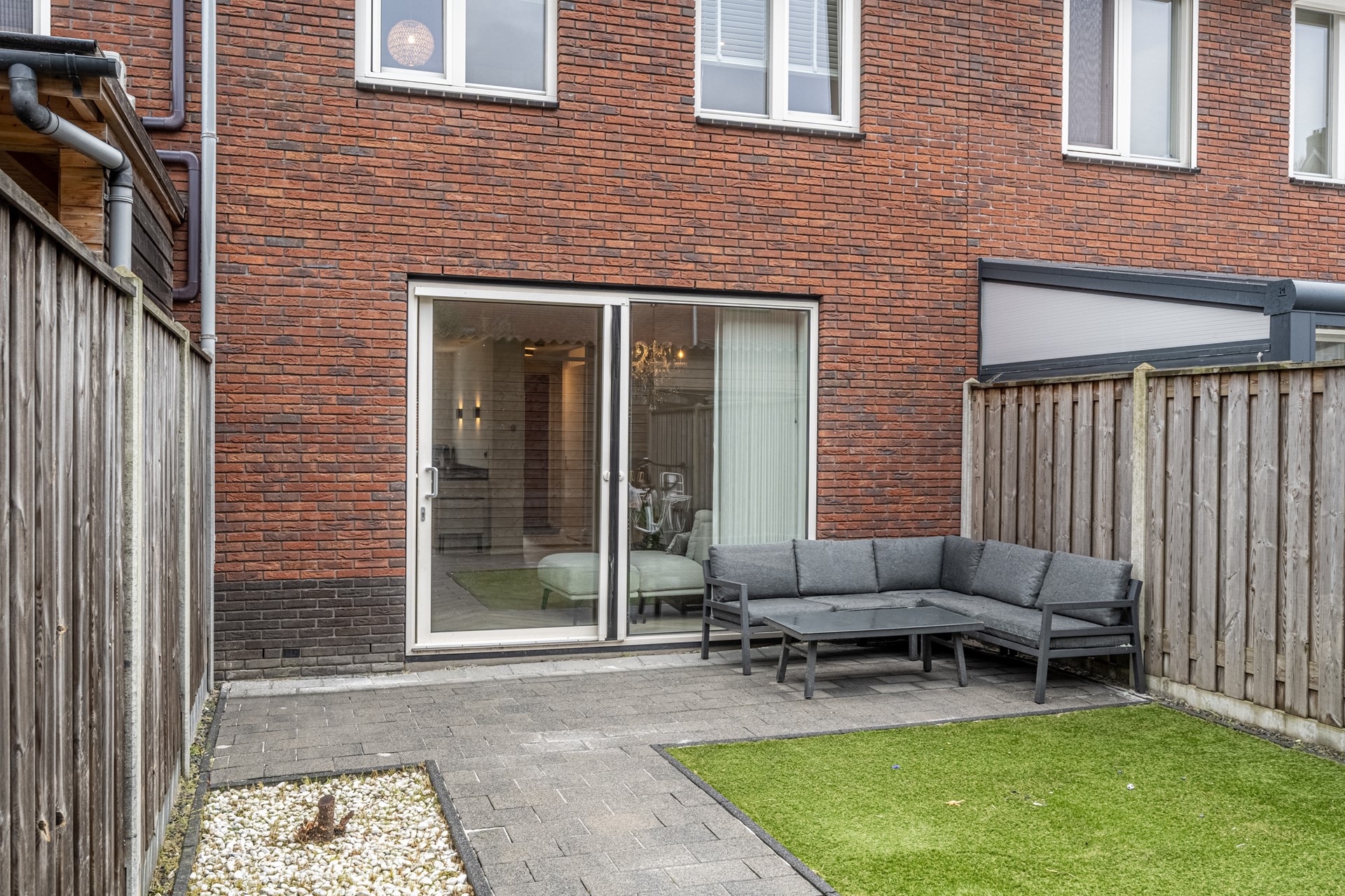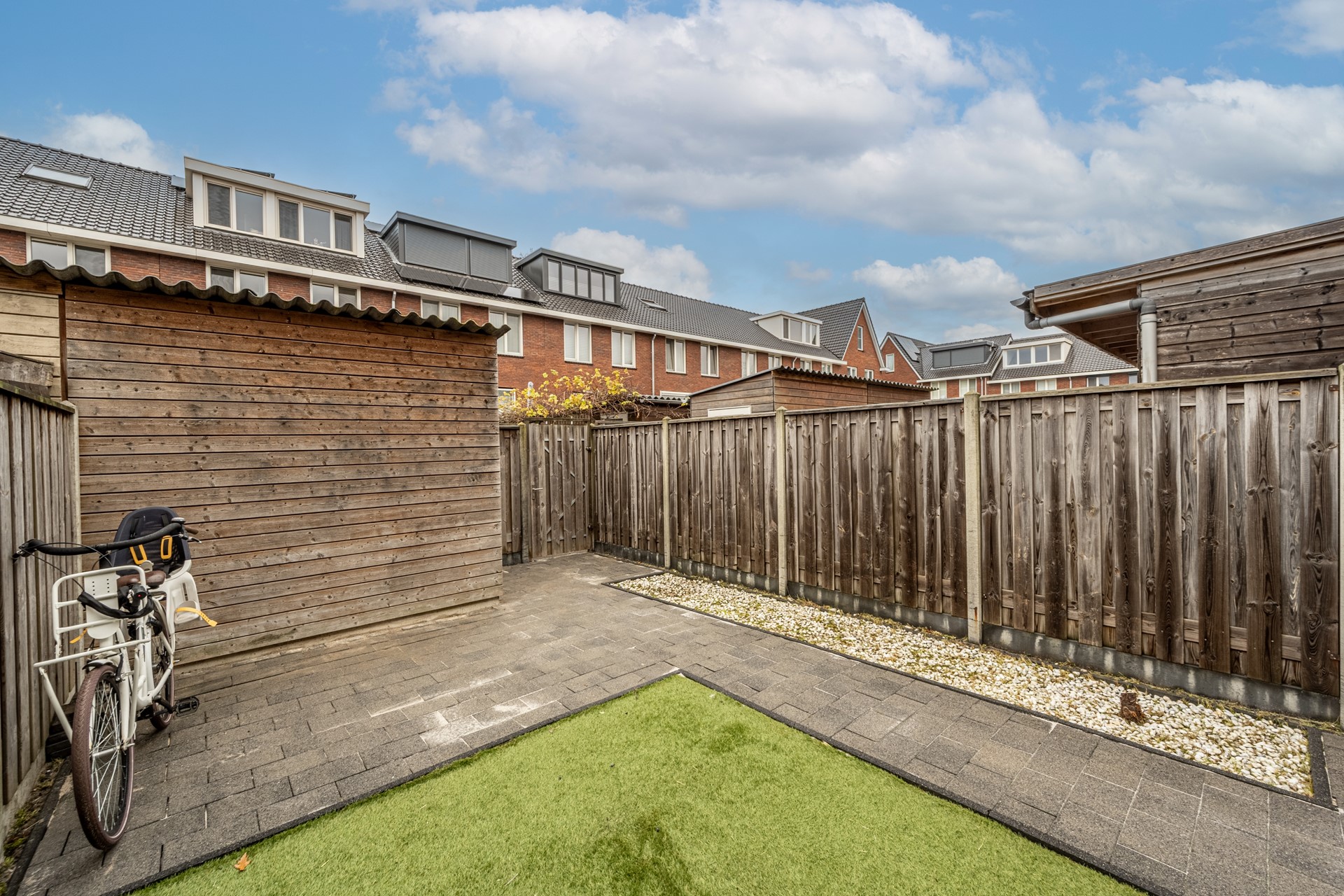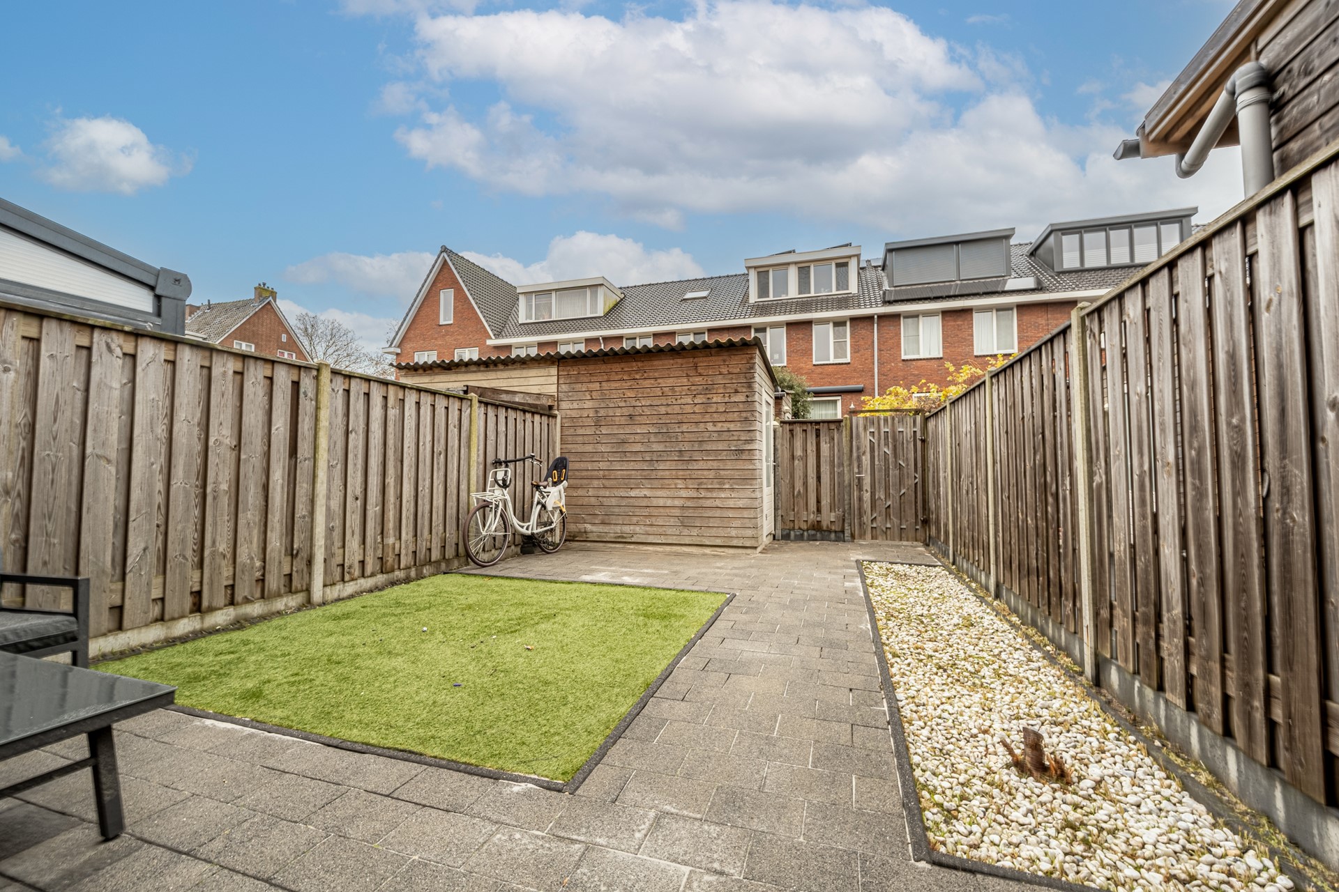 De achtertuin is onderhoudsvriendelijk aangelegd en vormt een heerlijke plek om buiten te zitten. Dankzij de brede schuifpui lopen binnen en buiten mooi in elkaar over. Achterin de tuin staat een houten berging, perfect voor fietsen en extra opslag.