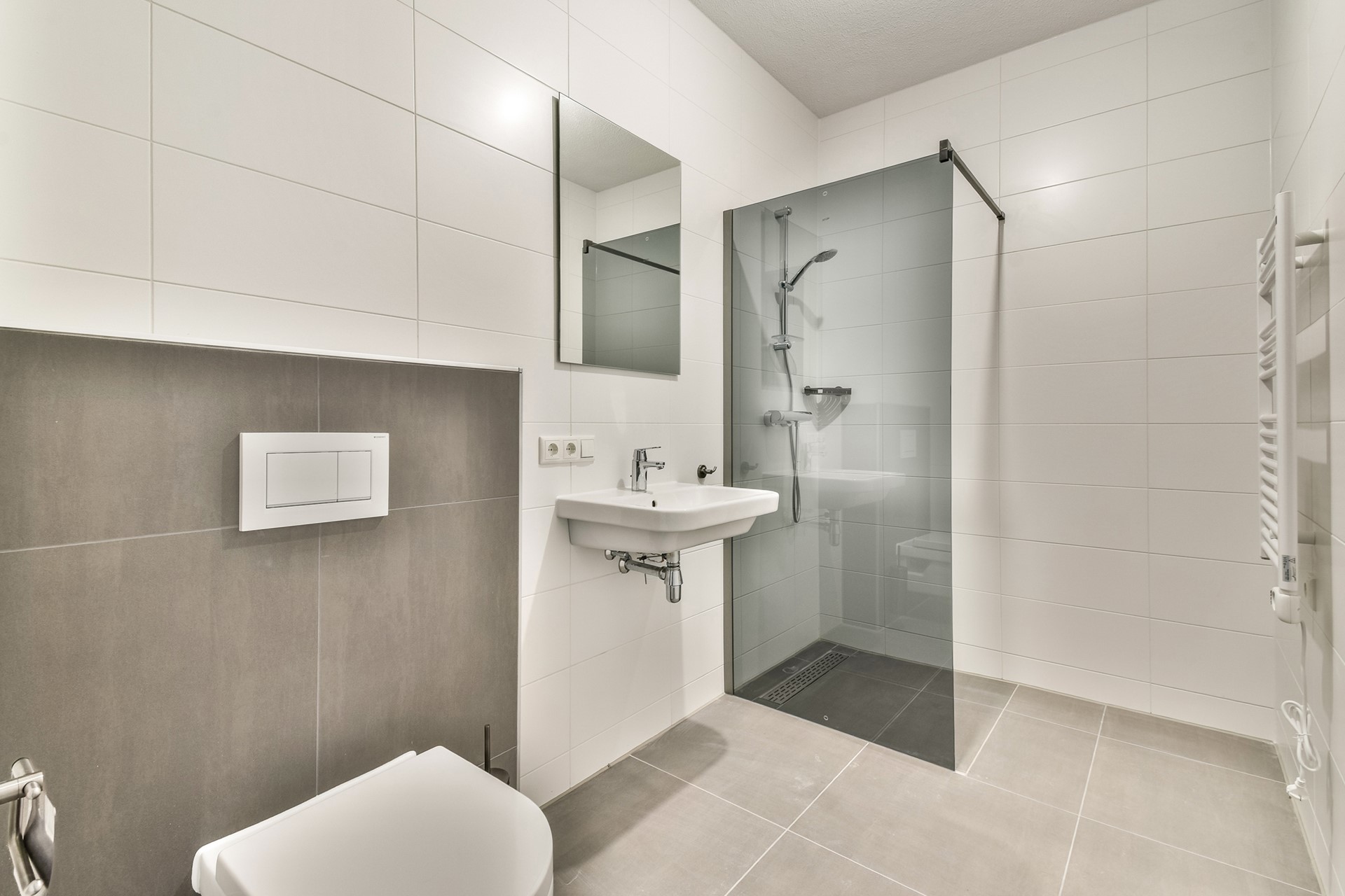 De nette badkamer is geheel betegeld en is luxe en fris afgewerkt met een ruime inloopdouche met glazen wand, een wastafelmeubel en modern sanitair. Alles is nieuw en klaar voor gebruik.