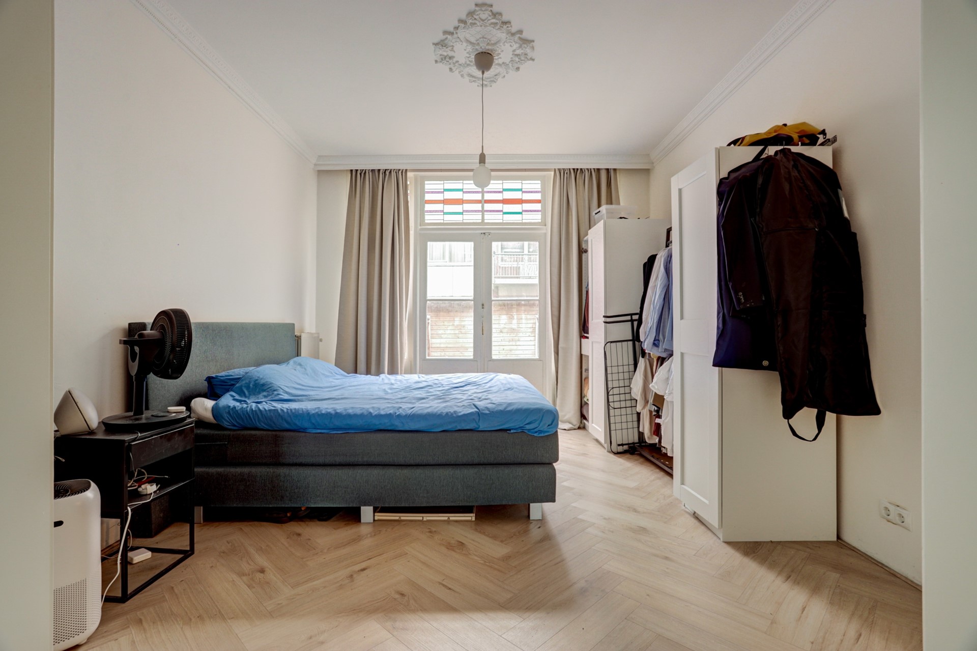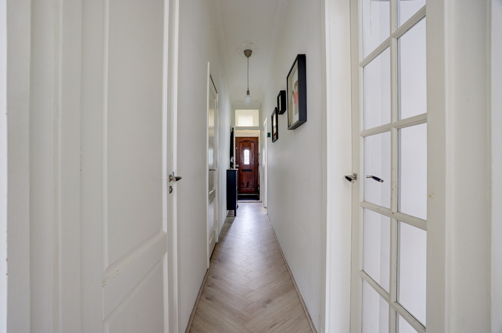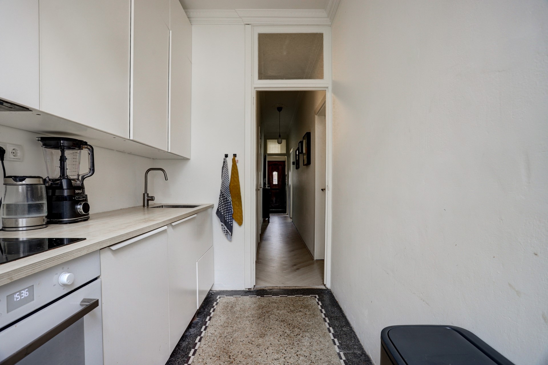 De indeling is als volgt: overdekte entree met de authentieke wandtegels en glas-in-loodraam, hal met trap naar de kelder (11.89 x 180 met tegelvloer en aansluitingen en afvoeren t.b.v. de wasapparatuur), fraai betegelde badkamer (204 x 083) met vloerverwarming, douchegelegenheid, toilet, wastafel en badkamerkastje), toegang tot de dichte keuken (335 x 194) met authentieke granitovloer, loopdeur naar de tuin en moderne inbouwkeuken, ruim voorzien van inbouwapparatuur (inductiekookplaat, afzuigkap, combioven, vaatwasmachine en koelkast). Vanuit de hal heeft u voorts toegang tot de aan de straatzijde gelegen ruime woonkamer (778 x 366) met erker (die de woning aan de buitenzijde ‘smoel’ geeft en aan de binnenzijde bijdraagt aan de hoge mate van lichtinval), ornamentenplafond, visgraat PVC vloer en ‘en-suite-deuren’ naar de aan de tuinzijde gelegen royale slaapkamer (485 x 366) met de originele marmerschouw en openslaande tuindeuren met glas-in-loodramen. De slaapkamer is eveneens vanuit de hal bereikbaar.