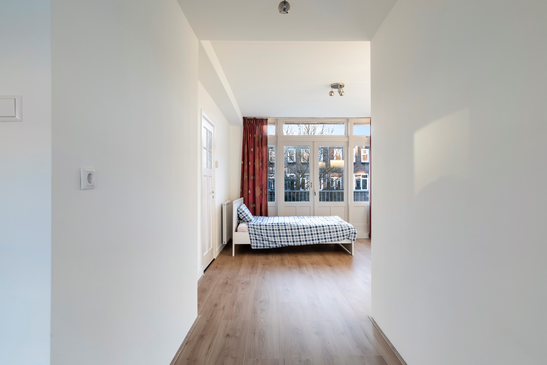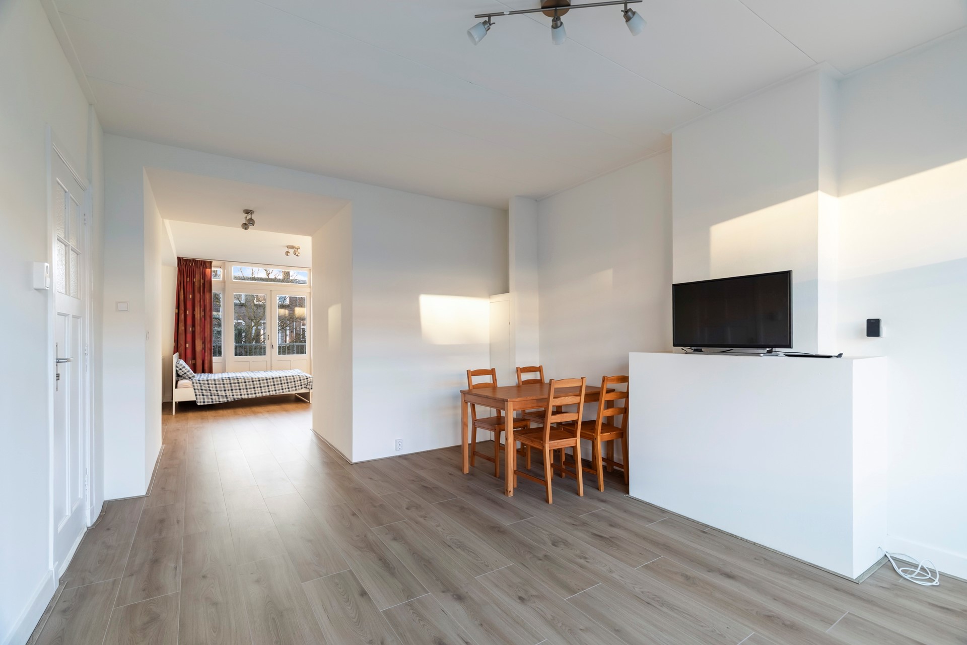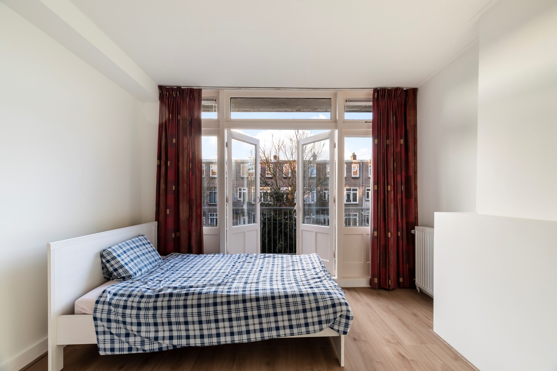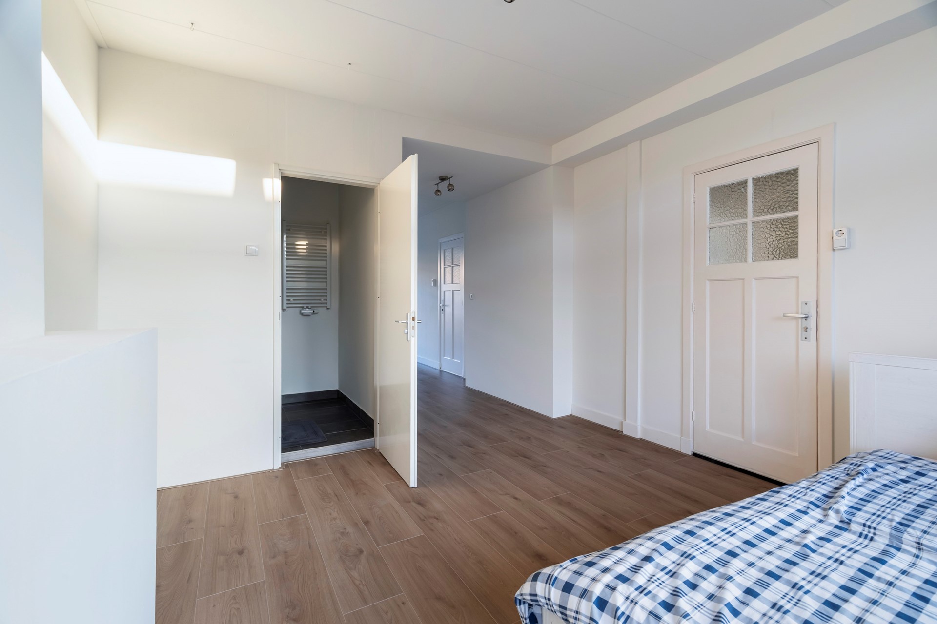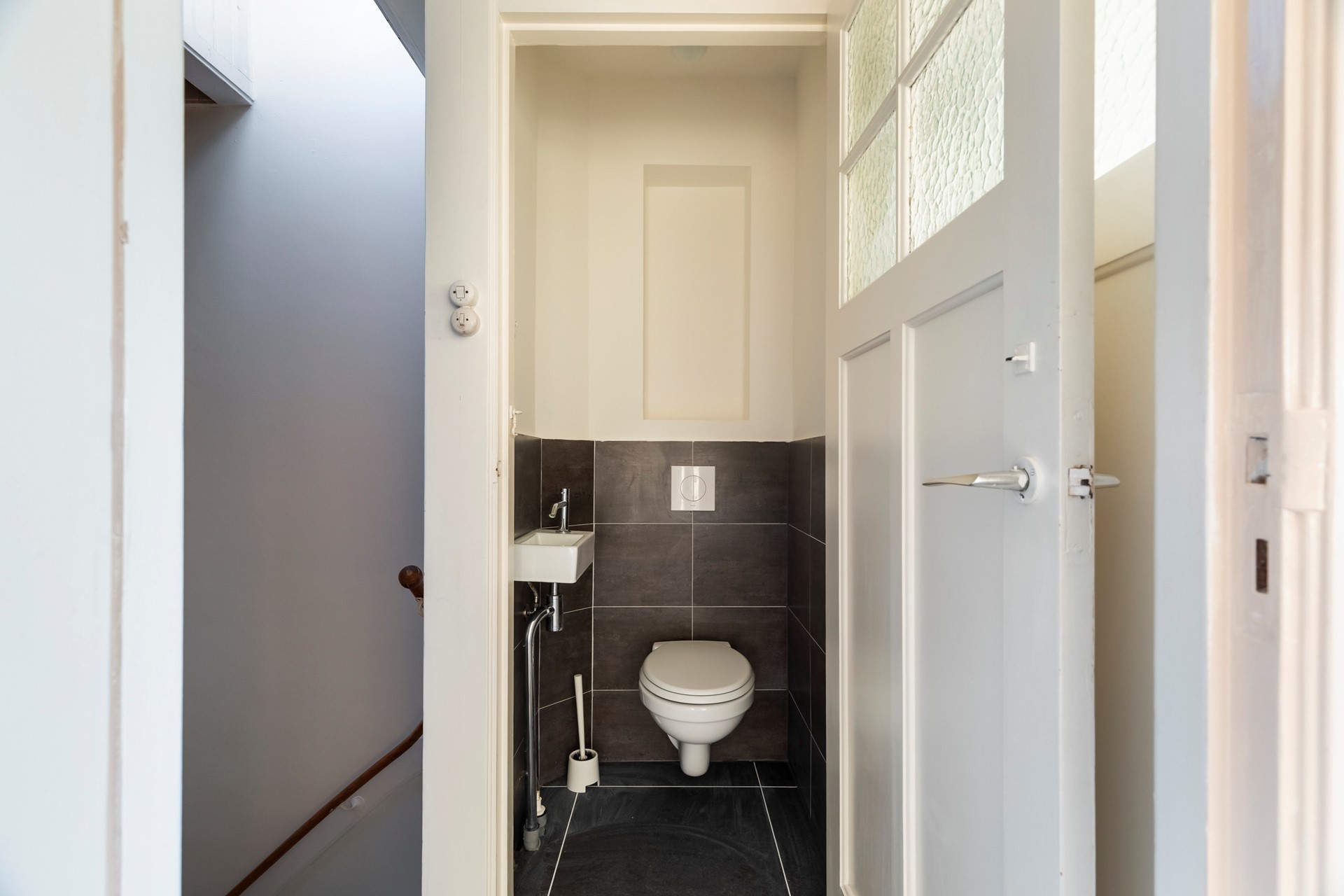 Modern en recent vernieuwd inbouwtoilet, afgewerkt met antracietkleurige tegels tot halverwege de wand en voorzien van een fontein. Strak en tijdloos uitgevoerd. Aan de voorzijde vind je een lichte, royale woonkamer met direct daaraan gekoppeld een aparte studieruimte. In de woonkamer zorgen de kunststof kozijnen en de slimme decibel reducerende ventilatiesleuven ervoor dat je binnen zit te genieten zonder te worden gestoord door het verkeer. Aan de achterzijde wacht de indrukwekkende masterslaapkamer met houten openslaande deuren naar het op het zuidwesten gelegen balkon. Je bent hier verzekerd van privacy en rust: het balkon kijkt uit over de achtergelegen tuinen en biedt volop ruimte voor lange zomeravonden buiten. De ensuite badkamer (ook vernieuwd in 2016) is v.v. mechanische ventilatie, een wastafel, handdoekenradiator en inloopdouche. Alles is netjes en modern betegeld.