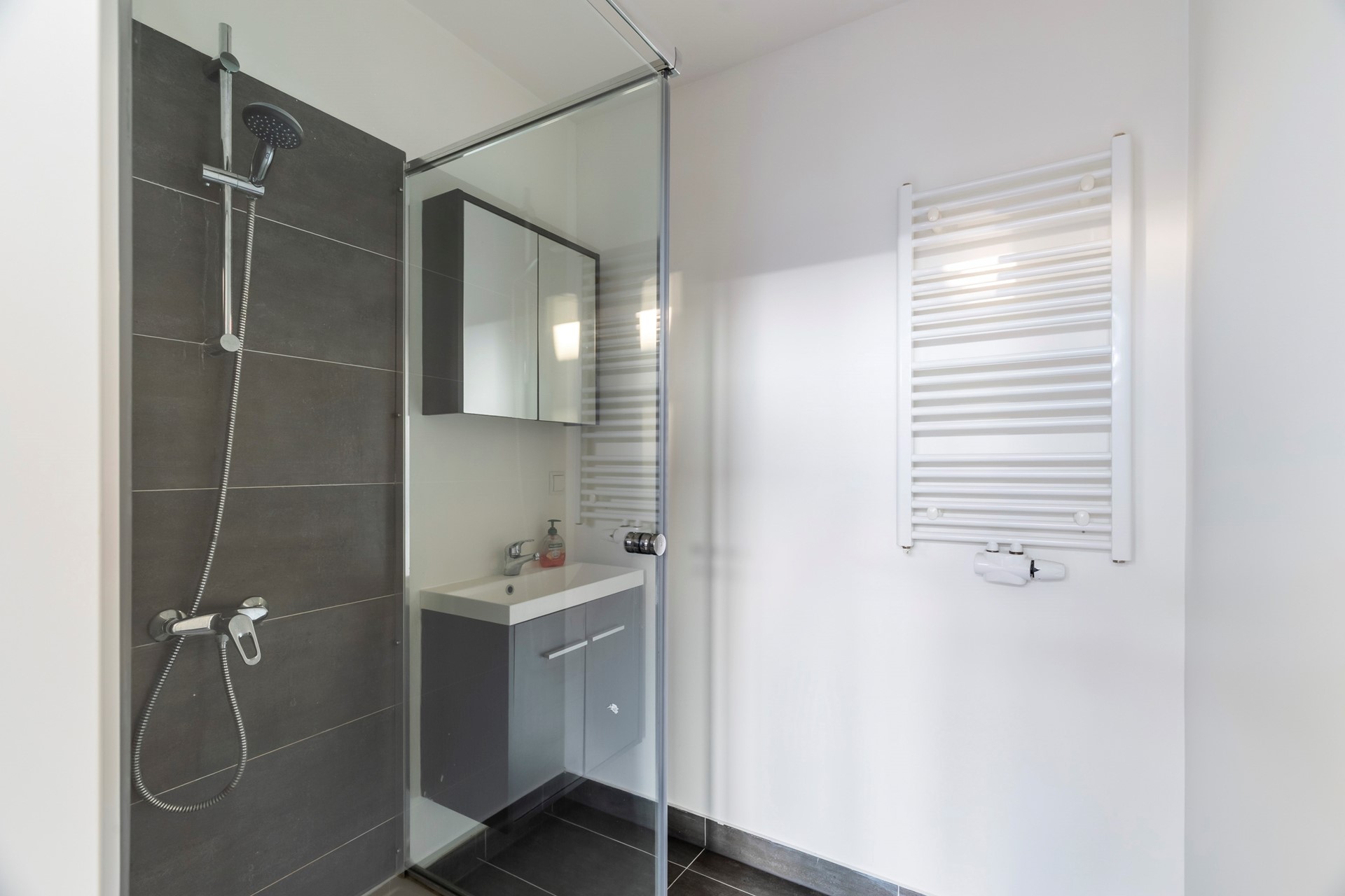 De badkamer op deze verdieping is direct toegankelijk vanuit de woonkamer en praktisch ingericht. Ook deze ruimte is afgewerkt met antracietkleurige tegels en beschikt over een douche. Het witte wastafelmeubel met spiegelkast zorgt voor een frisse uitstraling. Tevens is hier een wasmachine aanwezig (blijft achter), waardoor deze verdieping volledig zelfstandig te gebruiken is.
