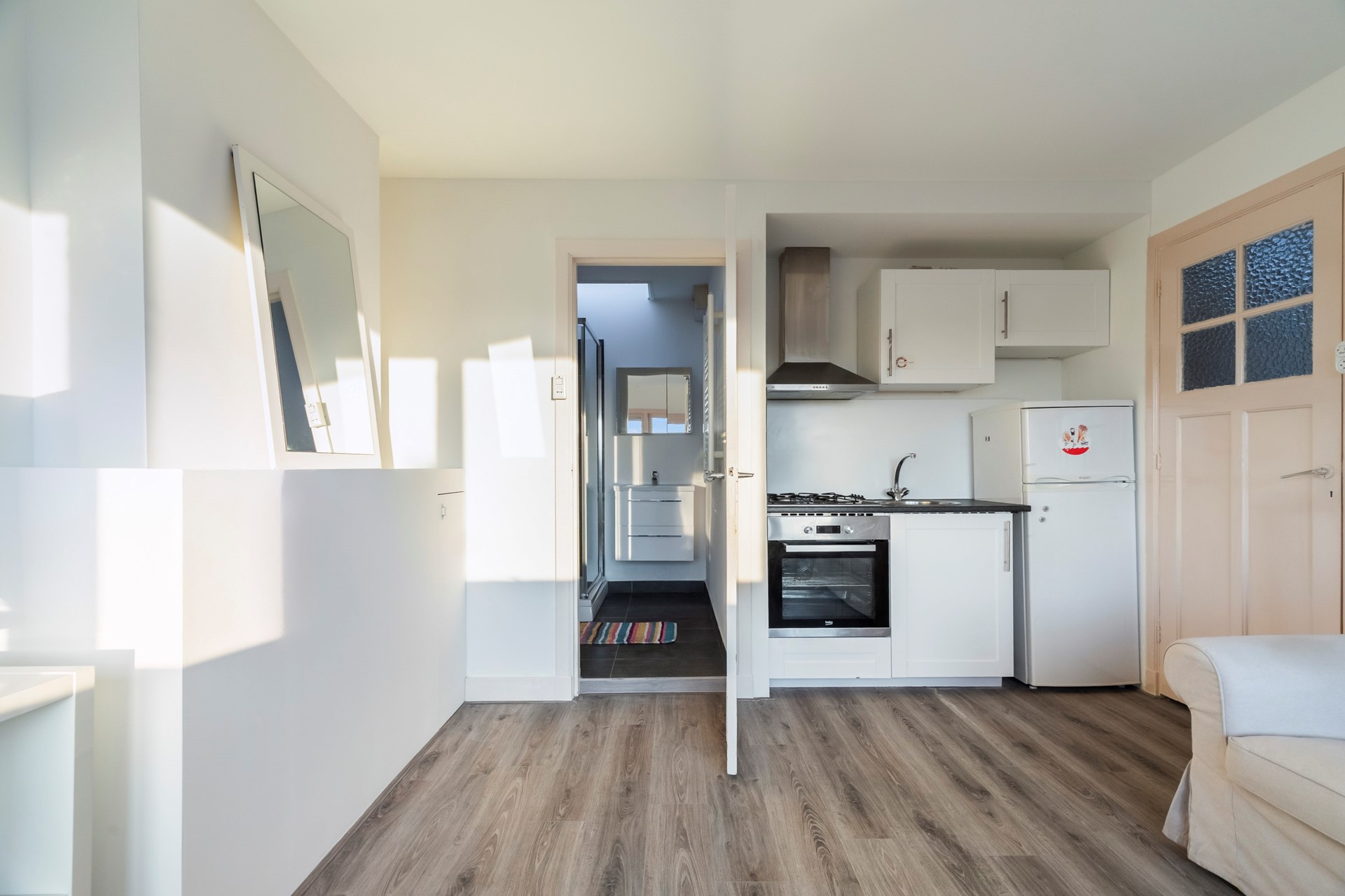 Terug in de hal gaan we via de gerenoveerde trap (geverfd en v.v. antisliptreden) naar de 4e verdieping. Bovenaan de trap is het natuurlijk licht dankzij een dakraam. Deze bovenste etage maakt dit appartement echt uniek. Je treft hier een volledig zelfstandige ruimte met een eigen keuken en badkamer. Dit maakt het pand perfect geschikt om te delen – met vrienden, familie, een au pair – of bijvoorbeeld als zelfstandige werkplek of studio, B&B, studiemaatjes, alles is mogelijk.
