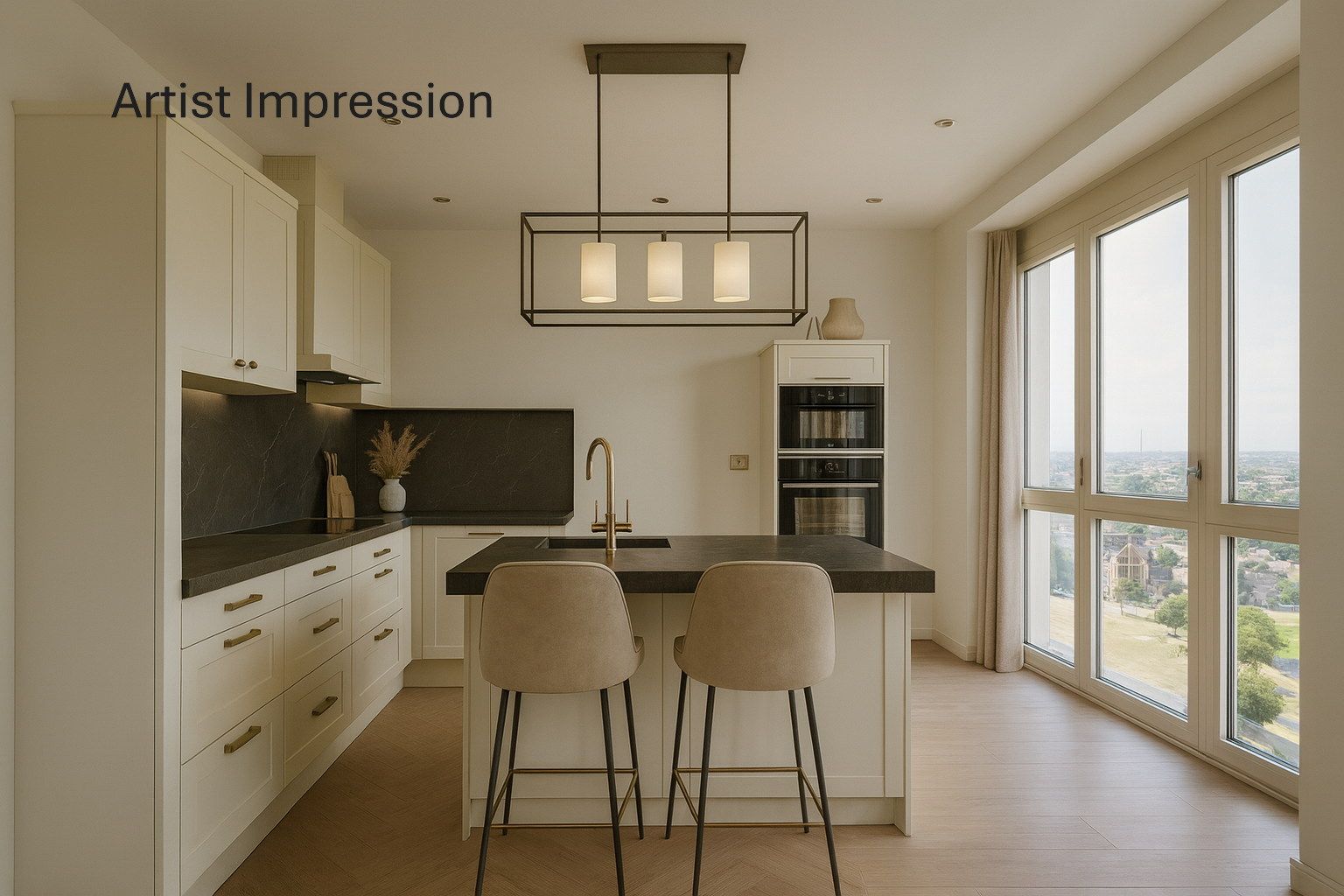 Op de 14e verdieping stap je binnen in de hal met het toilet, meterkast en toegang tot alle vertrekken. De woonkamer is heerlijk licht dankzij de grote raampartijen over twee zijden – het uitzicht is hier werkelijk spectaculair! De open keuken met bar is strak afgewerkt en voorzien van diverse inbouwapparatuur zoals een vaatwasser, inductiekookplaat, afzuigkap, koelkast, vriezer, oven en magnetron.
