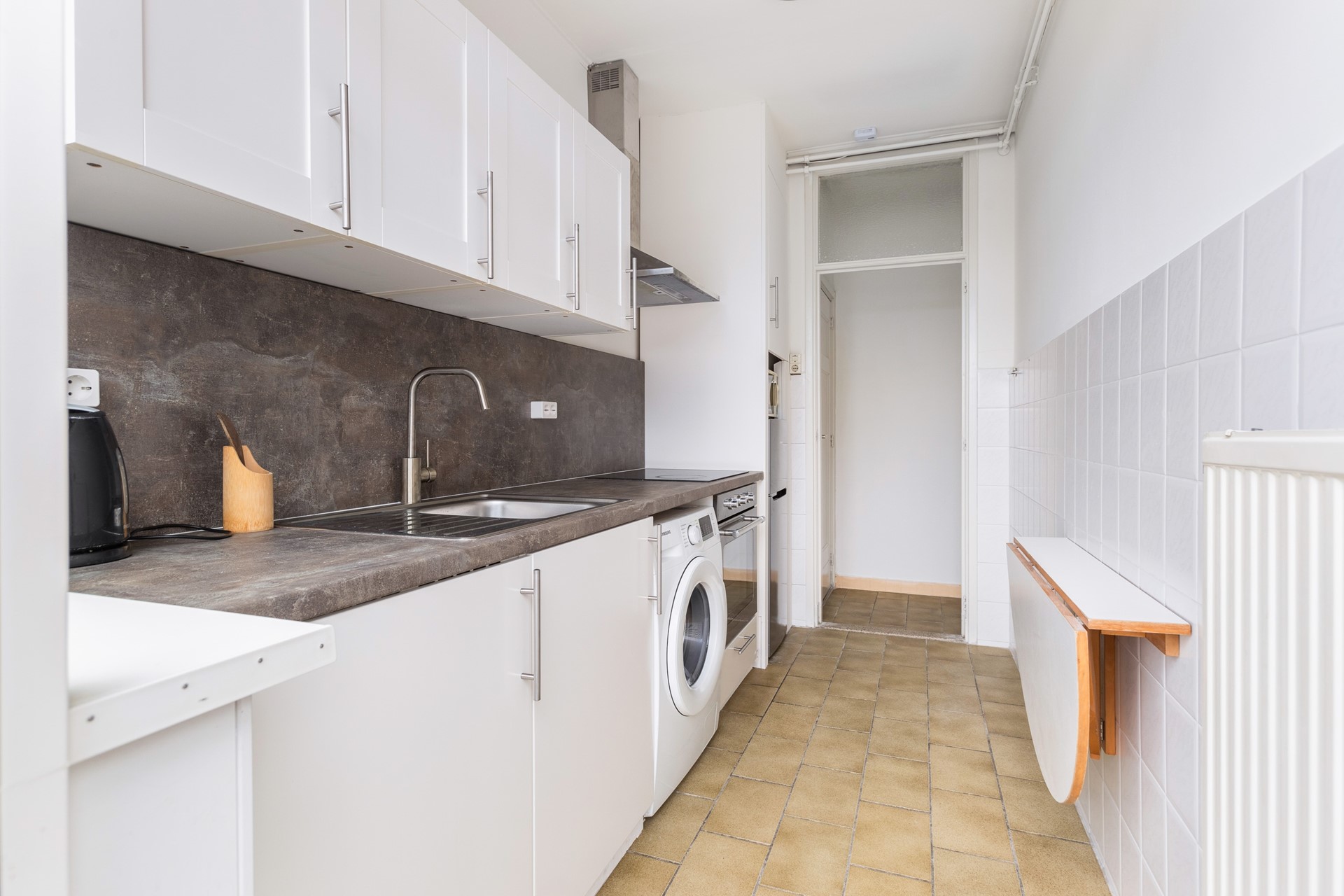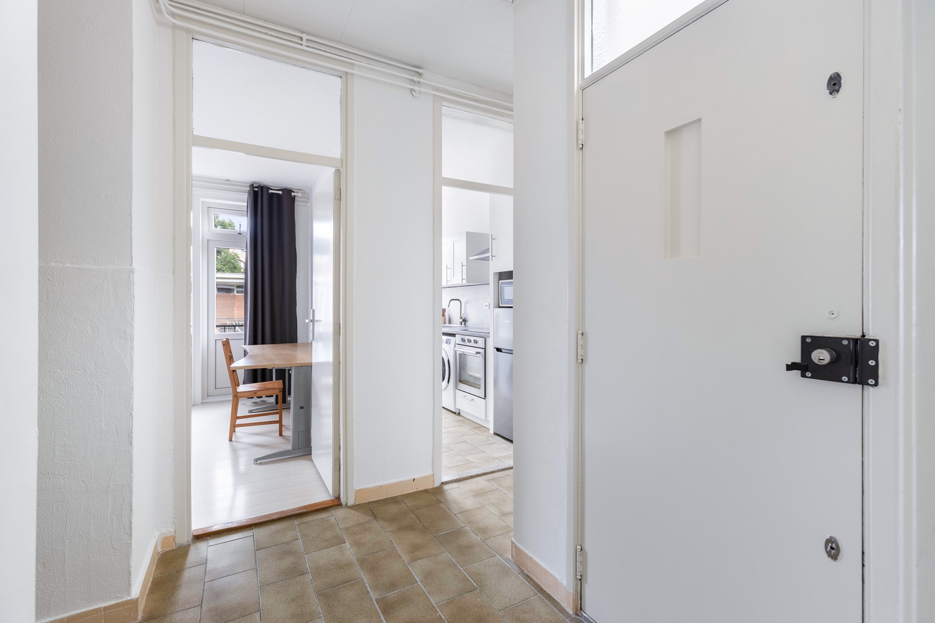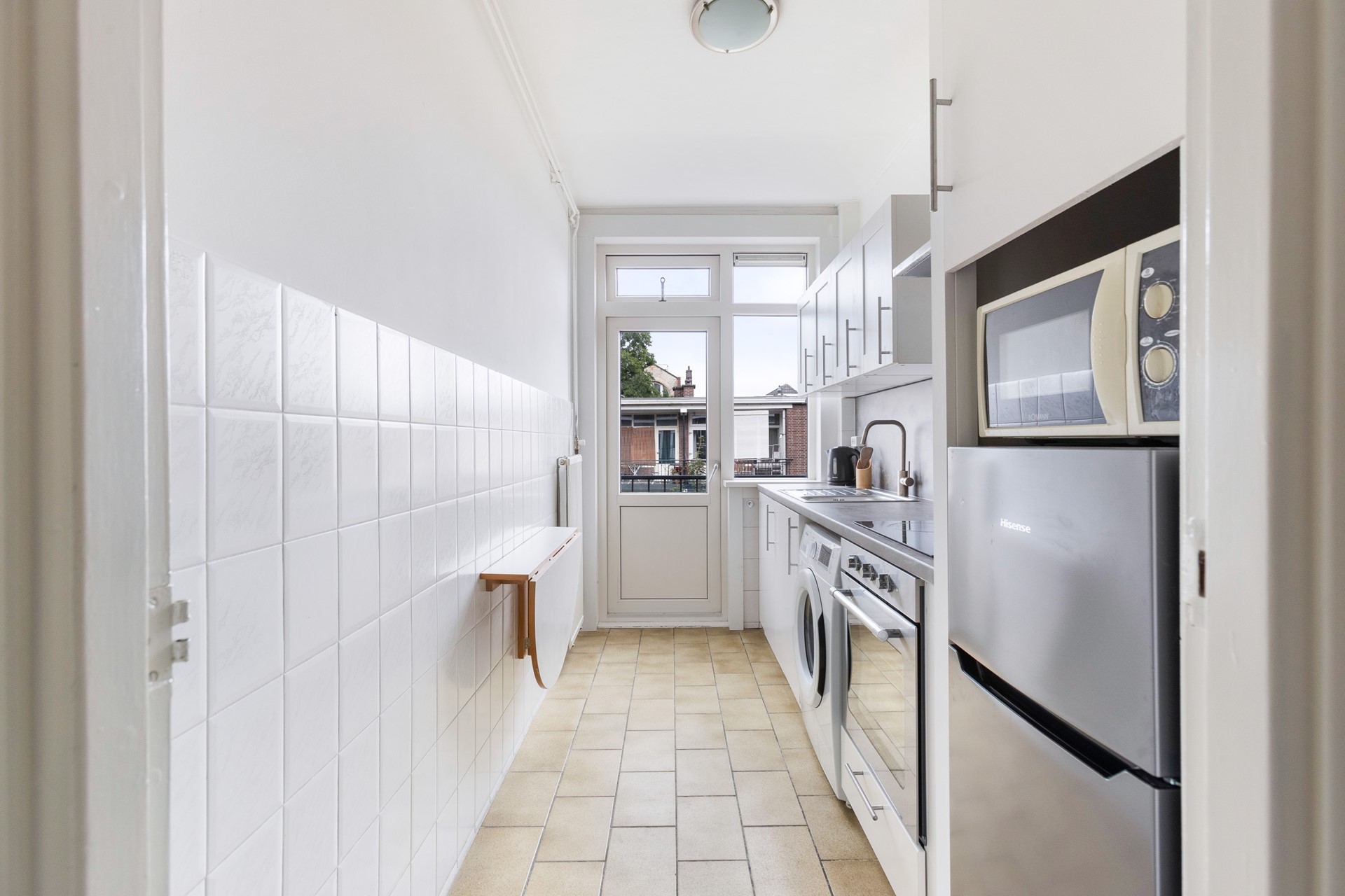 Entree met toegang tot alle vertrekken. De ruime woonkamer met 2 inbouwkasten en originele schouw is gelegen aan de voorzijde. Door de grote raampartijen komt er veel licht de woning binnen. Via de woonkamer is de 1e slaapkamer te bereiken. Deze kamer is goed te gebruiken als kasten kamer of home office. De "master bedroom" is gelegen aan de achterzijde en is erg ruim te noemen. De kamer biedt voldoende ruimte voor een royaal bed en een kast. Tevens biedt deze kamer toegang tot het balkon op het westen, hier kan heerlijk van de avondzon genoten worden. De keuken beschikt over diverse inbouwapparatuur zoals een 4-pits elektrische kookplaat, koel-/vriescombinatie, wasmachine (blijft achter) en voldoende opbergruimte. Ook de keuken geeft toegang tot het balkon. De volledig betegelde badkamer beschikt over een toilet, inbouwkast, inloopdouche, en wastafel.