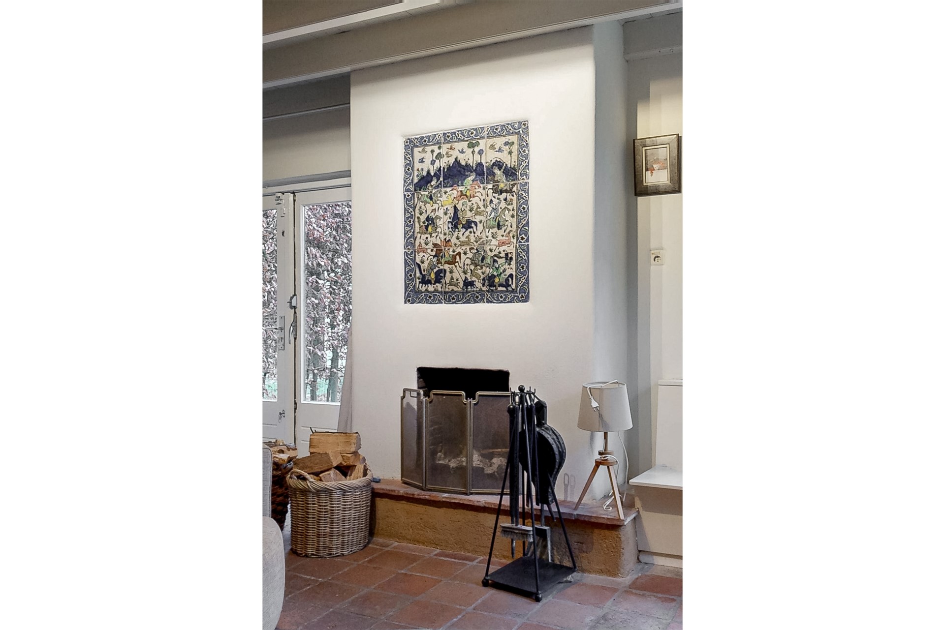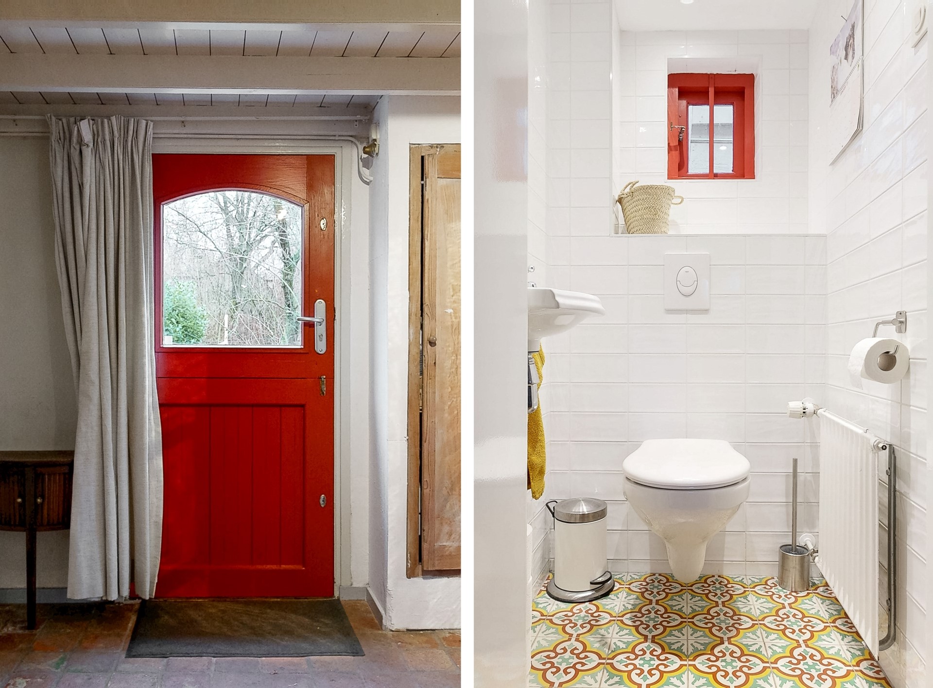 De entree bevindt zich aan de rechterzijde van de woning. Via de deelbare voordeur betreed je de ontvangsthal, waar Franse plavuizen, de schouw, het balkenplafond en de elegante bordestrap direct de toon zetten. Dit is zo’n ruimte waar je bij binnenkomst al voelt dat het huis een verhaal heeft. In de hal bevinden zich de meterkast, trapkast en de toiletruimte van 2020, waarvan de laatste bijzonder sfeervol is uitgevoerd met Portugese vloertegels, metrotegels op de wand, een wandcloset, radiator en een nostalgisch fonteintje. Vanuit de hal zijn zowel de voorkamer als het woongedeelte bereikbaar.
