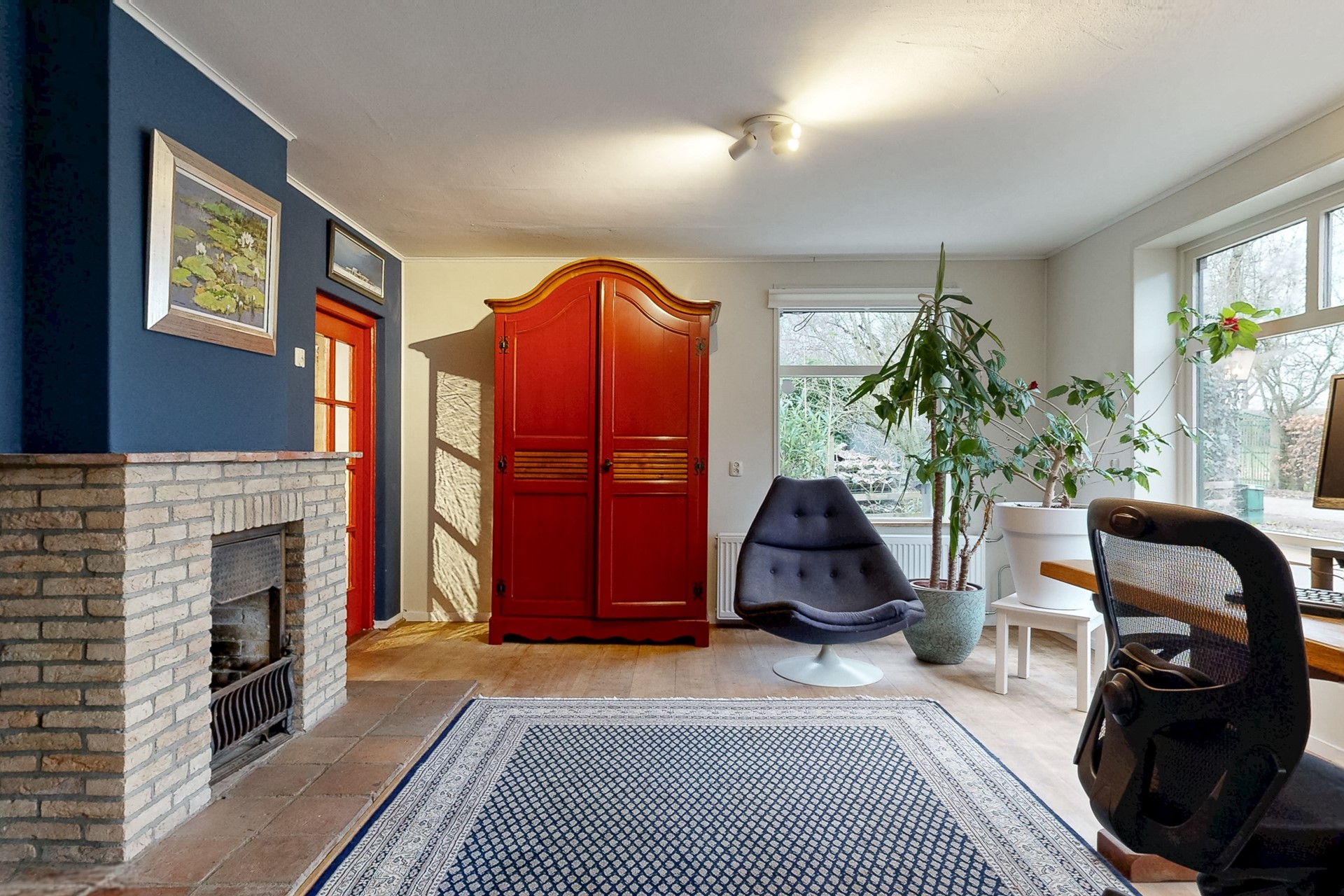 Een paneeldeur met glas en roedeverdeling leidt naar de ruime voorkamer met parketvloer en glad stucwerk op wanden en plafond. De grote ramen in de voor- en zijgevel zorgen voor een prettige verbondenheid met de landelijke omgeving. Blikvanger is de schouw met open haard. Deze kamer is veelzijdig te gebruiken, denk aan een slaapkamer, speelkamer of kantoor- c.q. praktijkruimte. Voor het laatstgenoemde gebruik is het ideaal dat deze kamer direct naast de entree ligt, zodat je cliënten direct naar deze kamer kunt begeleiden zonder je woonvertrekken aan te doen.