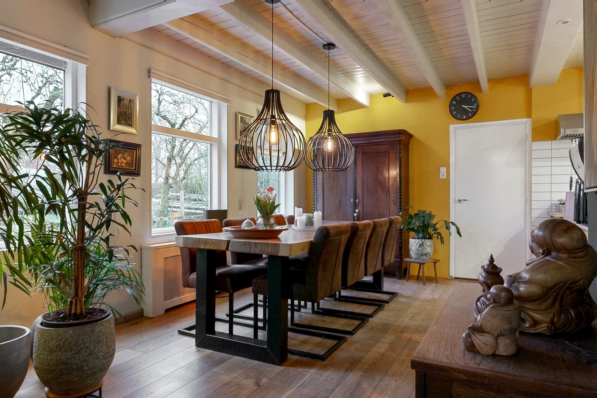 De eetkamer staat in open verbinding met de keuken en biedt - ter hoogte van de 3 fraai gepositioneerde ramen in de zijgevel – ruimte om een royale eettafel te plaatsen. Dit is dé plek waar lange diners en goede gesprekken vanzelf ontstaan, met uitzicht op de groene omgeving en de voederplaats, waar pimpelmezen, roodborstjes en koolmezen trouwe bezoekers zijn.