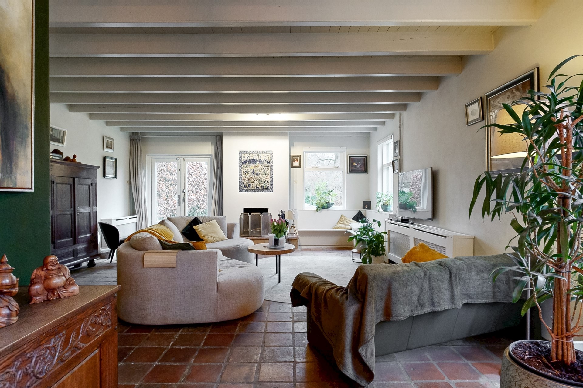 Loop door naar de heerlijke living: een royaal woonvertrek met estriken op de vloer, glad gestucte wanden en een balkenplafond - een perfect uitgangspunt voor een stijlvolle inrichting. De maatwerk klepbank bij de ramen in de hoek van de gevel vormt een inspirerende vaste zitplek met uitzicht op de tuin. De schouw met open haard, het koperen vonkenscherm en het ingelegde tegeltableau uit circa 1850 zorgen voor een warme, nostalgische sfeer. Zie je jezelf al zitten, mijmerend bij het houtvuur met een goed glas wijn? Tenslotte bieden de openslaande deuren een dynamische verbinding met het terras en de achtertuin.