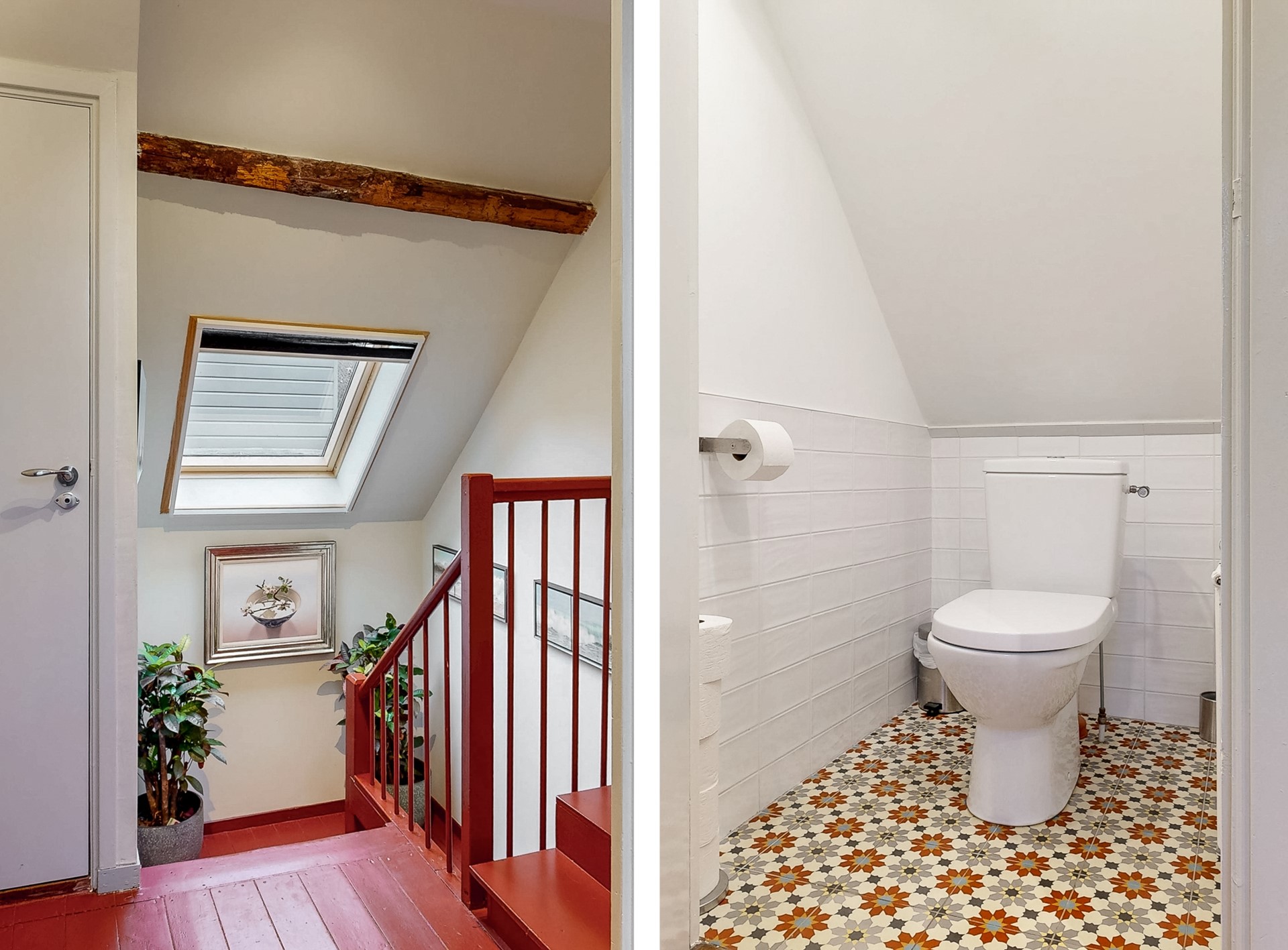 Direct naast de trapopgang bevindt zich de toiletruimte, die net als beneden ook in 2020 is geïnstalleerd en voorzien is van dezelfde fraaie betegeling.
