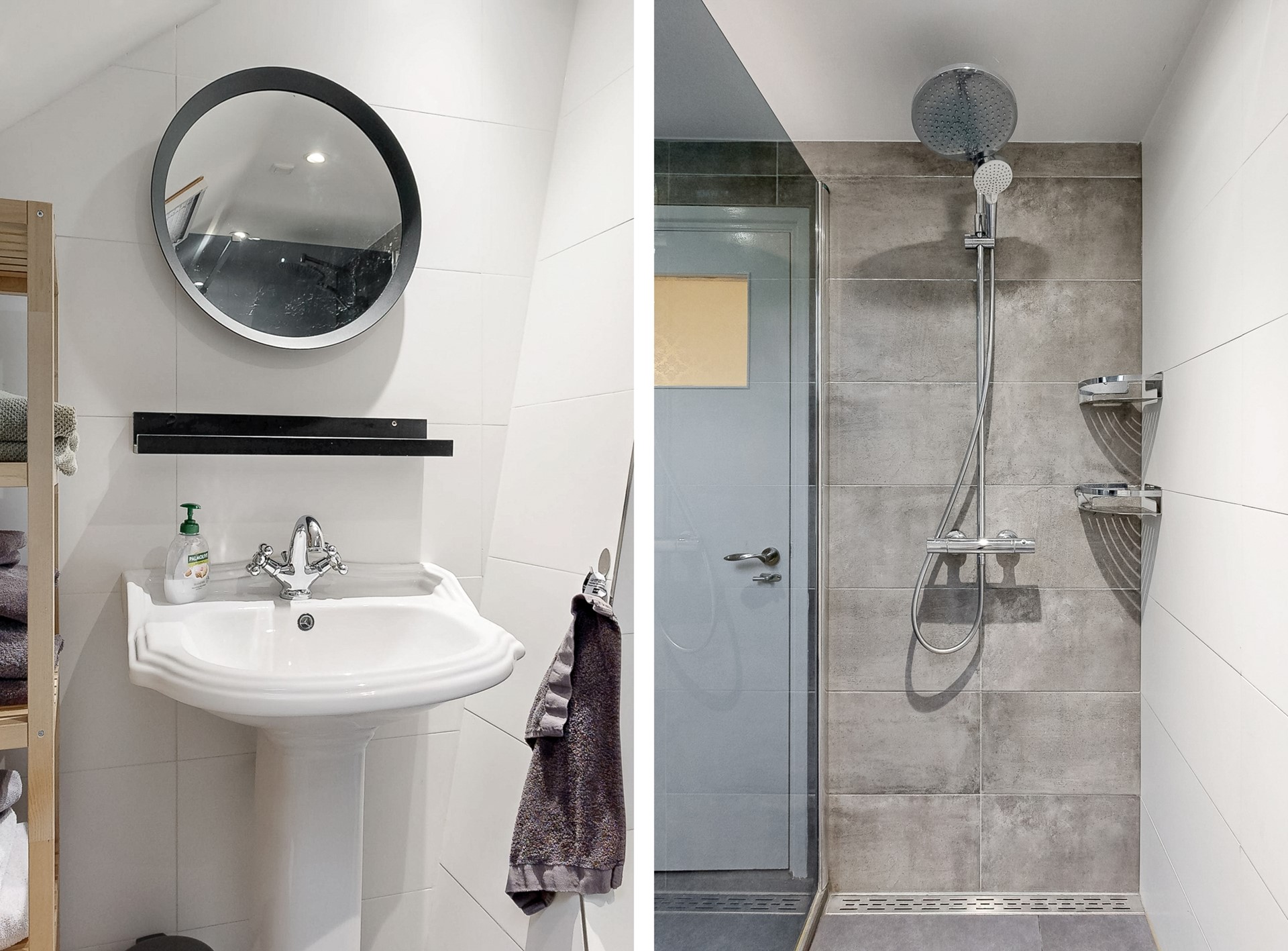 Verfris jezelf in de elegante badkamer van 2021 met moderne betegeling en inbouwspots in het gladde stucwerk plafond. Spoel de drukte van de dag van je af in de inloopdouche met glazen douchewand, thermostaatkraan, regen- en handdouche. De nostalgisch vormgegeven wastafel is uitgevoerd met een planchet en spiegel. De designradiator zorgt voor een aangename temperatuur en het Velux-dakraam voor de ventilatie. Het luik biedt toegang tot een praktische bergruimte.