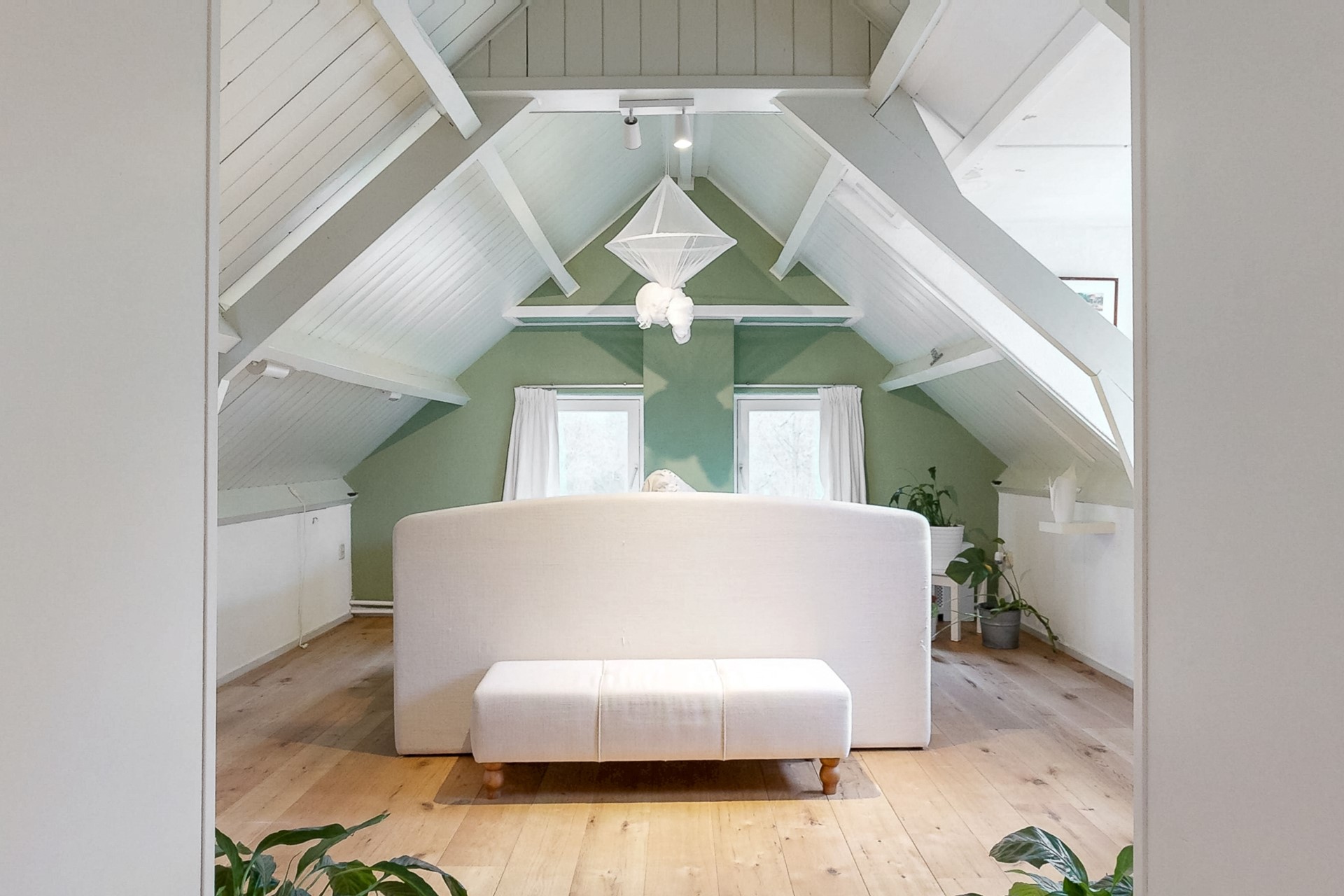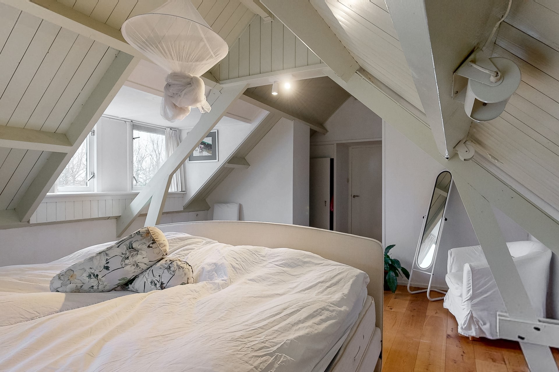 Op het achterste deel van deze verdieping ligt de riante 2de slaapkamer, die zich kenmerkt door een uitgesproken loftkarakter. De eiken vloerdelen lopen naadloos door naar deze kamer. Het houtwerk van de dakvlakken zorgt in combinatie met de balken van de dakconstructie en de pastelgroene contrastwand voor een oogstrelend plaatje. Direct bij binnenkomst in deze slaapkamer vindt je zowel aan je linker- als aan je rechterzijde een inloopkast, zodat ieder een eigen garderobedomein heeft. Het slaapgedeelte is dankzij de dakkapel en de ramen ruim en licht en je profiteert van heerlijke uitzichten. Tot slot vindt je aan weerszijden van de kamer bergruimten achter het knieschot.