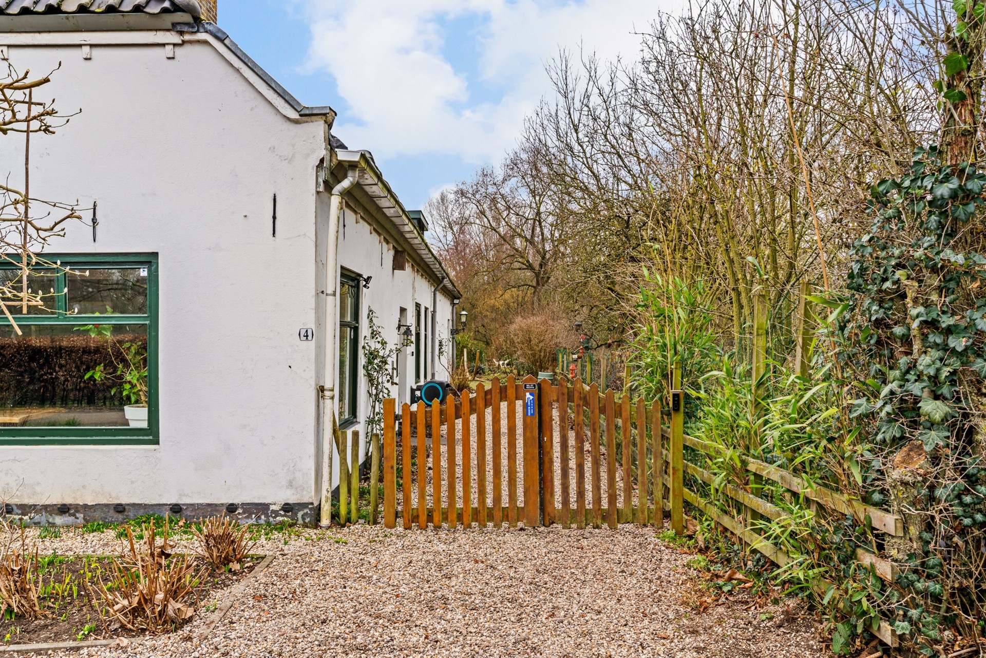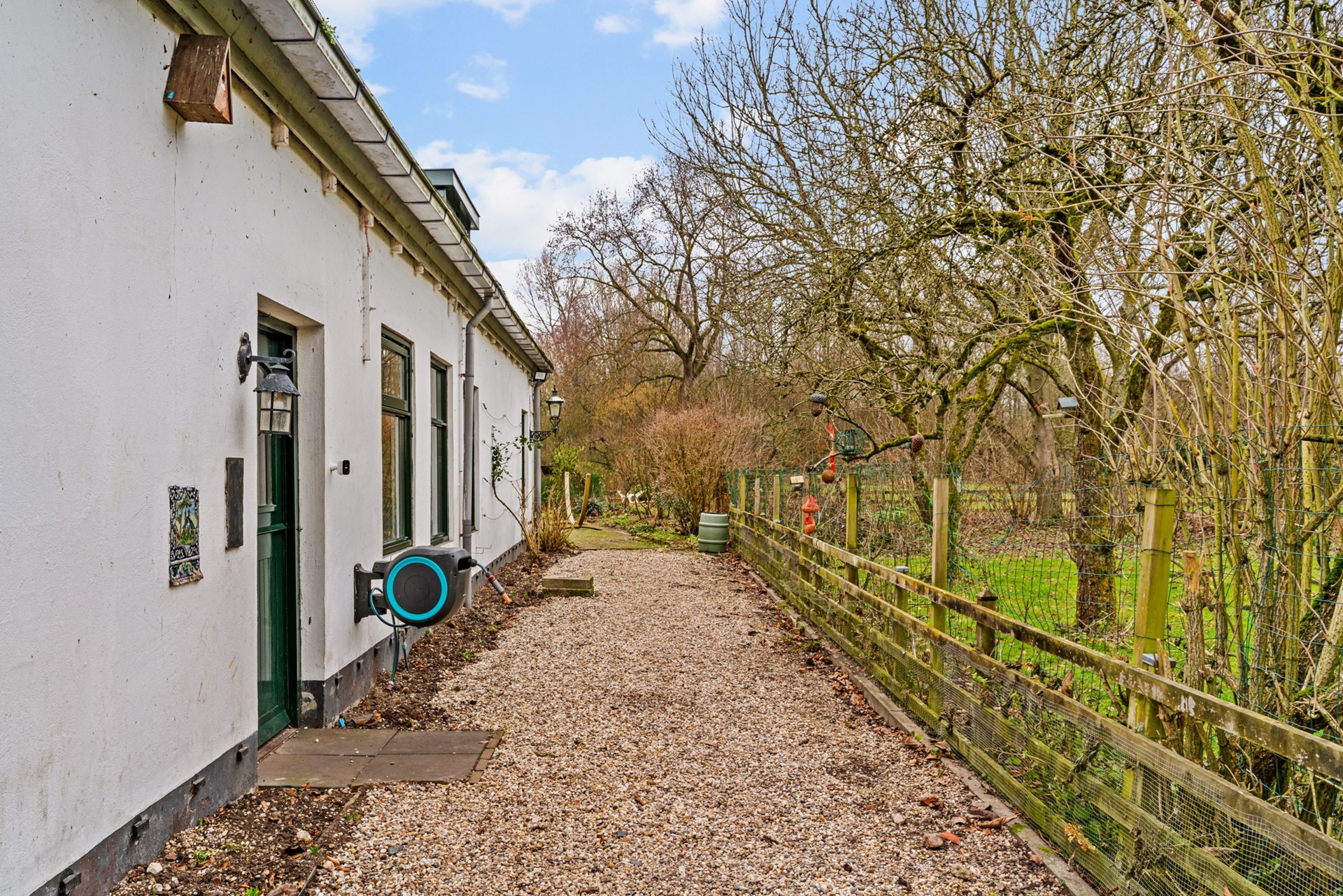 Aan de voorzijde van het huis ligt parkeergelegenheid op eigen terrein. Een houten hekwerk geeft toegang tot de oprit van grind die langs het huis naar het bijgebouw leidt. Klassieke gevellantaarns en sensorverlichting zorgen niet alleen voor een stijlvolle entree, maar ook voor veiligheid en gebruiksgemak. Praktisch detail: de hemelwaterafvoeren zijn recent aangesloten op de riolering.