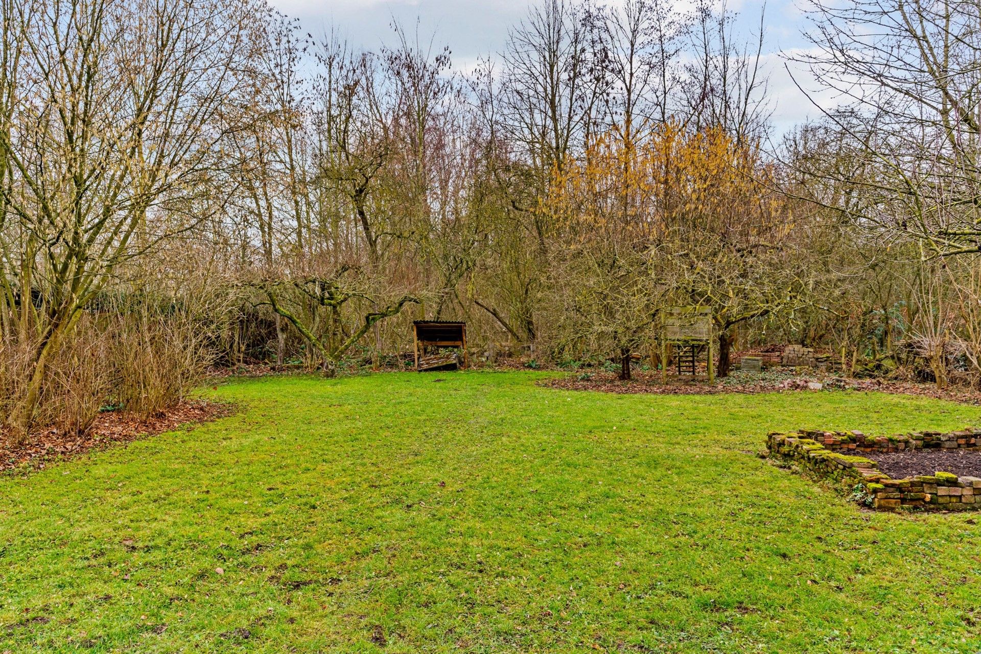 Het riante gazon wordt omlijst door weelderige borderranden en bomen die zorgen voor een groen decor. Appel-, peren- en walnotenbomen, een kweepeer en een imposante tulpenboom geven de tuin karakter en variatie. De gemetselde erfafscheiding waarborgt privacy, terwijl de groene doorkijk naar omliggende tuinen en het aangrenzende bosperceel zorgt voor een natuurlijke verbondenheid met de omgeving. Met de aanwezige puls voor het oppompen van grondwater is het bewateren van deze prachtige tuin bovendien efficiënt geregeld.