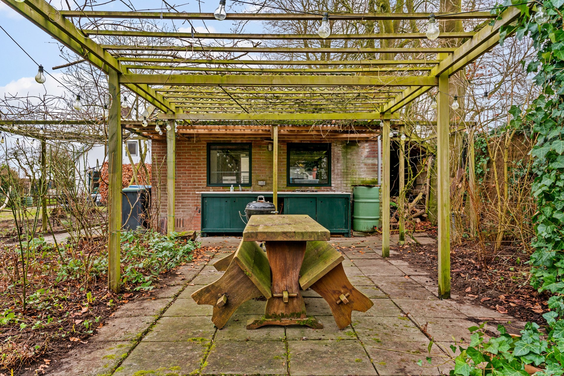 Aan de rechterzijde van het bijgebouw bevindt zich, onder het afdak, een buitenkeuken met spoelbak, gaskookplaat, elektra en verlichting. Aangrenzend ligt een terras onder een pergola, begroeid met een blauwe druif en een sering. In bloeiseizoen ontstaat hier een idyllische setting voor lange diners en ontspannen zomeravonden. De kas en de moestuin bieden daarnaast de mogelijkheid om eigen groenten, kruiden of bloemen te kweken.