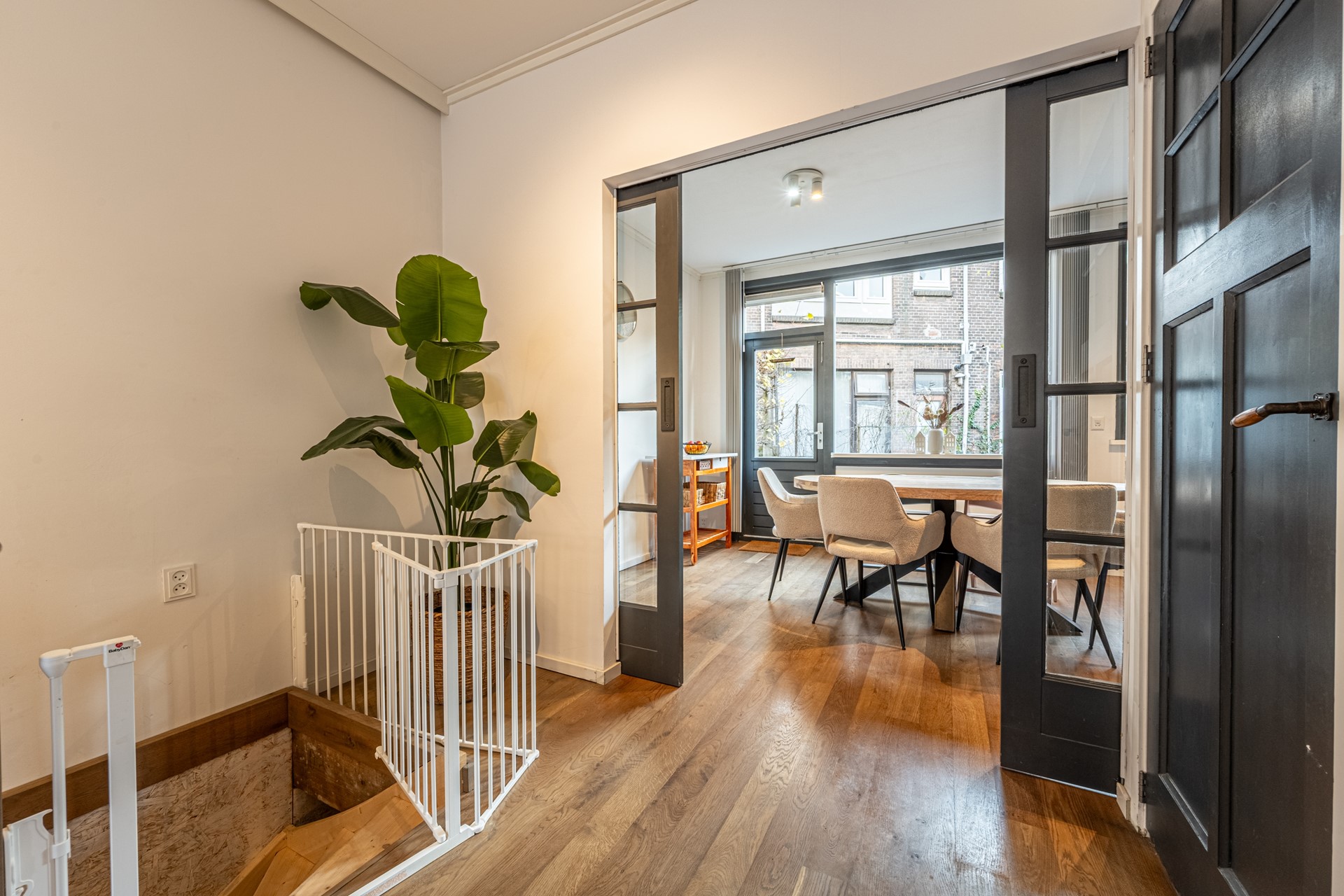 Je komt binnen in een ruime, lichte entree met strak stucwerk, laminaatvloer en uitgebreide meterkast. Lichtkoven met led-verlichting zorgen direct voor sfeer en zijn geheel naar wens instelbaar. Via kamer-en-suite deuren bereik je de warme en stijlvolle woonkamer met hoog plafond, grote ramen en eikenhouten vloer. Aan de achterzijde loopt de woonkamer trapsgewijs over naar de zonnige tuin op het zuidoosten: beschut, groen en sfeervol aangelegd met waaltjes.