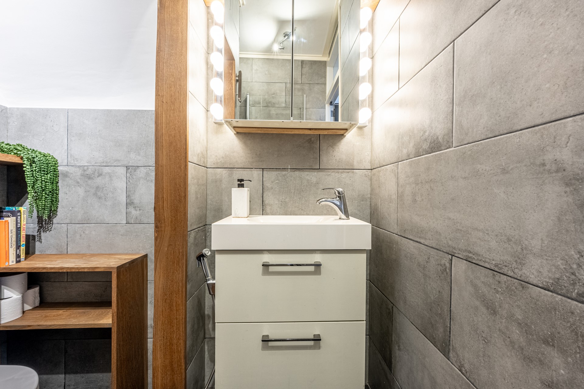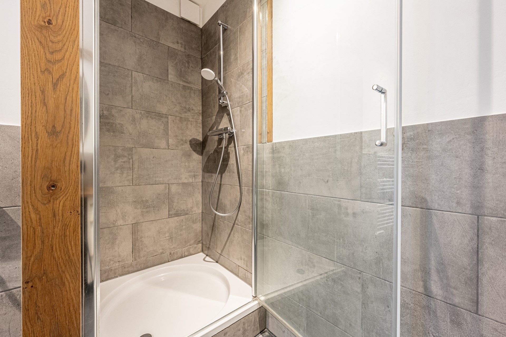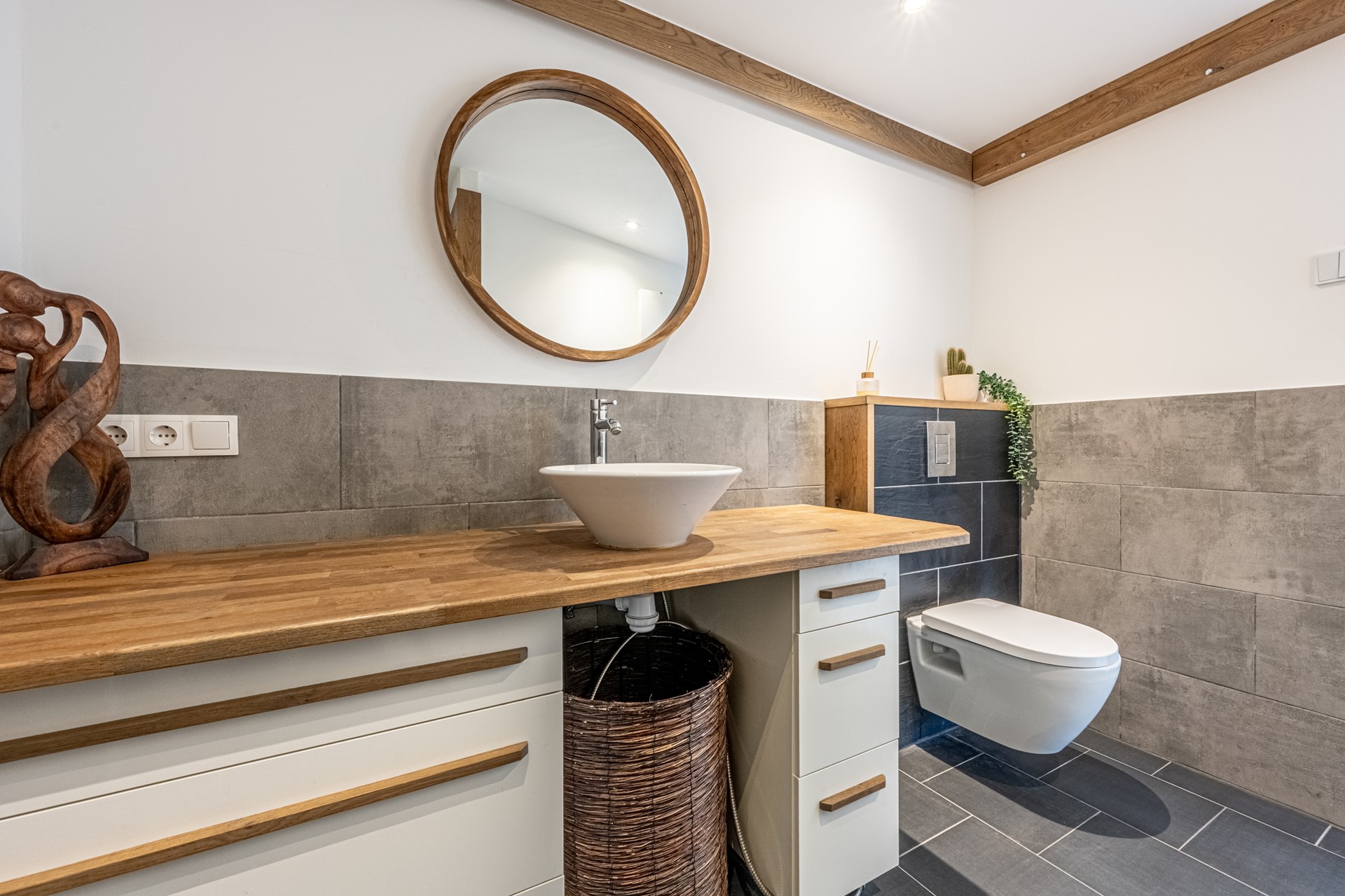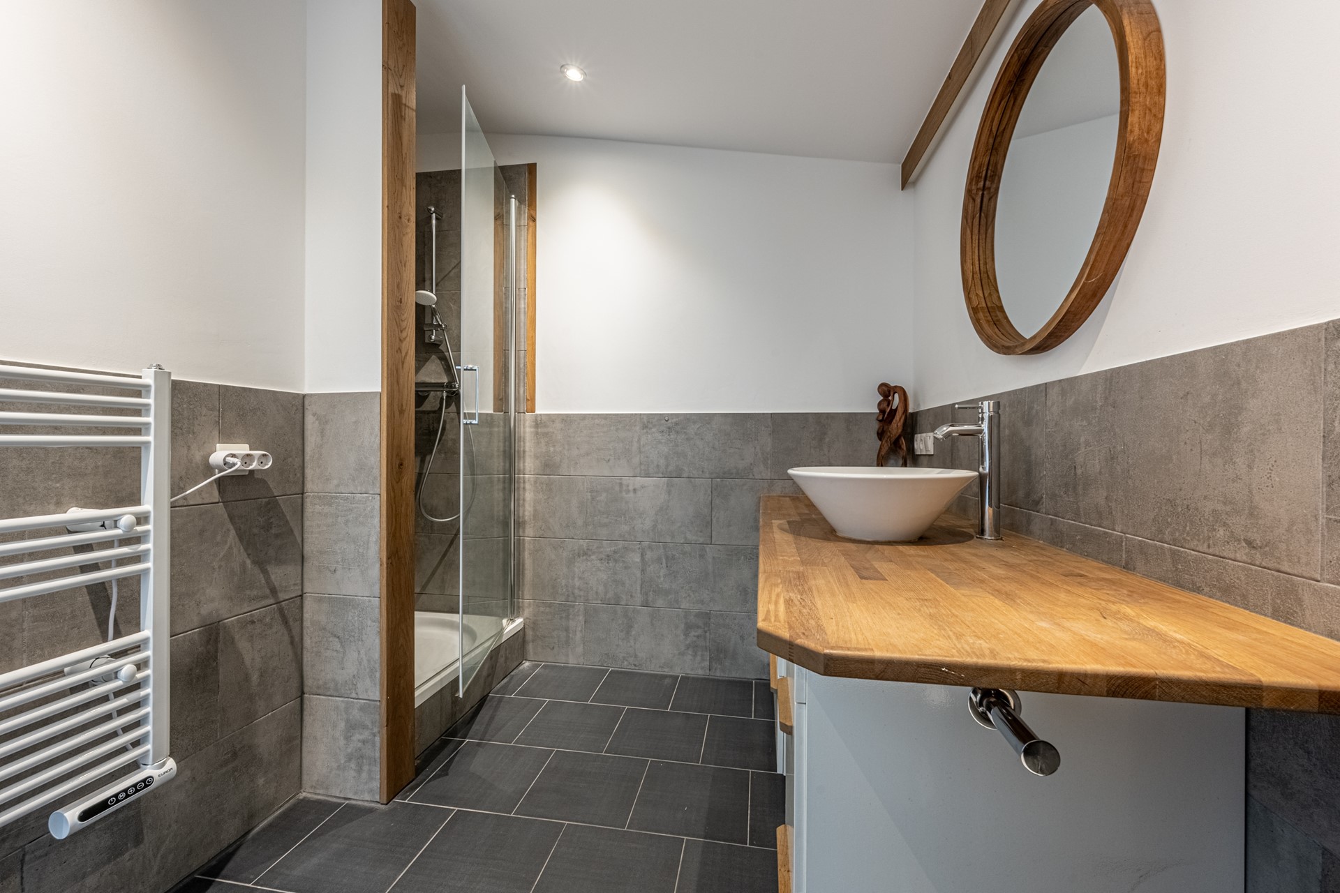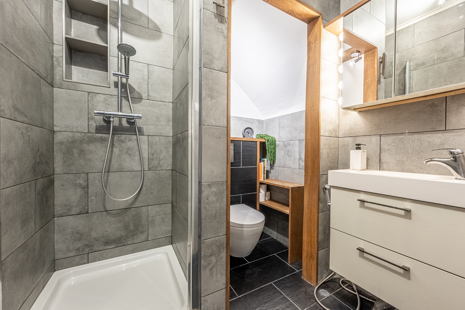 De luxe badkamer is afgewerkt met eiken accenten en betegeld met een combinatie van grote grijze en zwarte wand- en vloertegels. Verder uitgerust met een wastafelmeubel, spiegelkast met verlichting, douche met thermostaatkraan en regendouche, én een wandcloset.