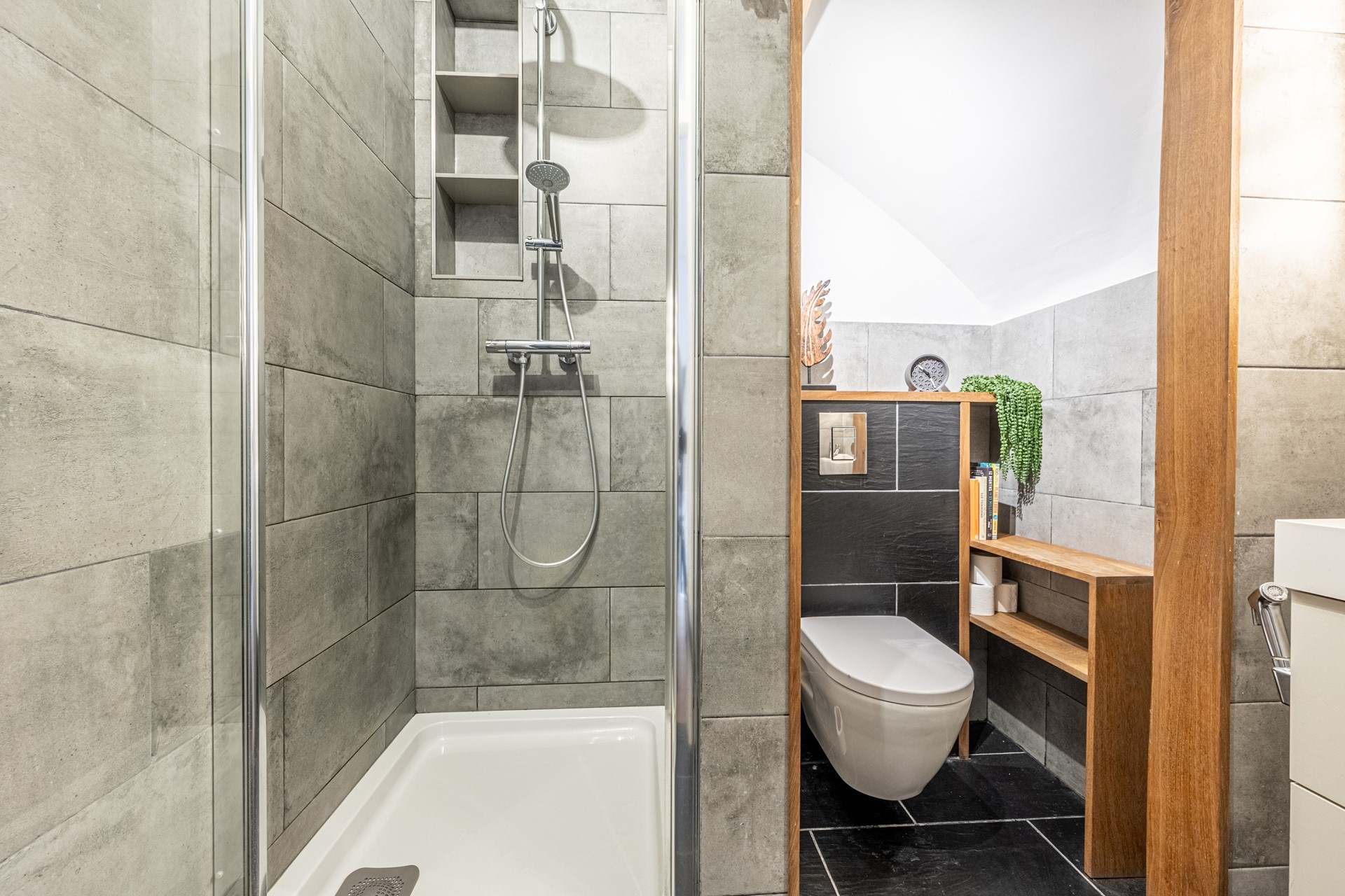 The luxurious bathroom is finished with oak accents and a combination of large grey and black tiles. It includes a vanity unit, illuminated mirror cabinet, shower with thermostat tap and rain shower, and a wall-mounted toilet.