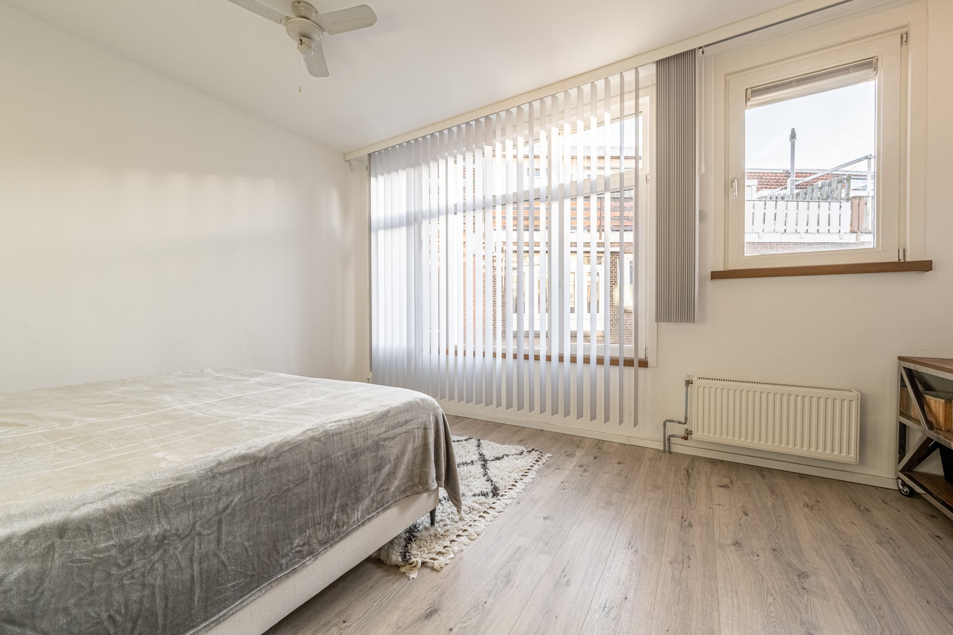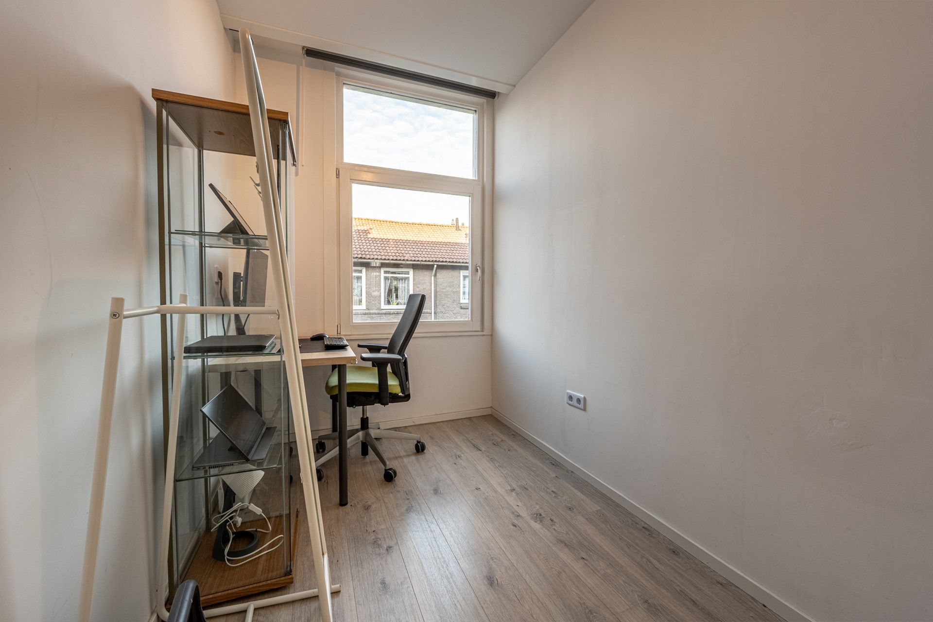 Twee slaapkamers liggen aan de voorzijde. De verdieping is voorzien van glad gestucte wanden en een neutrale laminaatvloer.