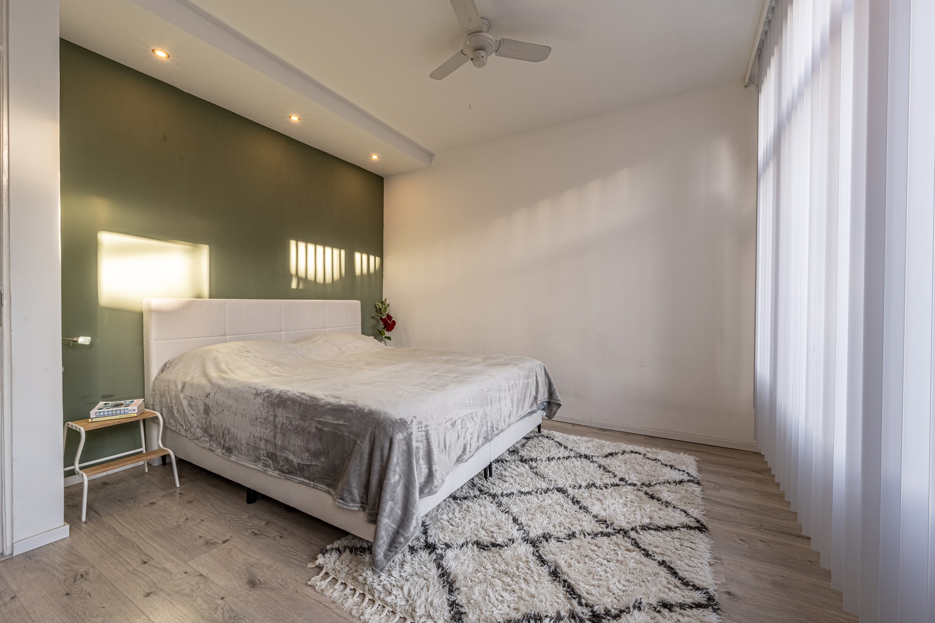 De grote slaapkamer aan de achterzijde is voorzien van led-sfeerverlichting, plafondventilator en lamellen.
