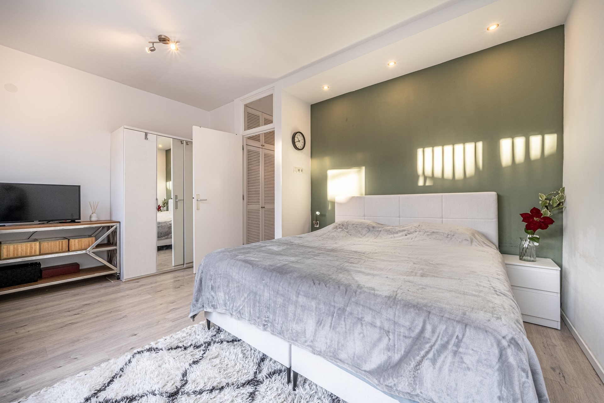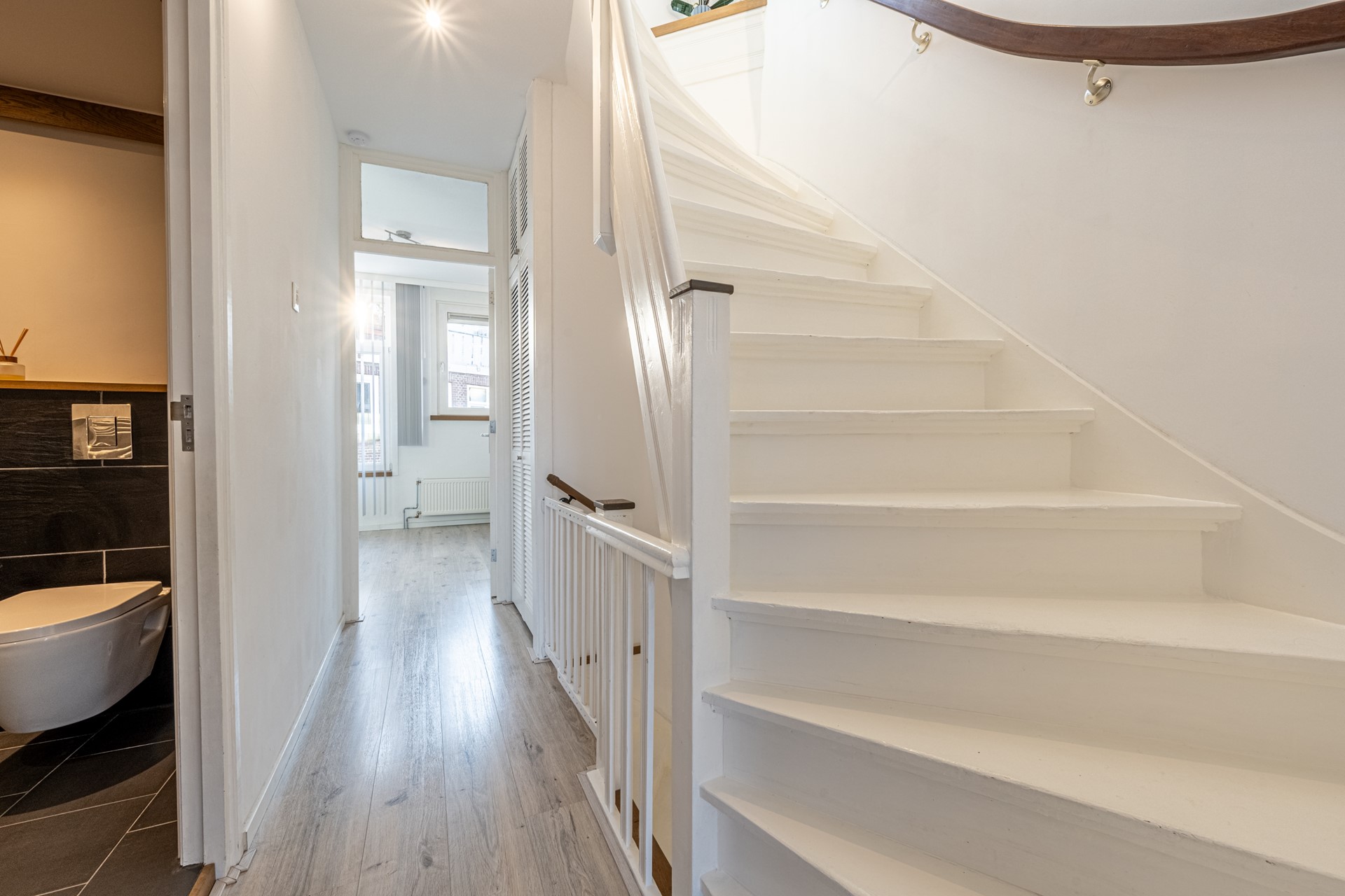 You enter into a spacious, bright hallway with smooth plastered walls, laminate flooring and an extensive meter cupboard. Light coves with LED lighting create immediate ambiance and can be adjusted to your preference.
