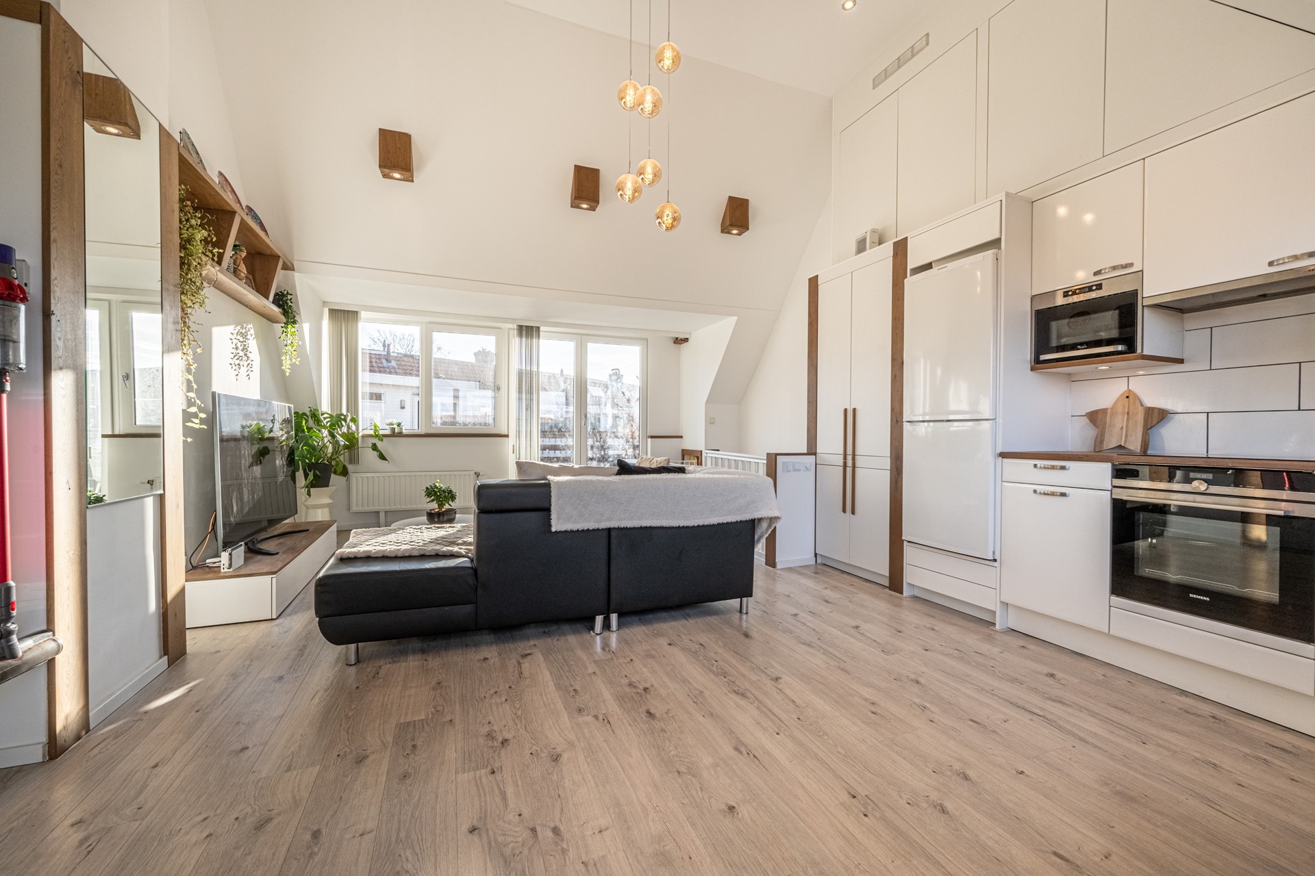 Hier word je écht verrast: een prachtige open ruimte met enorme nokhoogte (3,92 m!), maatwerkverlichting en een tweede moderne keuken in hoekopstelling met ingebouwde koel-vriescombinatie, oven, inductiekookplaat en vaatwasser.