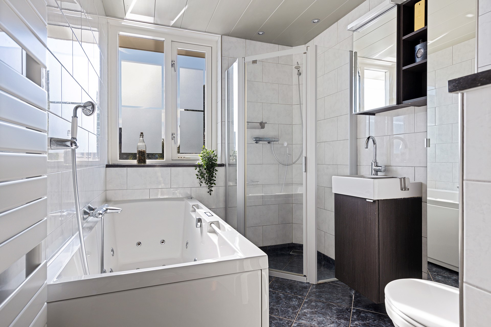Overloop, drie slaapkamers en een moderne badkamer met (bubbel)ligbad, aparte douche en tweede toilet.