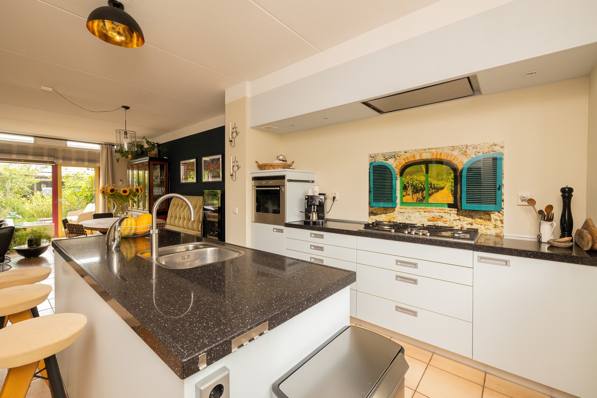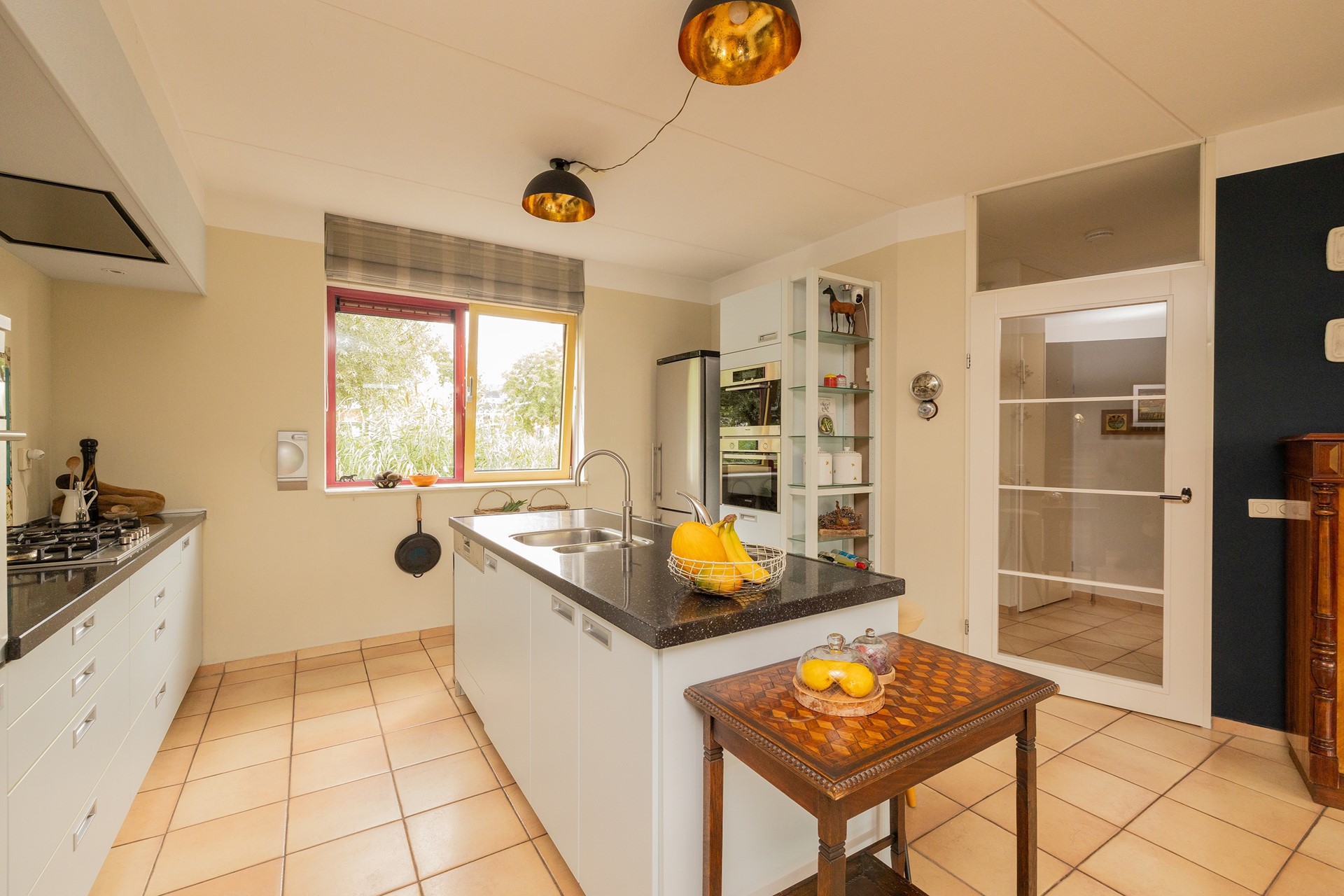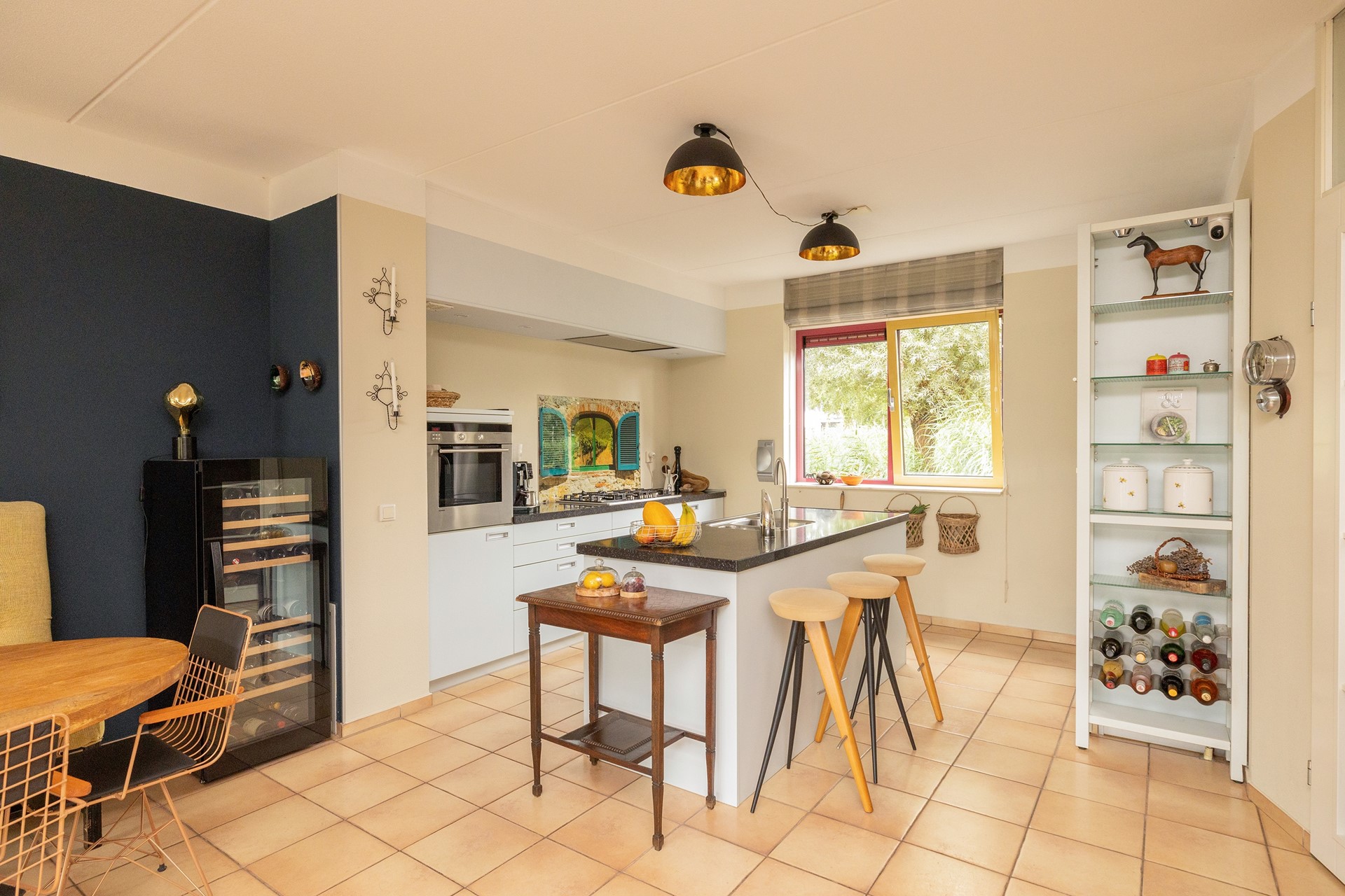Het begint al speciaal; een houten brug over water met langs zwemmende eendjes, brengt je naar de voordeur. Je komt in de hal met plavuizen die drempelloos doorlopen naar de woonkamer en open keuken. De benedenverdieping is overigens voorzien van vloerverwarming, dat net een extra stukje comfort geeft. Tevens 2 hybride airco's. Links in de hal is het eerste toilet met fonteintje en de trap naar de eerste verdieping. Rechts is de deur naar de woonkamer met aan de voorzijde (Oosten) de open keuken in strak wit/antraciet kleurstelling. Er is diverse inbouwapparatuur, waterontharder en een gaskooktoestel met afzuigkap. En, niet te missen, een heerlijk extra keukenblok met nog meer bergruimte, een spoelbak, een Quooker kraan met tevens een bruiswatervoorziening en een vaatwasser, waarbij dit eiland ook functioneel is als bar c.q. (ontbijt-) tafel. De woonkamer is heerlijk licht door de grote glazen achterwand. Zo loopt de woonkamer vrijwel naadloos over in de tuin, mede door de schuifpui links en nog een extra deur rechts. De kachel zorgt voor een extra sfeermomentje. Heerlijk om van te genieten met een goed glas of een boek op een koude avond.