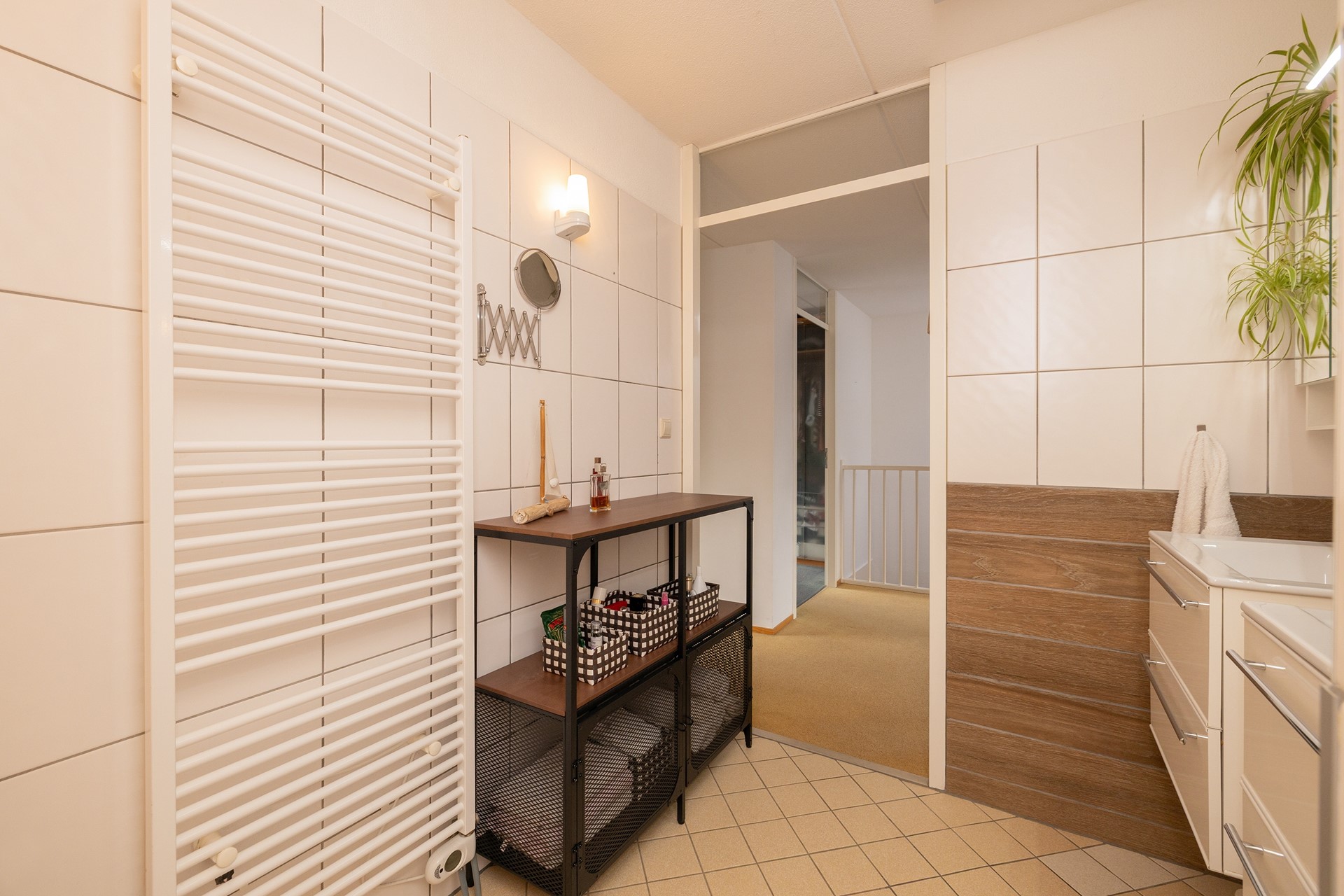 Via de trap in de hal kom je op de overloop van de eerste verdieping. Het is een lichte ruimte, door het dakraam dat er geplaatst is. Er zijn vier slaapkamers, een badkamer en een wasruimte. Aan de achterzijde (Westen) is rechts de master bedroom en links de tweede slaapkamer. Aan de voorzijde zijn eveneens twee slaapkamers, uitkijkend op de fraaie achtertuin. Desgewenst kunnen deze ruimten ook als werk-/hobbykamer worden ingericht of als thuiskantoor. De linkse kamer heeft overigens een grote kastenwand waar je werkelijk alles in kwijt kunt. Tussen de voor- en achterzijde van deze verdieping is de badkamer gesitueerd. Hier is het tweede toilet, een designradiator (lekker voor je warme handdoeken) een inloopdouche en een dubbel badkamermeubel met spiegels, verlichting en separate wastafels en kranen. Daarnaast nog een aparte ruimte voor de wasmachine, de cv-ketel en afzuiginstallatie.