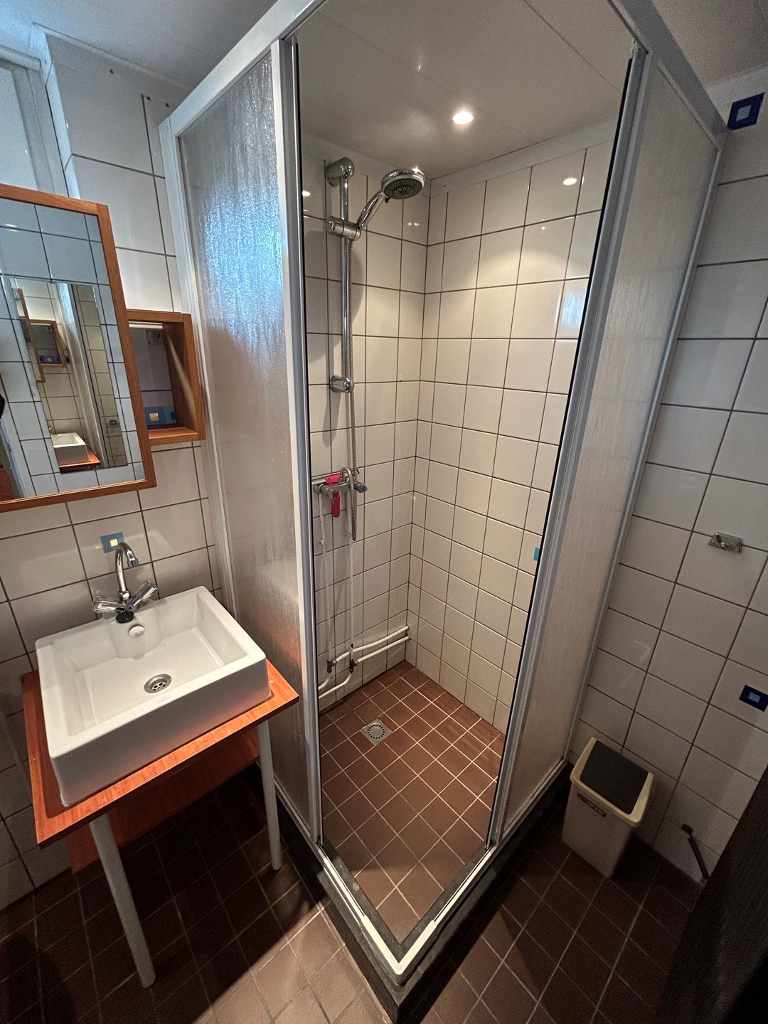 Badkamer 2,05 x 1,45 met tegelvloer, inbouwspots, douche met cabine, duoblok en wastafel.