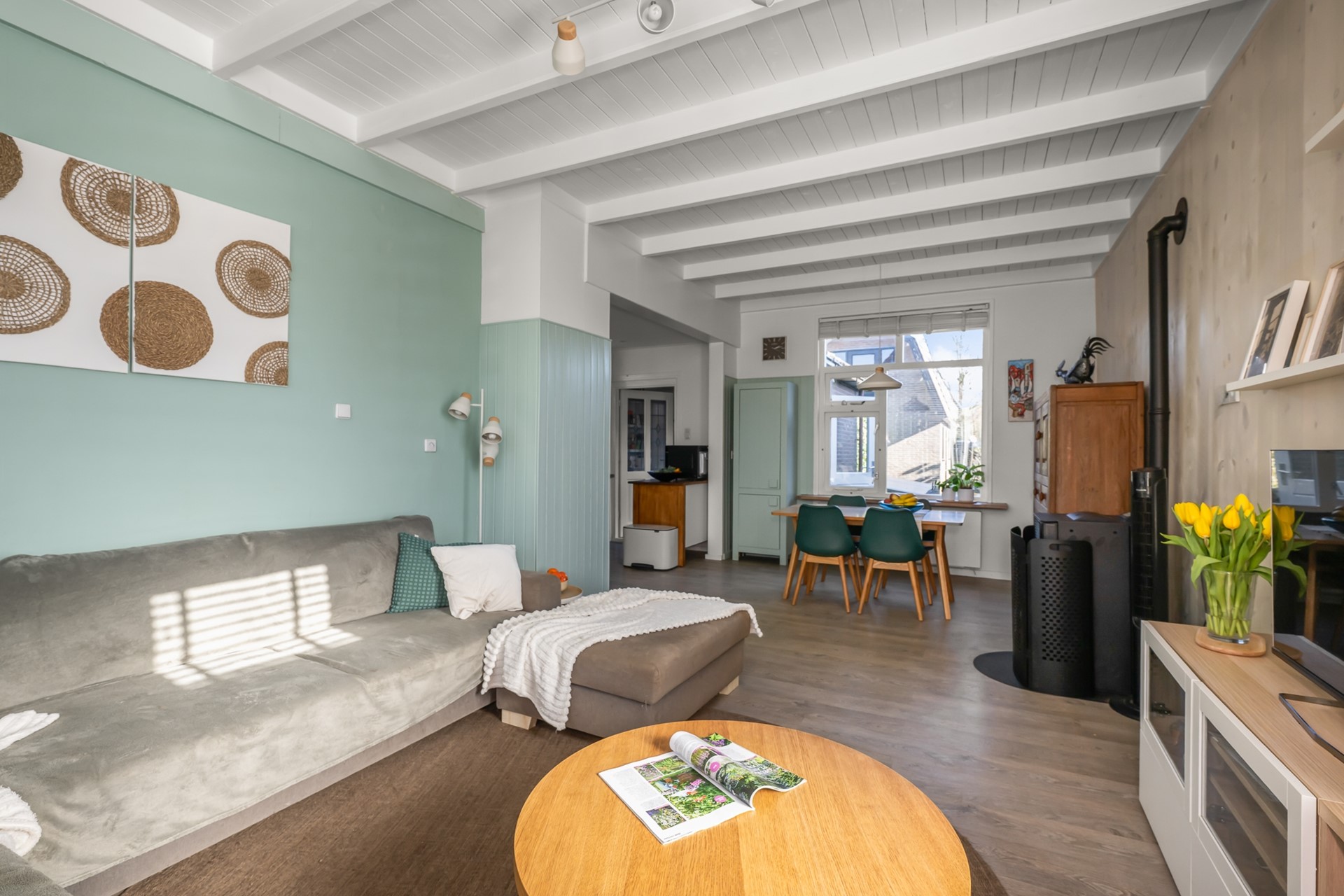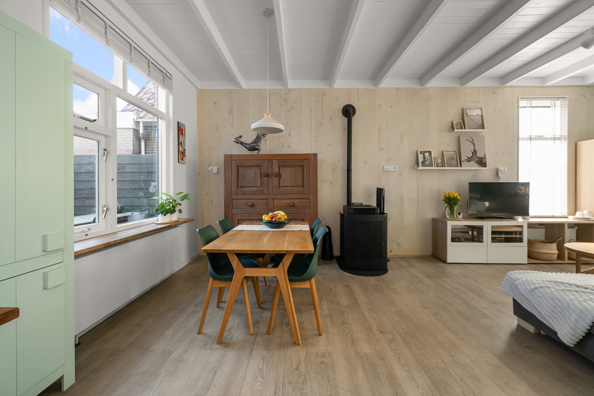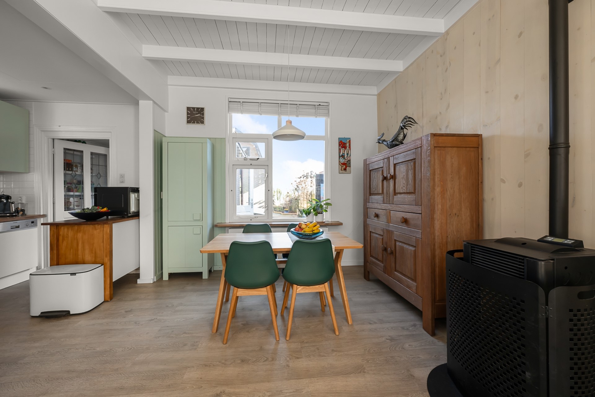 Bij binnenkomst valt direct de warme uitstraling van de woning op. De woonkamer is heerlijk licht dankzij de erker aan de voorzijde en wordt extra bijzonder door de prachtige houten balken in het zicht. Dit geeft de ruimte een authentiek karakter. De pellet kachel vormt het gezellige middelpunt van de kamer en zorgt voor behaaglijke warmte tijdens de koudere maanden.