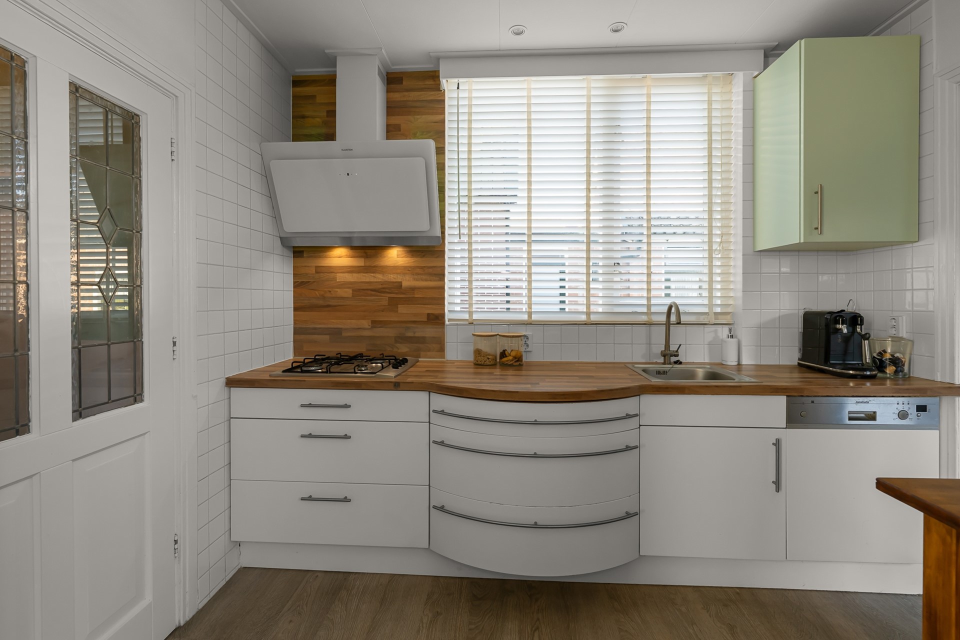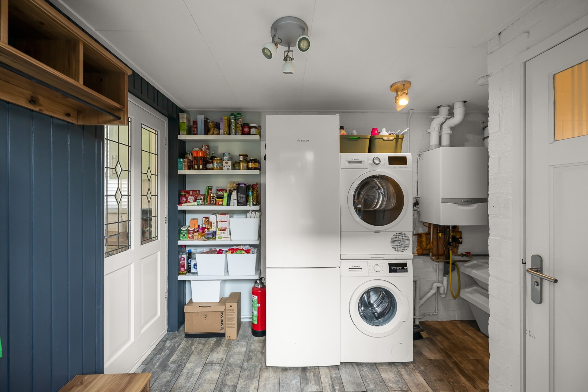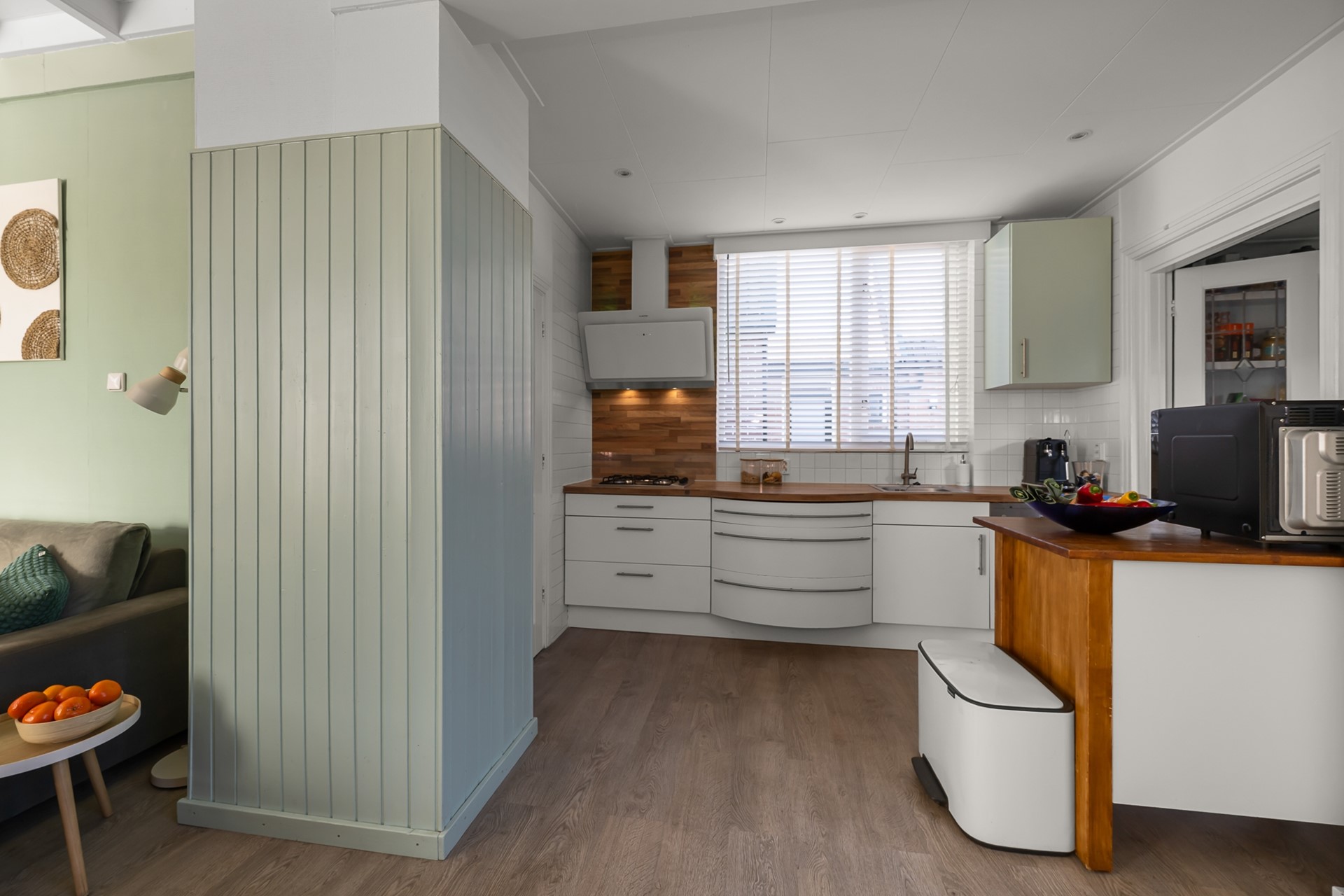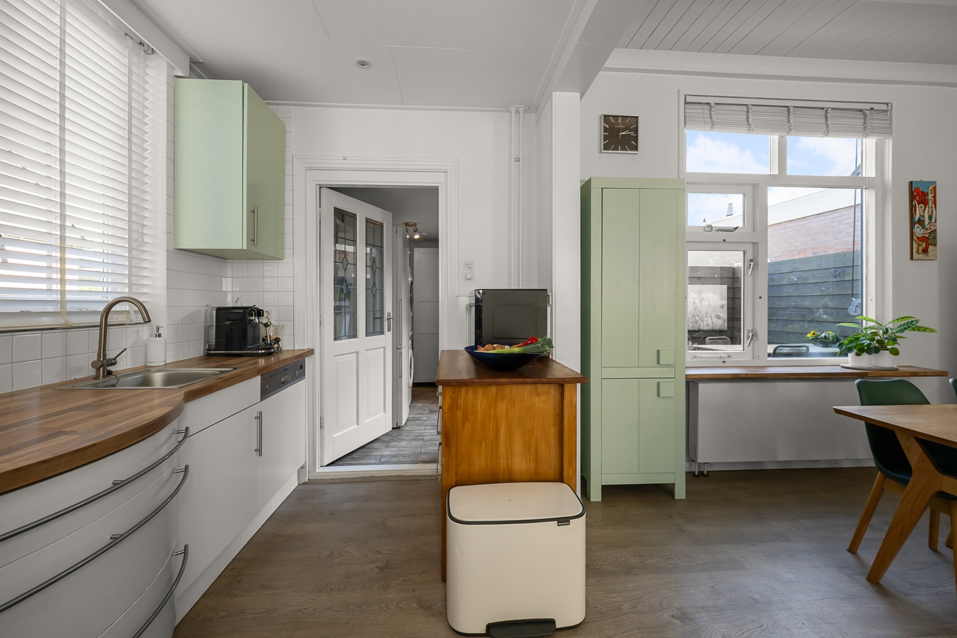 De open keuken is uitgevoerd in een lichte kleurstelling en biedt een prettige verbinding met de woonkamer. Hier kookt u in contact met uw gezin of gasten. Aansluitend bevindt zich de praktische bijkeuken met opstelling voor wasmachine en droger en toegang tot het toilet, een fijne, functionele toevoeging aan het dagelijks wooncomfort.