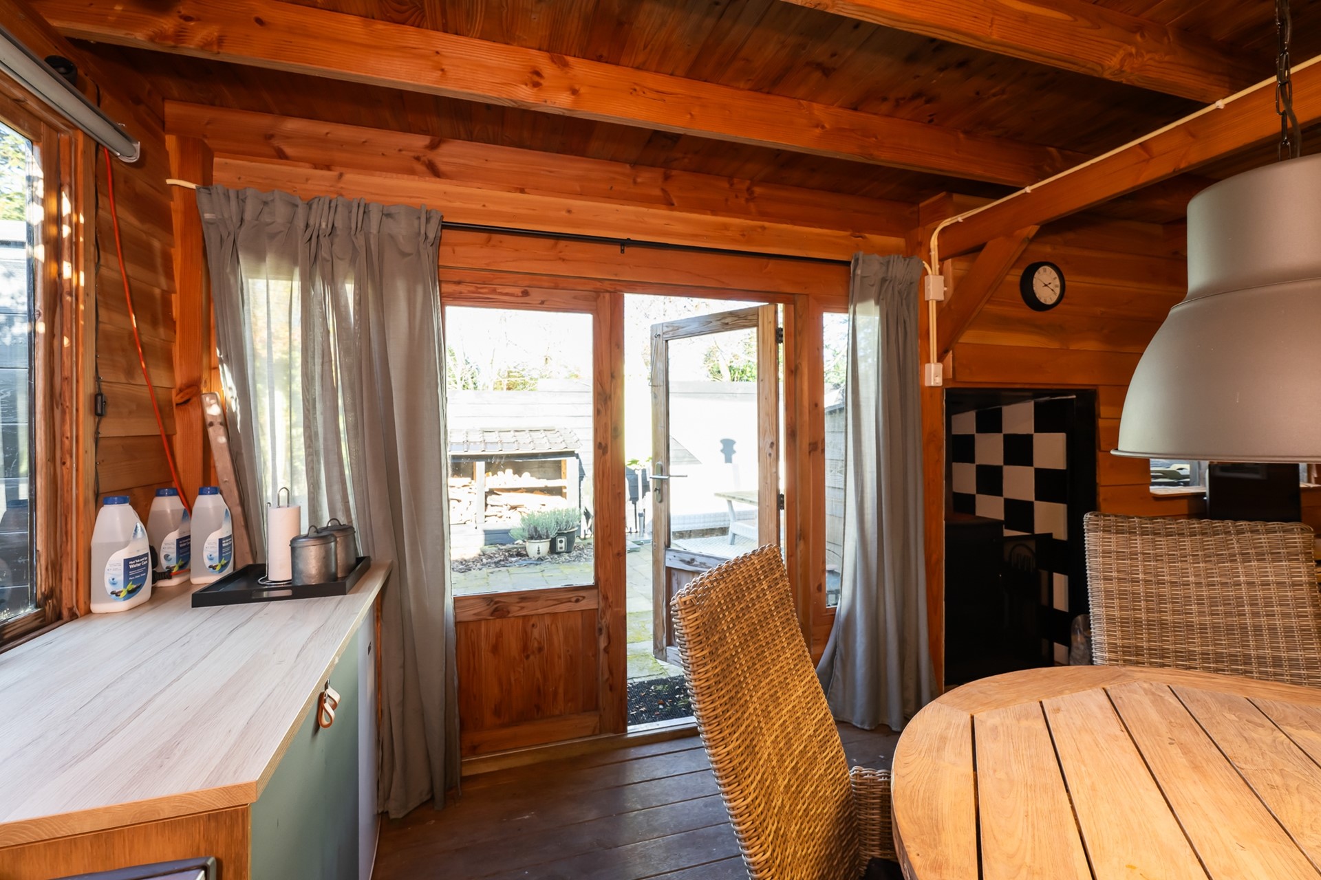 Daarnaast is er een tuinhuis die momenteel is ingericht als sfeervolle chillruimte met houtkachel. Dit is een geweldige plek voor tieners om hun eigen domein te hebben, maar ook perfect geschikt als atelier, praktijkruimte, thuiswerkplek of hobbyruimte.