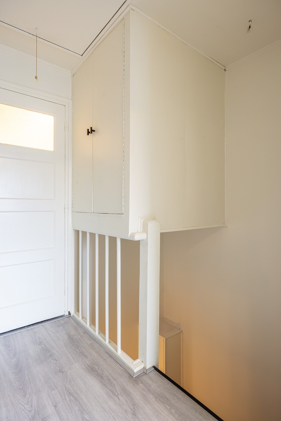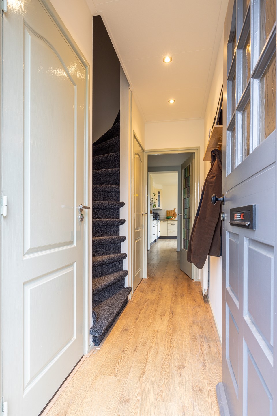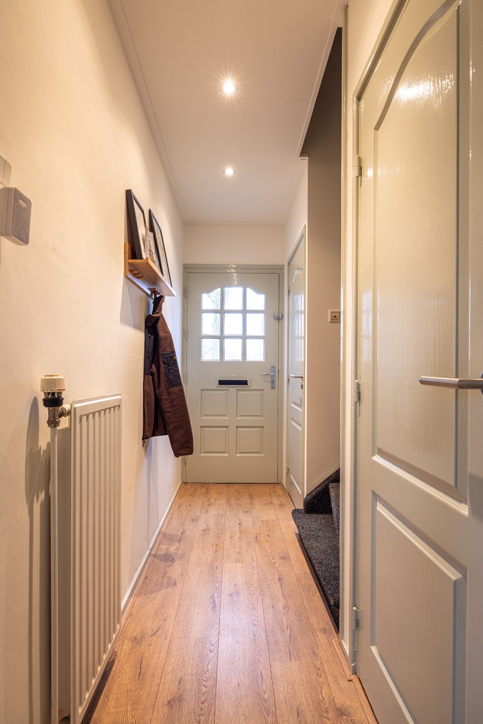 Bij binnenkomst kom je in de ontvangsthal, die is afgewerkt met een laminaatvloer en een nette, lichte uitstraling heeft. Vanuit hier heb je toegang tot de meterkast, het toilet, de woonkamer en de provisiekelder. Het toilet is modern uitgevoerd met een zwevend closet en nette wand- en vloertegels. De provisiekelder biedt praktische extra bergruimte voor voorraad of huishoudelijke spullen.