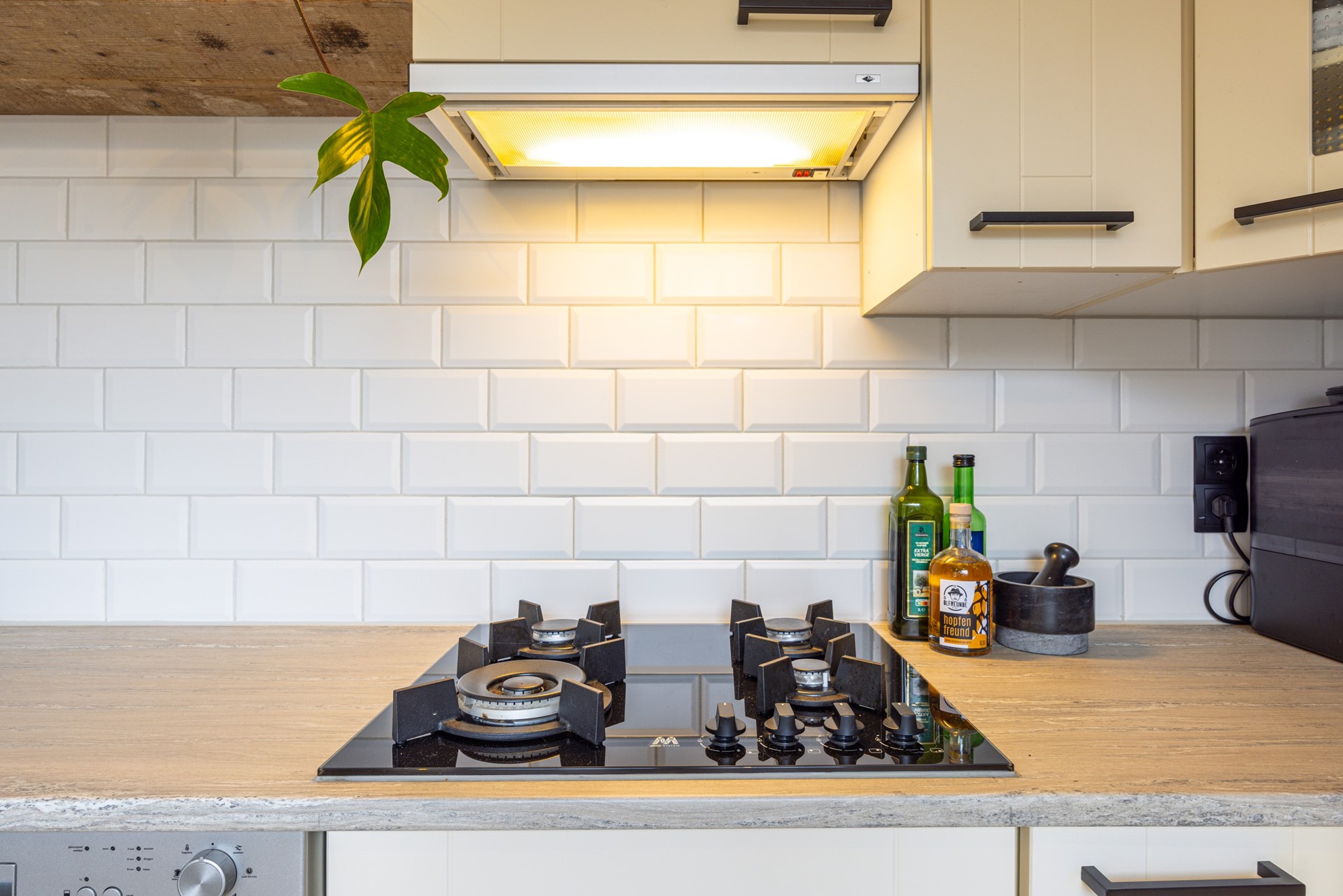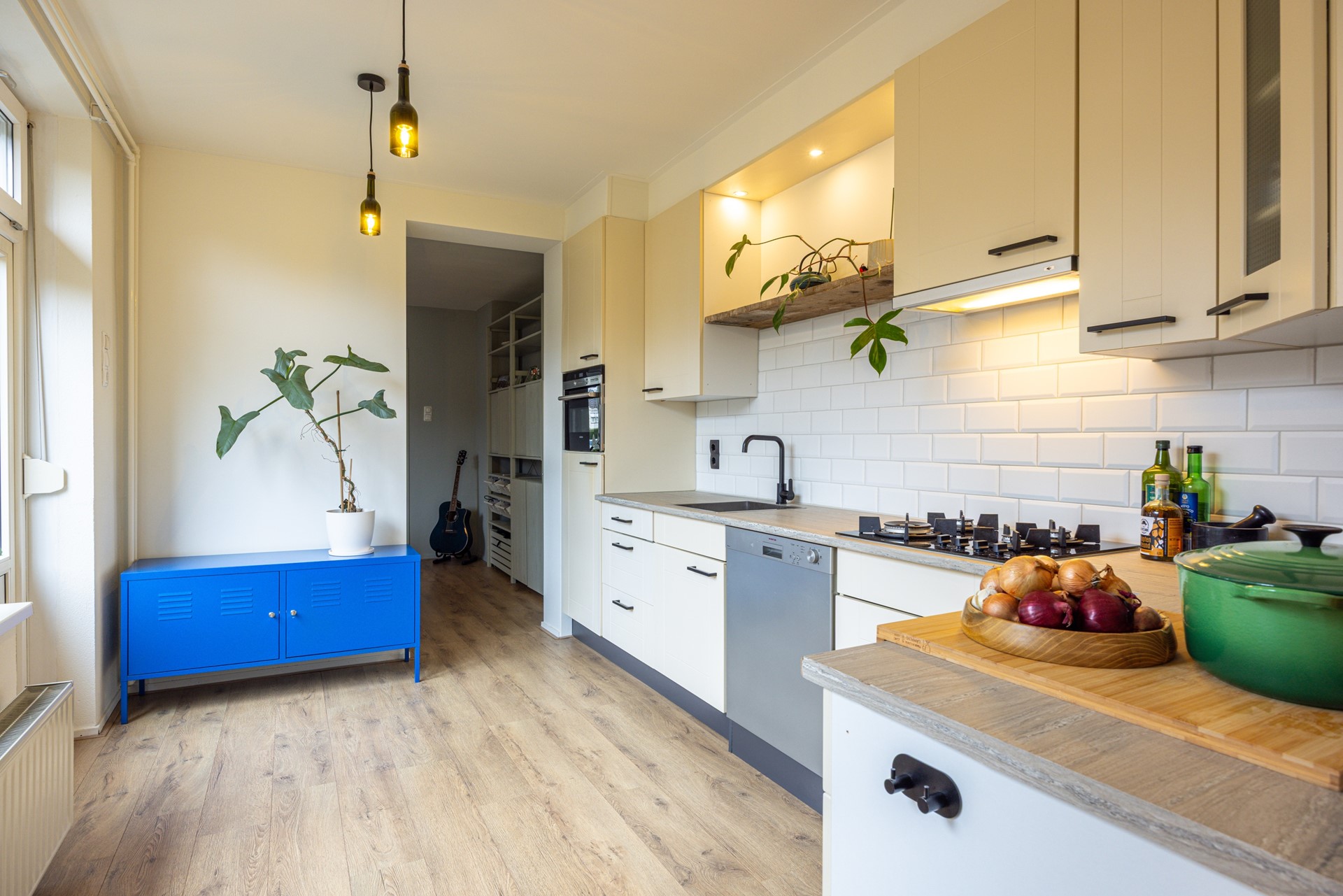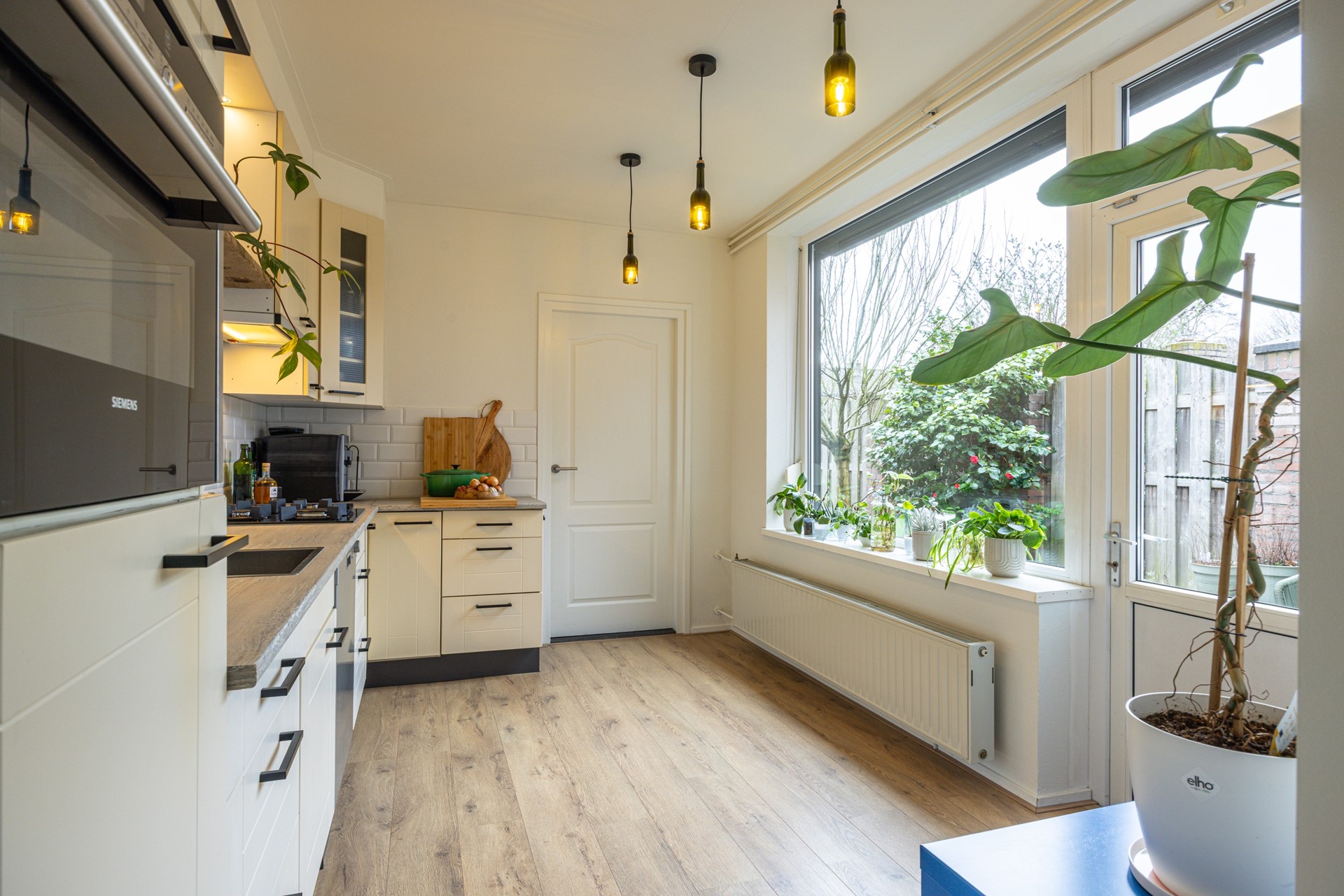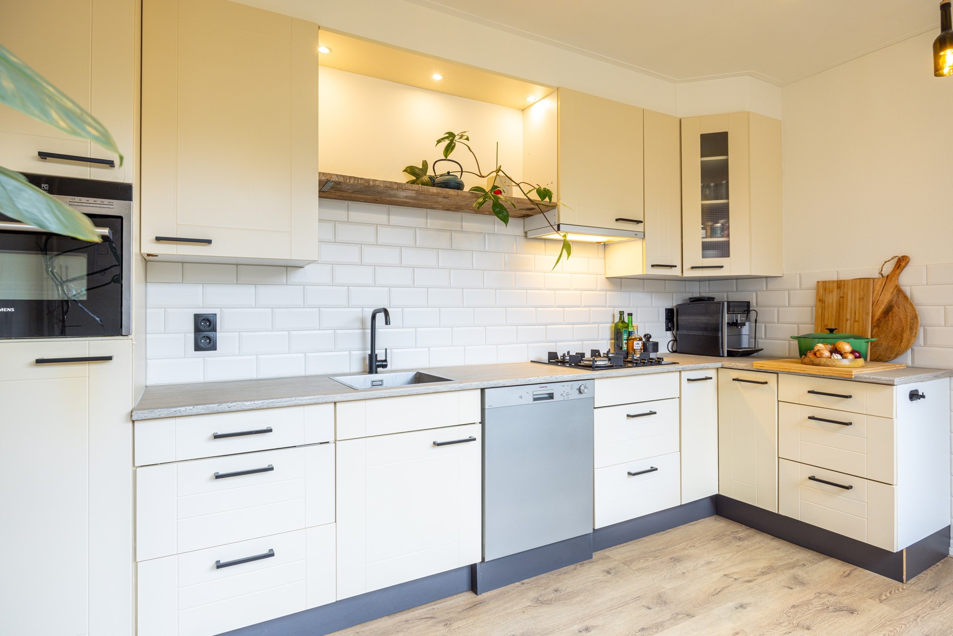 De gesloten keuken is praktisch ingericht en beschikt over voldoende kast- en werkruimte. De aanwezige apparatuur bestaat uit een 4-pits gasfornuis, afzuigkap, combi oven/magnetron, koelkast en vaatwasser. Een functionele ruimte waar koken en opbergen goed samenkomen. Vanuit de keuken is er directe toegang tot de achtertuin.