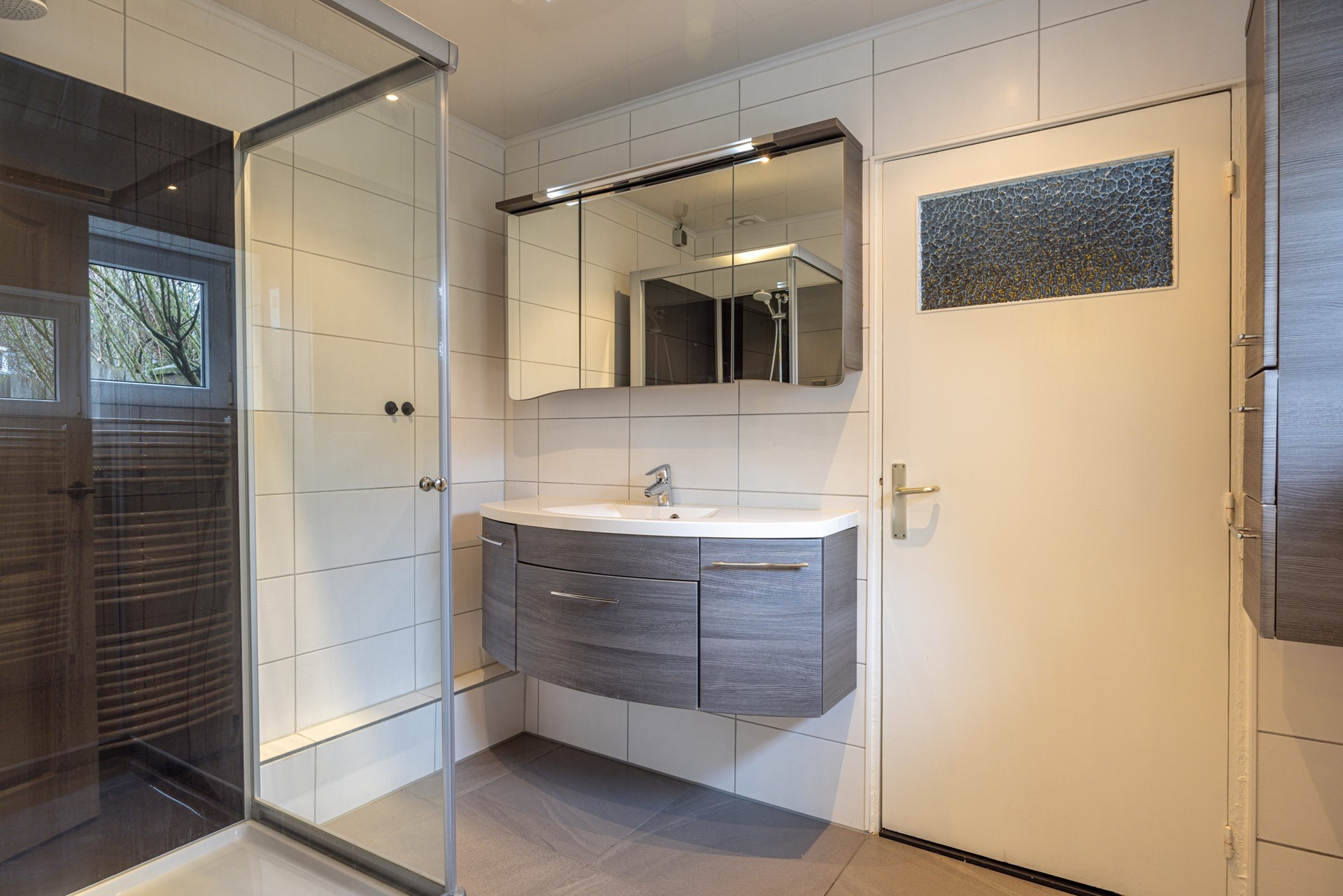 Aansluitend bevindt zich de volledig betegelde badkamer. Deze is verzorgd uitgevoerd en voorzien van een douchecabine, een badkamermeubel met spiegel, een designradiator en inbouwspots. Ook hier zijn kunststof kozijnen met dubbelglas aanwezig, wat zorgt voor prettig daglicht en ventilatiemogelijkheden. Vanuit de badkamer is er toegang tot de bijkeuken, waar de witgoedaansluitingen zijn gesitueerd en extra praktische ruimte aanwezig is voor het plaatsen van wasmachine en droger.