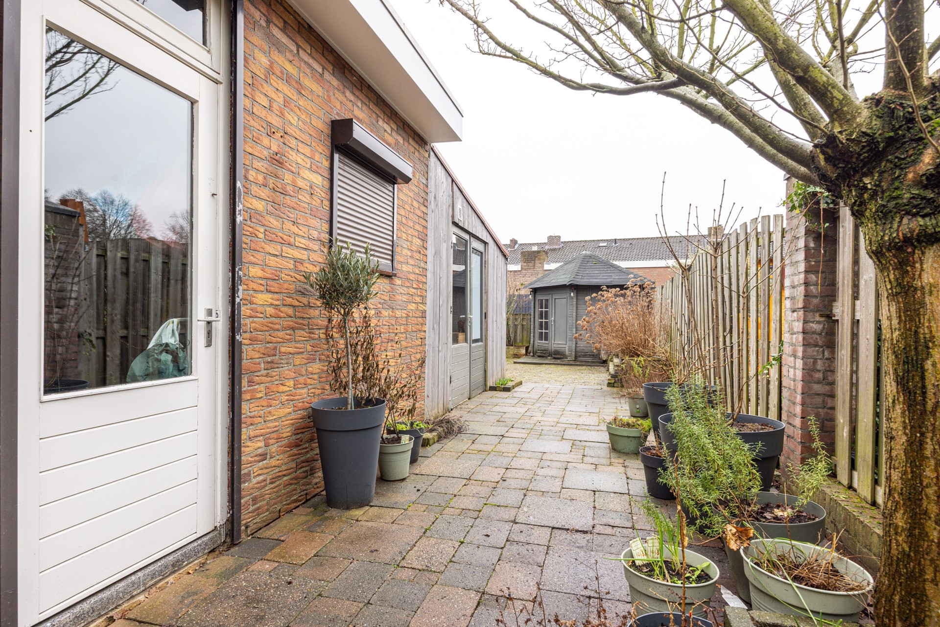 De achtertuin is volledig betegeld en onderhoudsvriendelijk ingericht, ideaal voor wie graag buiten zit met weinig onderhoud. Dankzij de omheining geniet je hier van veel privacy en kun je ongestoord ontspannen.