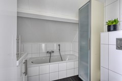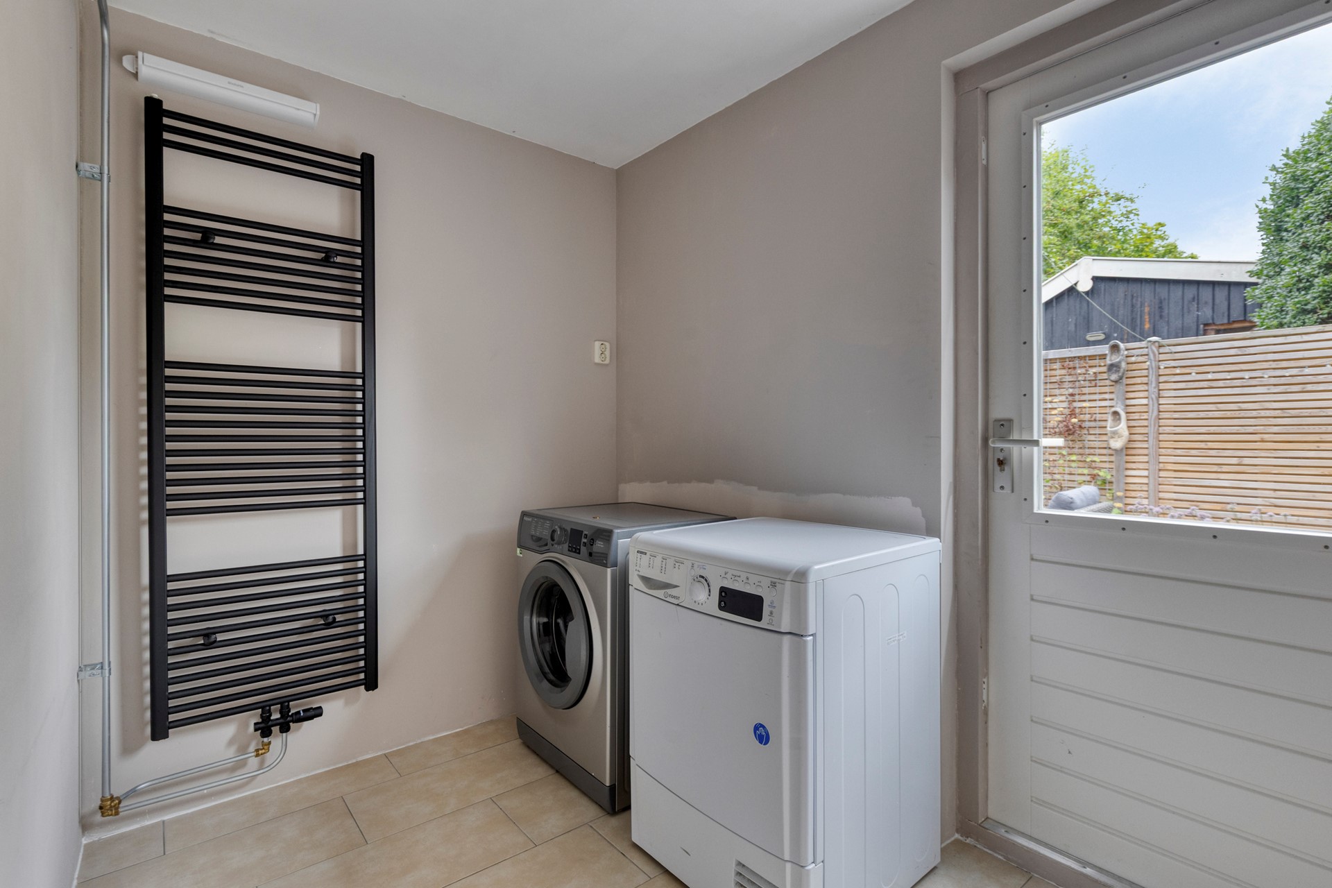Naast de bijkeuken kom je in een ruime berging, gerealiseerd door de garage iets kleiner te maken. Deze ruimte is geïsoleerd en vind je de witgoedaansluitingen. Zo kun je je was prima uit het zicht hangen. Vanuit deze ruimte is een deur naar de garage annex berging en naar de tuin. De garage heeft een kantel-/loopdeur naar de straatzijde. Praktisch is dat je vanaf de straat ook naar de achtertuin kunt lopen.