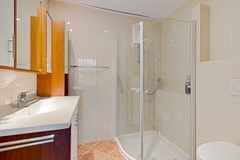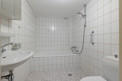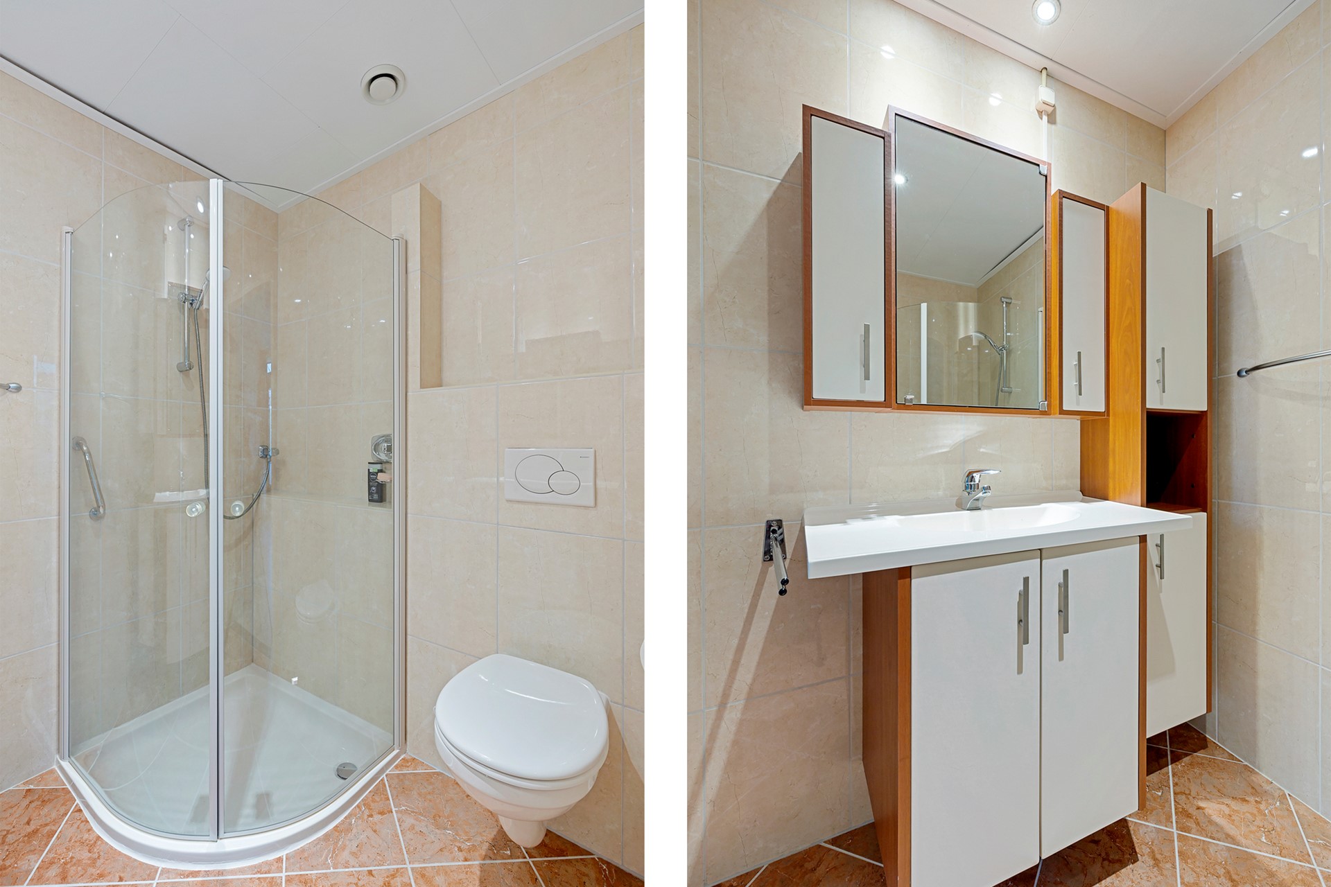 De badkamer op de begane grond is compact maar compleet met toilet, douchehoek en een wastafel. Er is een apart (gasten)toilet aanwezig.