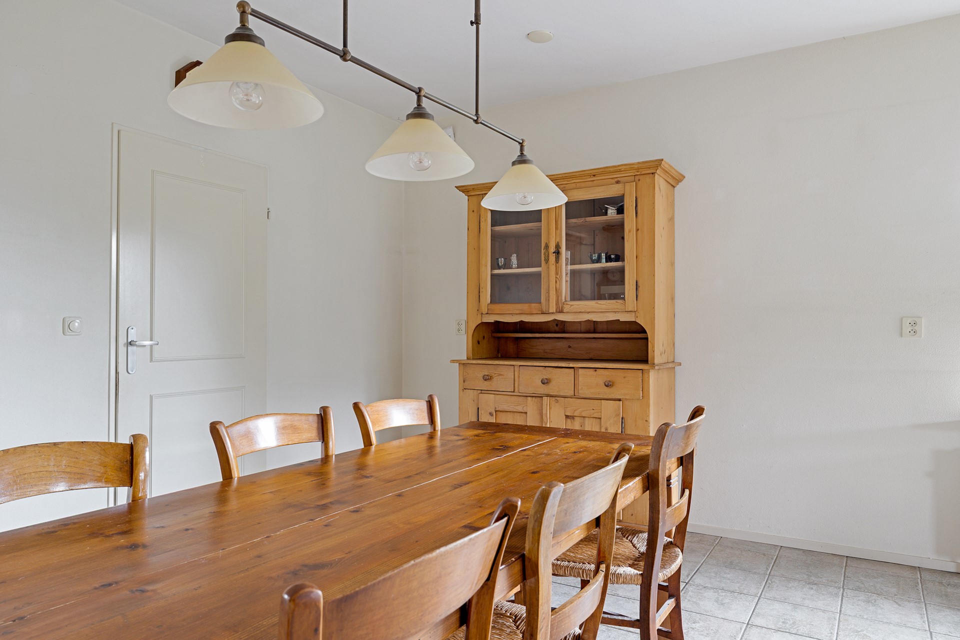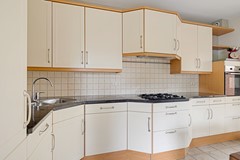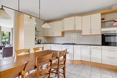 De keuken in hoekopstelling vind je aan de achterzijde van de woning. De halfopen inbouwkeuken uit 2000 is met een lage scheidingswand deels uit het zicht geplaatst. In het aangrenzende eetgedeelte kun je een ruime eettafel kwijt.