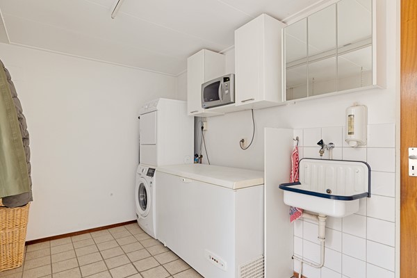 Vanuit de keuken bereik je de bijkeuken met de witgoedaansluitingen, de HR-combiketel, de uitstortgootsteen en een deur naar zowel de garage als de serre.