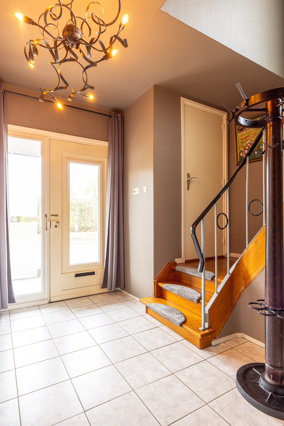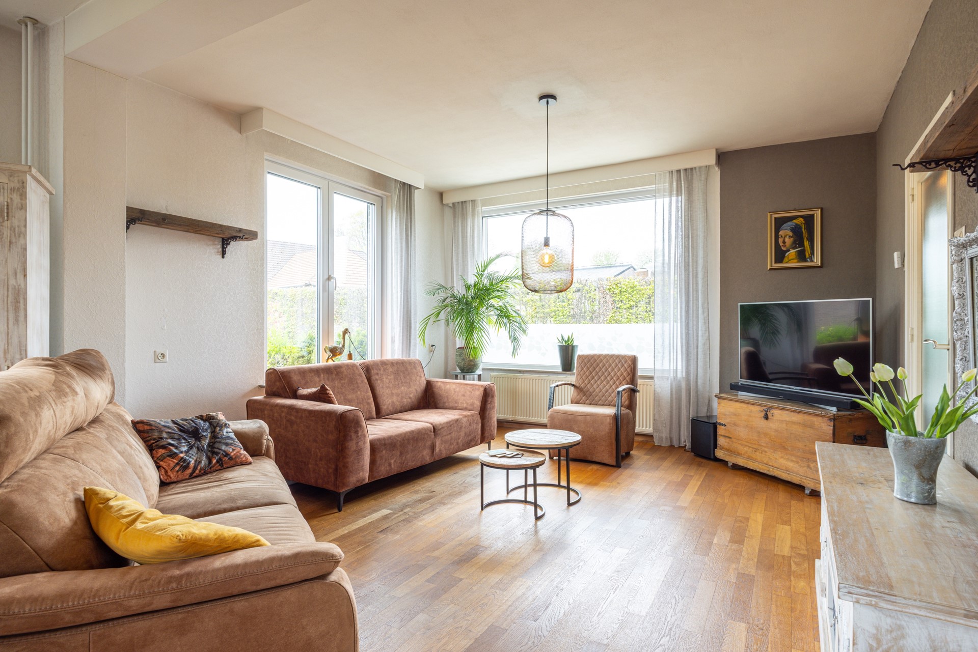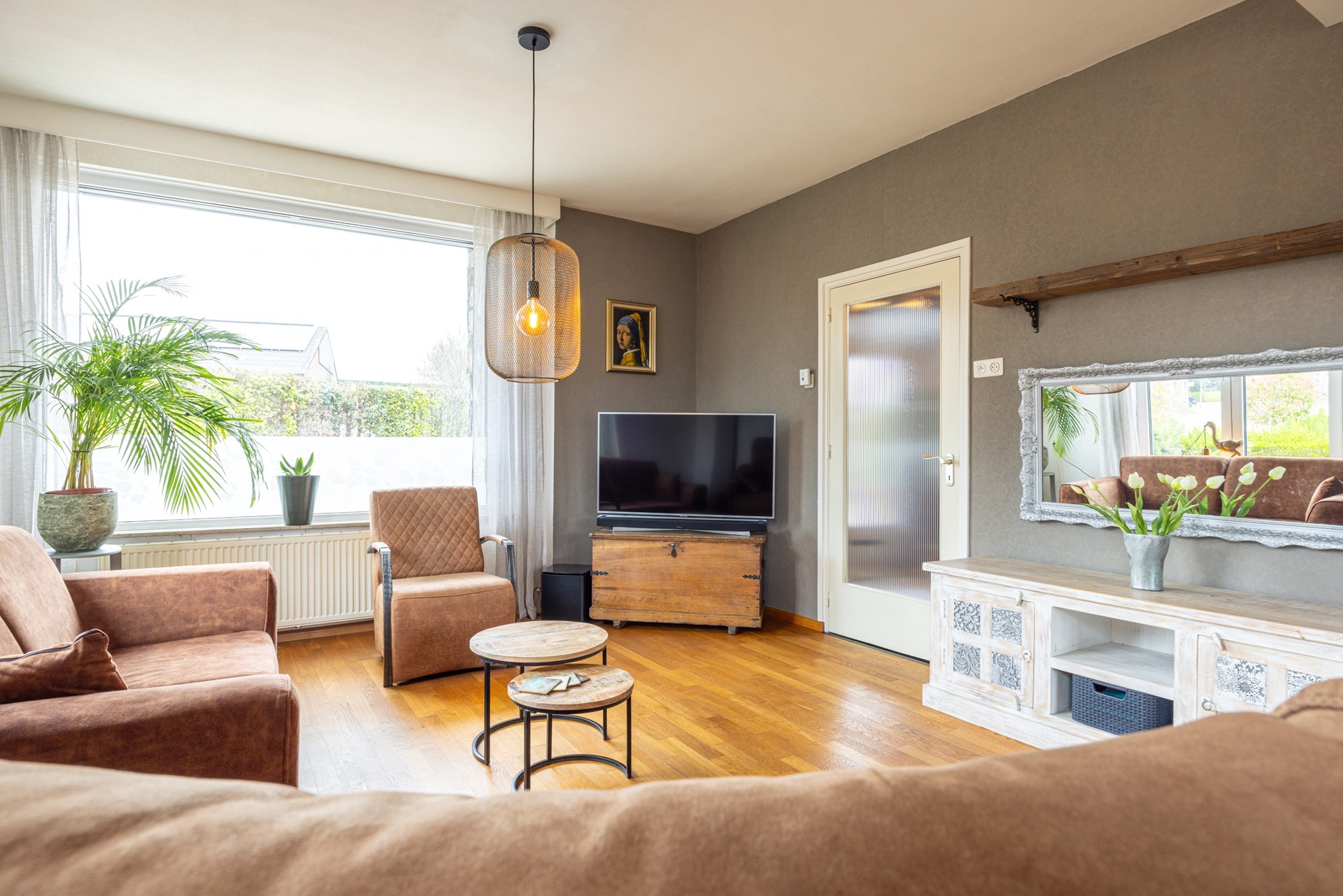 Via de verzorgde voortuin bereik je de entree van de woning, die via een trapje en een afdak toegankelijk is. Je komt binnen in de ontvangsthal met een tegelvloer, waar zich het toilet en de trapopgang naar de eerste verdieping bevinden. Vanuit de hal loop je door naar de woonkamer. Deze ruimte is royaal opgezet en valt direct op door de hoeveelheid daglicht die via de grote raampartijen naar binnen komt. De warme parketvloer geeft het geheel een prettige uitstraling en vormt een mooie basis voor verschillende indelingsmogelijkheden met een zit- en eetgedeelte.